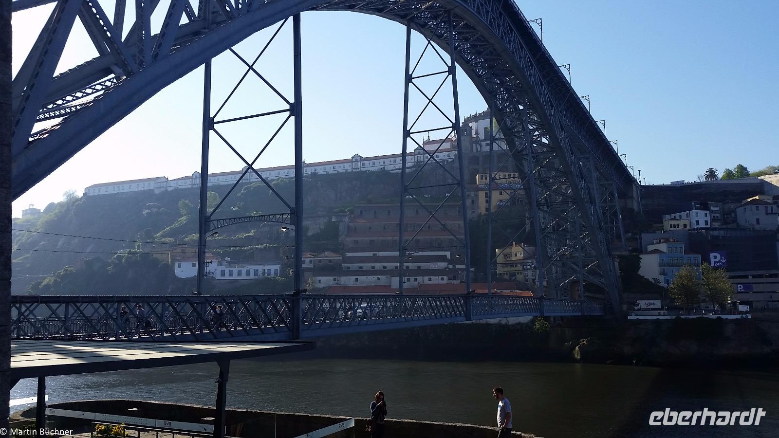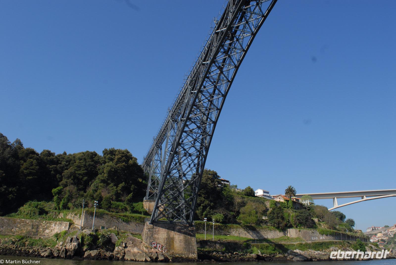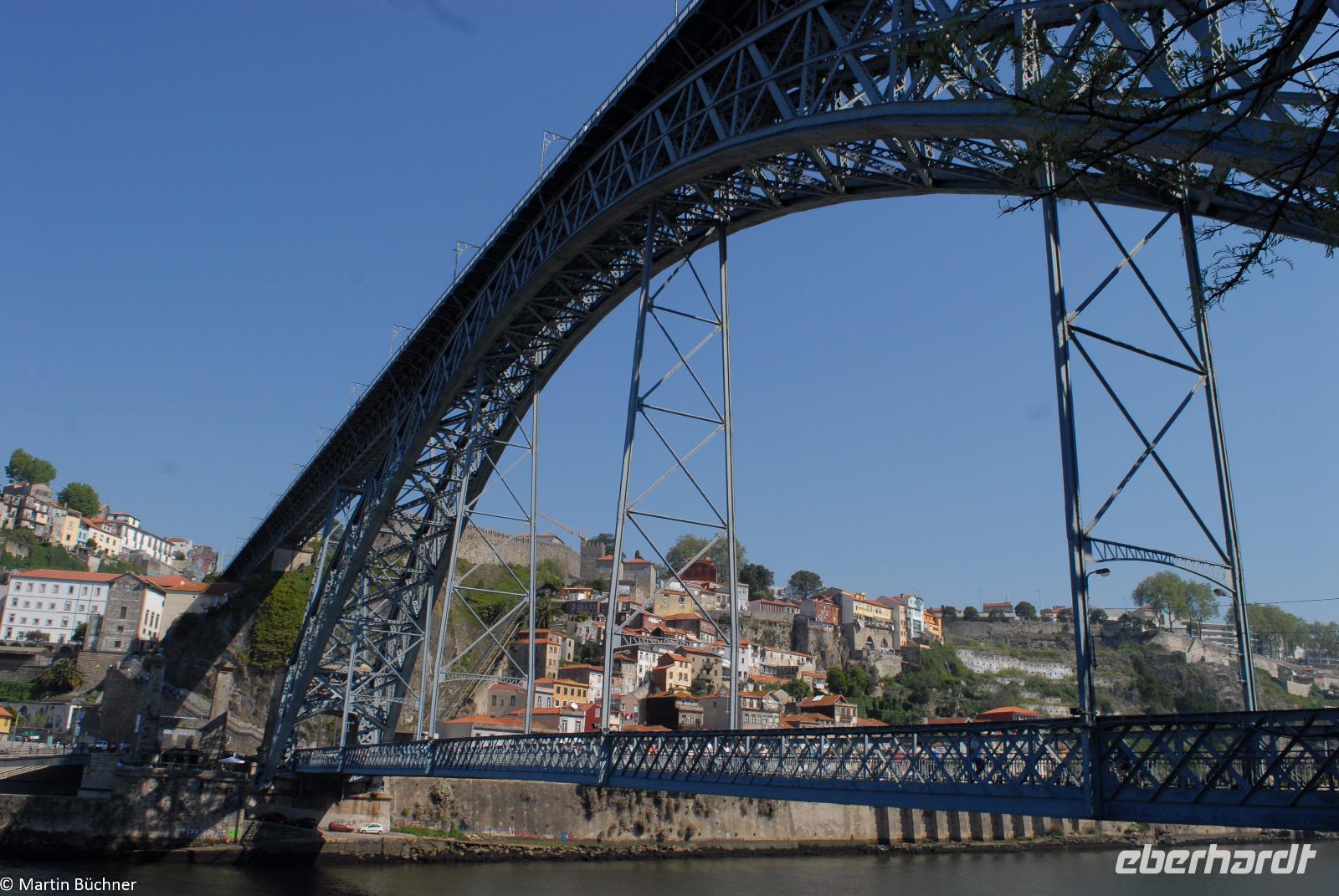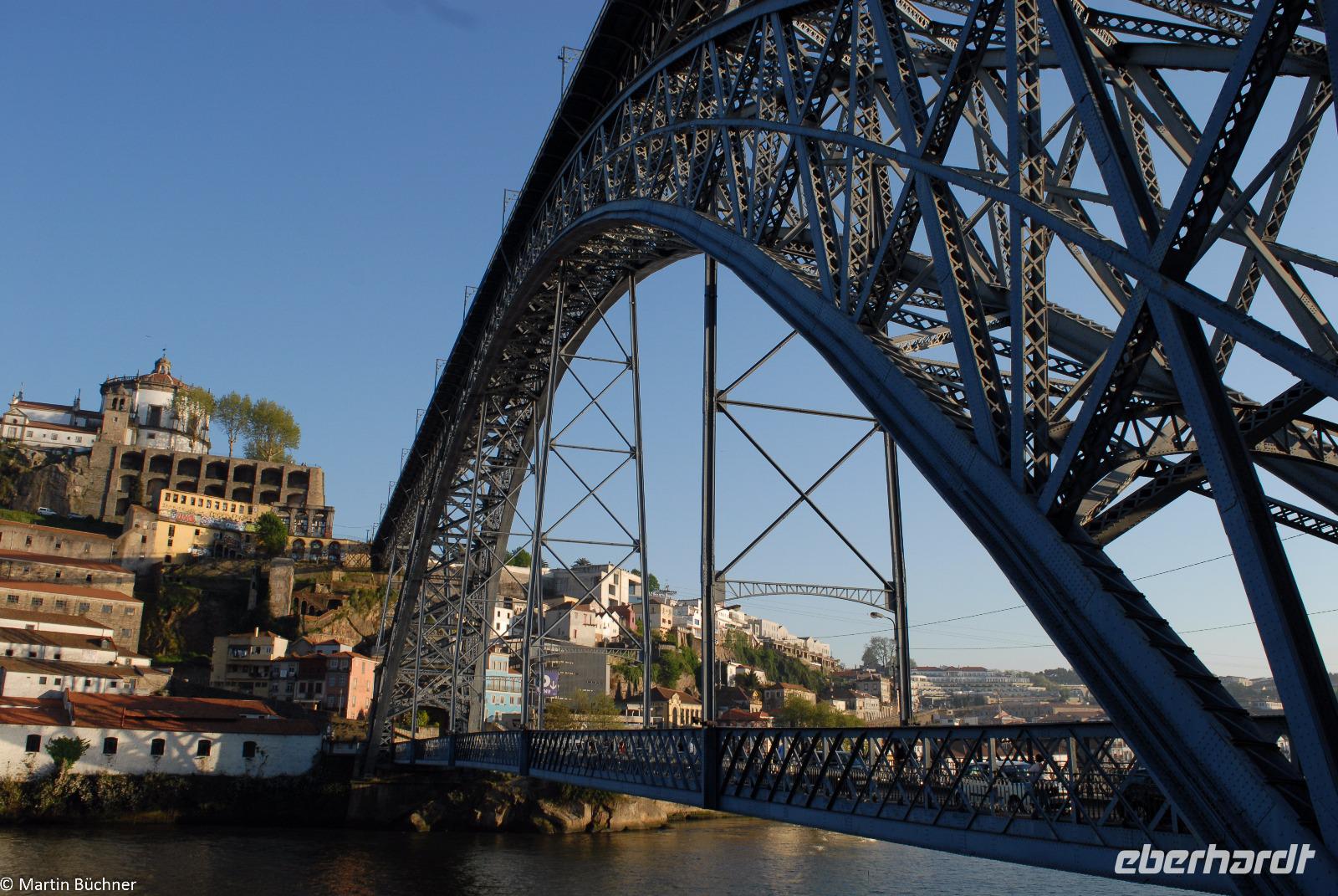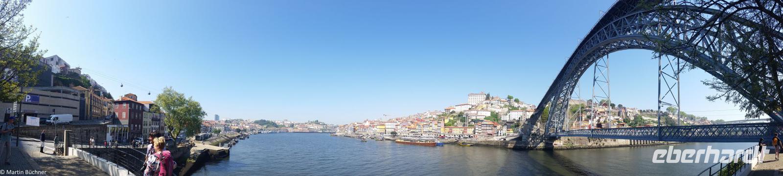 Wir möchten uns die Szenerie heute von der Flussseite her anschauen. Mit einem, den traditionellen Portwein-Booten nachempfundenen Schiff fahren wir zunächst ein Stück flussaufwärts. Dann bewegen uns wir uns unter den fünf riesigen Brücken hindurch bis fast zur Mündung des Flusses.