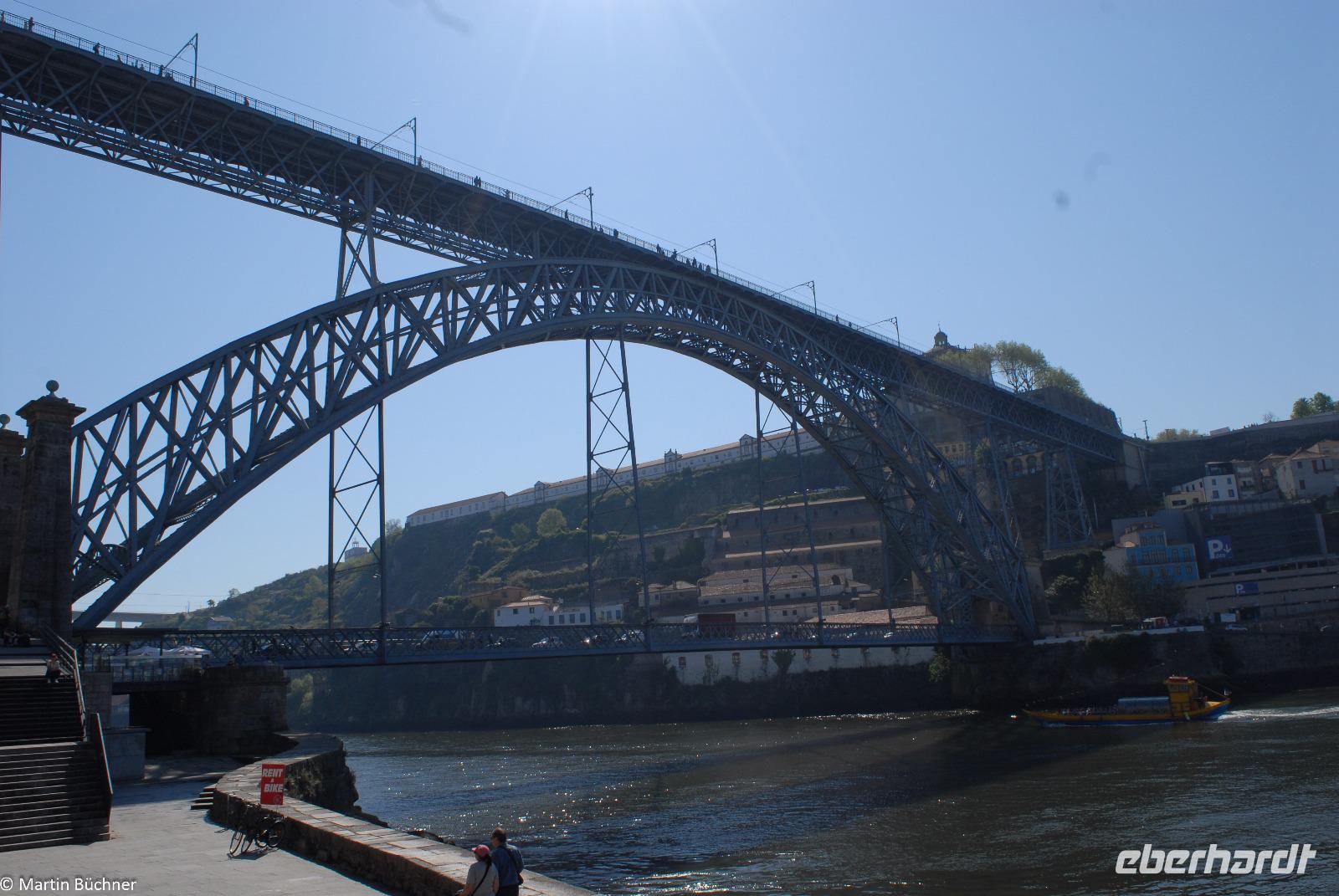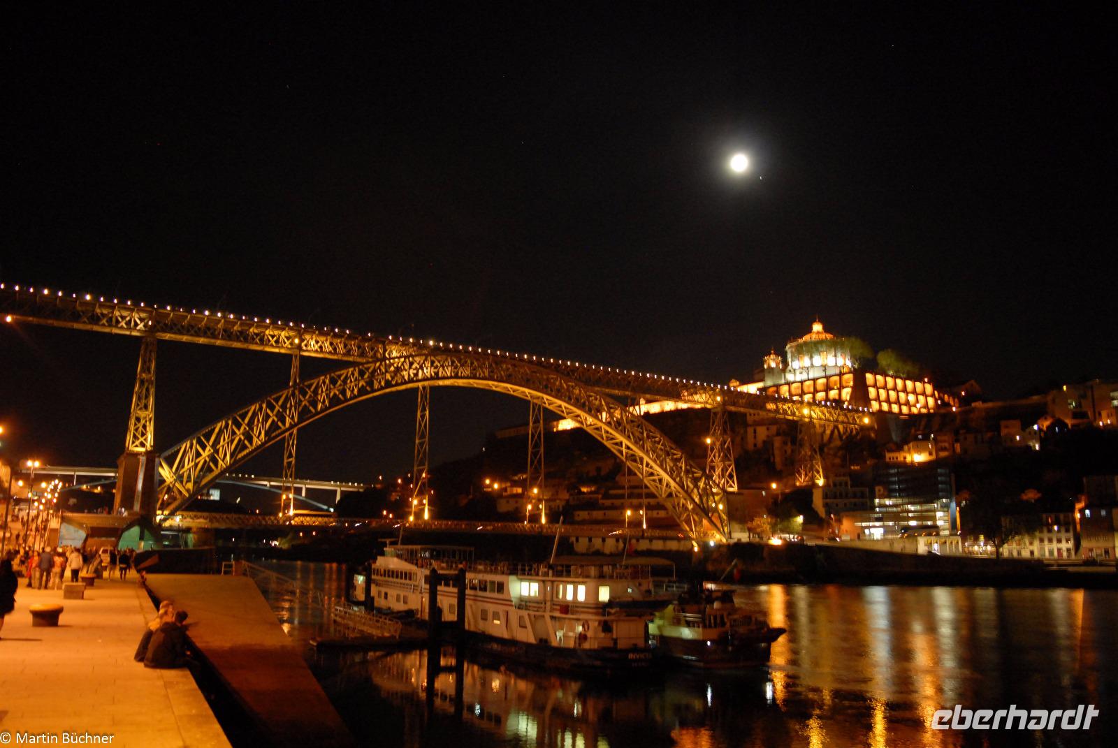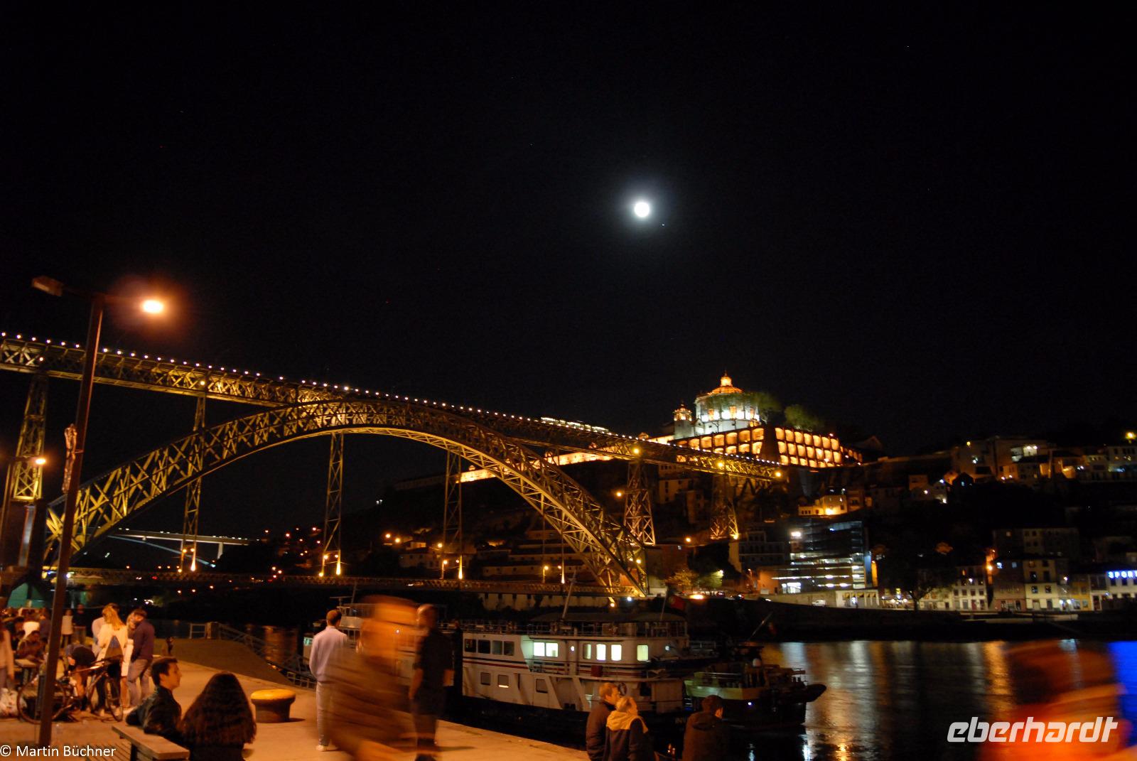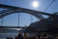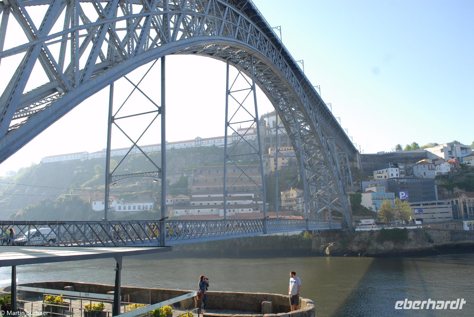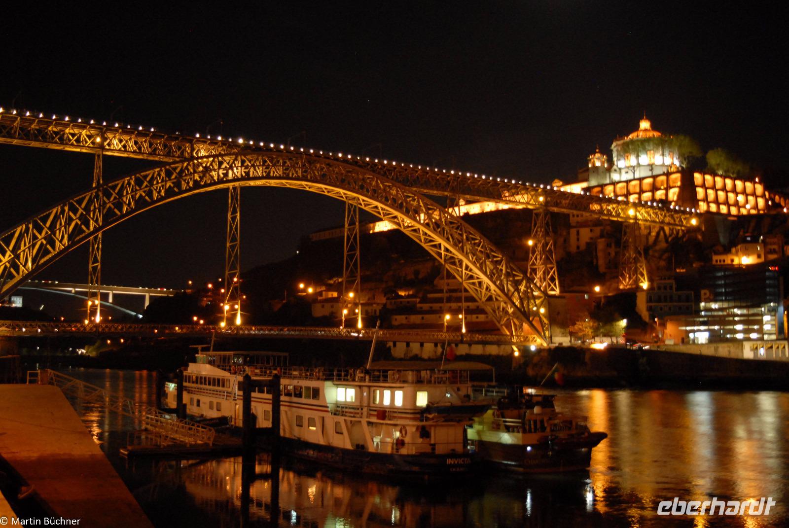 Wir möchten uns die Szenerie heute von der Flussseite her anschauen. Mit einem, den traditionellen Portwein-Booten nachempfundenen Schiff fahren wir zunächst ein Stück flussaufwärts. Dann bewegen uns wir uns unter den fünf riesigen Brücken hindurch bis fast zur Mündung des Flusses.
