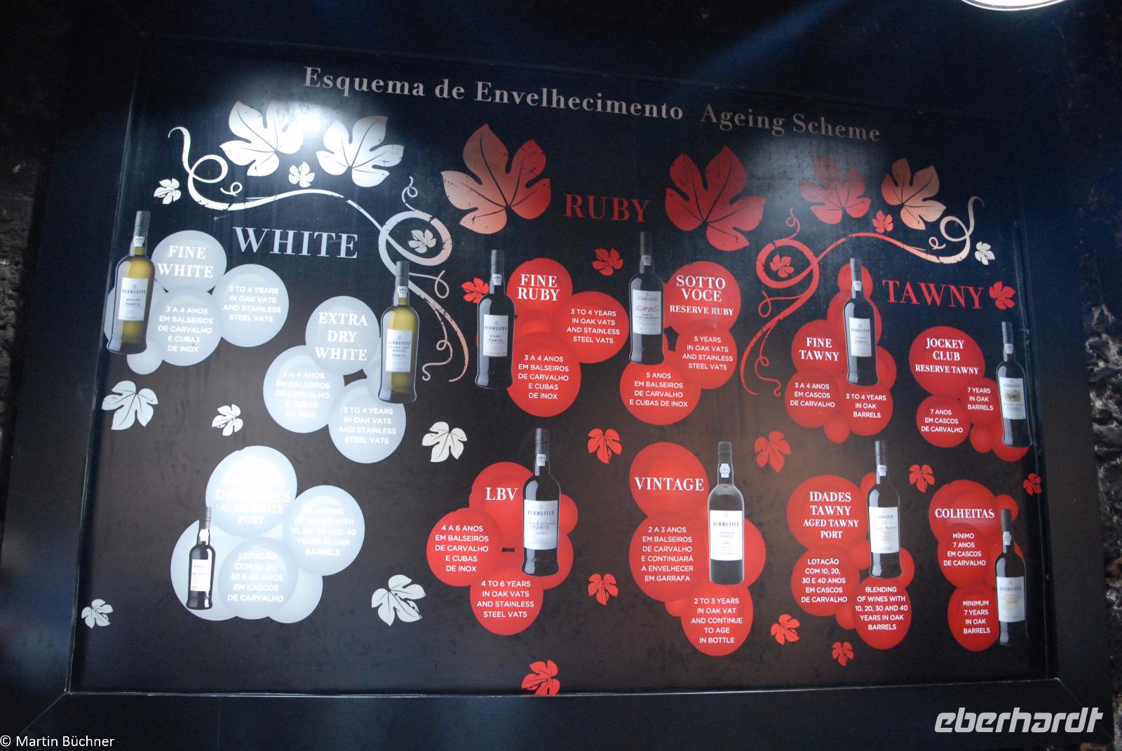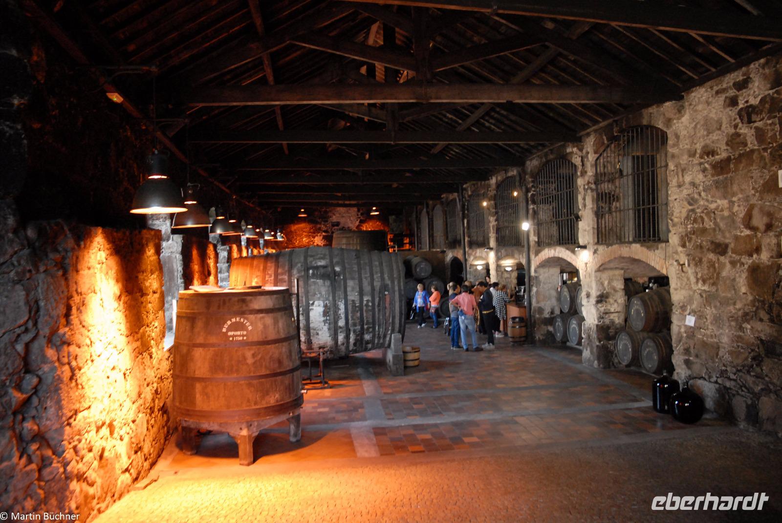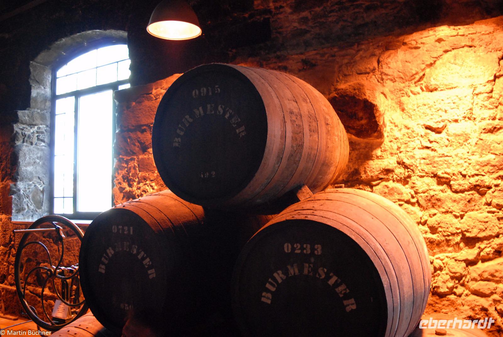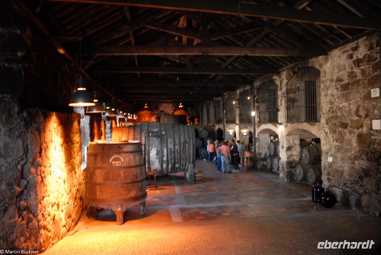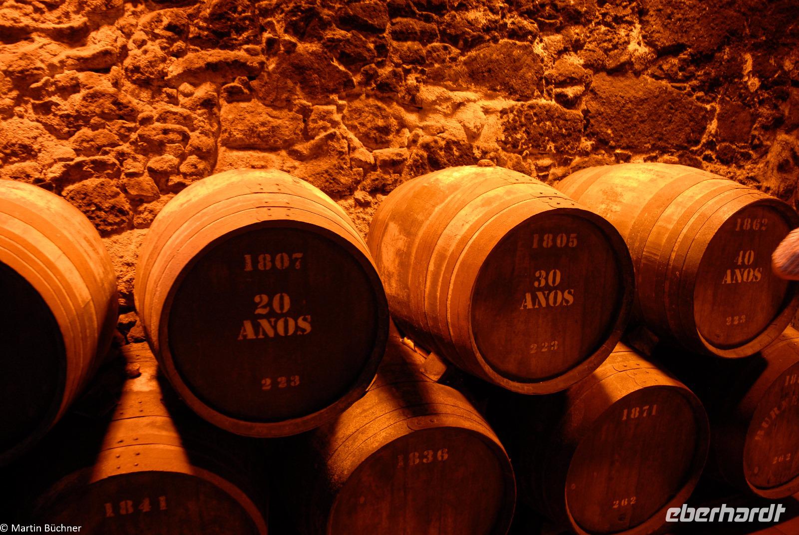 Nach gut einer Stunde sind wir zurück am Ausgangspunkt. Zu Fuß gehen wir über die Brücke Ponte Dom Luís I. hinüber nach Vila Nova de Gaia. Das Südufer des Douro ist aufgrund seiner Geografie deutlich schattiger und damit kühler als der Südhang der Nordseite des Flusses. Genau diese Lage macht es ideal für die vielen Portweinkellereien. Eine der vielen berühmten Kellereien heißt Burmester, der Name stammt von einem einst eingewanderten Deutschen. Bei einer Führung erfahren wir, was den Portwein von einem gewöhnlichen Wein unterscheidet. Wir erfahren viel über das streng geschützte Anbaugebebiet des Weines. Nur aus ganz bestimmten Weinsorten, die in einem fest definierten Gebiet angepflanzt werden, haben die Chance überhaupt für einen Portwein ausgewählt zu werden. Durch Hinzufügen von Neutralalkohol wird der natürliche Gärungsprozess gestoppt, diesen Prozess nennt man „Aufspriten". Der verbleibende Zuckergehalt des Weines bleibt erhalten. Je nach Zeitpunkt entstehen unterschiedliche Typen von Portwein mit einem recht hohen Alkoholgehalt zwischen 19 und 22 %.