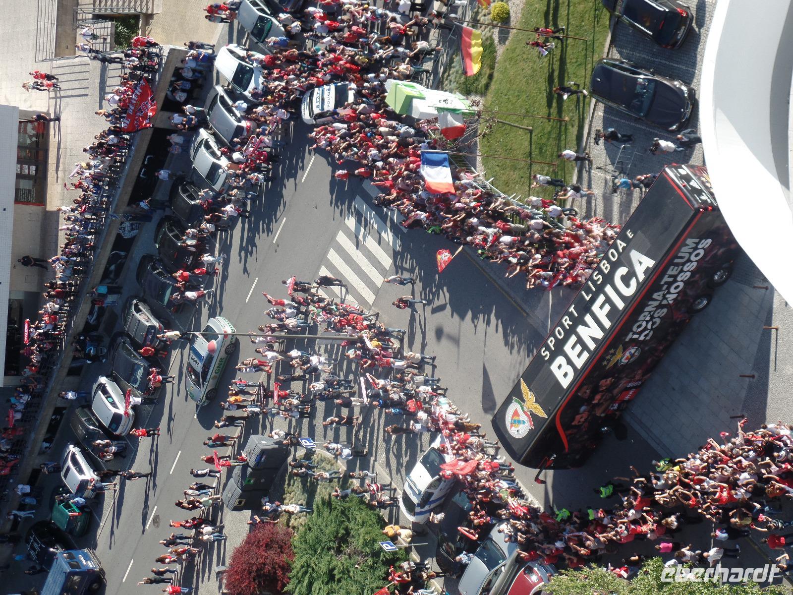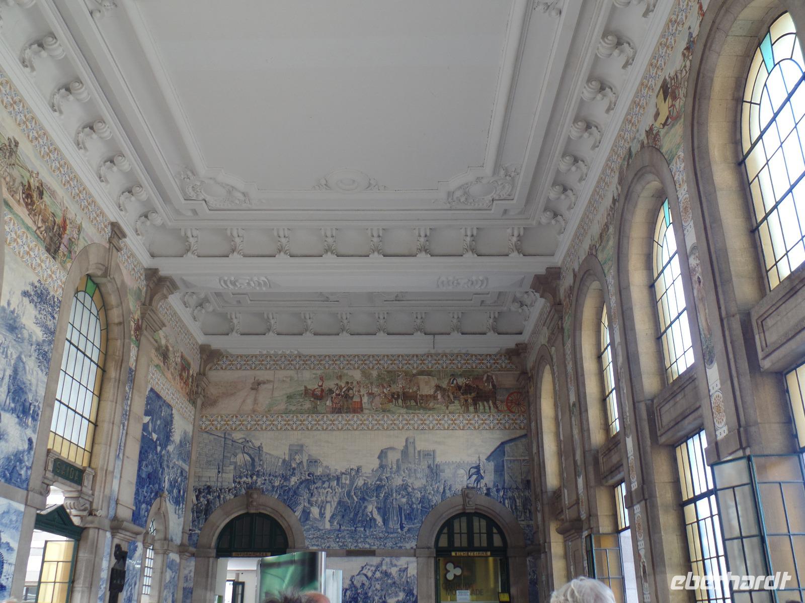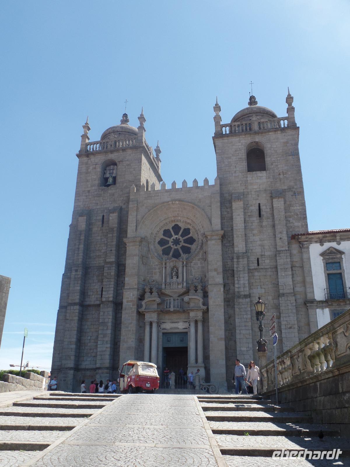 Nach einer kurzen Fahrt mit dem Bus über die Brücke Infante erreichten wir unseren Ausgangspunkt für unseren Stadtrundgang. Vom Torre dos Clerigos liefen wir durch den Parque de Lisboa bis zur Igreja das Carmelitas auf der R. do Carmo. Anschließend zeigte uns Isabel die Buchhandlung Livraria Lello. Weiter der R. Carmelitas entlang erreichten wir nach wenigen Schritten den Hauptplatz von Porto: Praca da Liberdade, mit dem Rathaus der Stadt und dem Reiterdenkmal des liberalen Königs Don Pedro IV. Isabel berichtete, wie ein Zwist zwischen den Brüdern zu einem Bürgerkrieg führte. Unser Weg führte uns weiter zur Rua de Santa Catarina. Am frühen Morgen war die prachtvolle Einkaufsstraße noch leer...im Vergleich zum Abend! Nach einem Blick in das berühmte Café Majestic schlenderten wir zum Bahnhof Sao Bento. Wir bestaunten die überwältigende Kachelkunst, die uns die Geschichte Portugals lebendig machte. Ein kurzer aber steiler Spaziergang brachte uns zur Kathedrale Sé. Hier siedelten vor mehr als 2000 Jahren die ersten Menschen und die Stadt entwickelte sich hinab zum Ufer des Flusses. Wir nahmen den Weg zum Ufer durch den Stadtteil Sé und liefen durch enge Gassen, sahen wie die Menschen hier leben und genossen puren portugiesischen Flair. Bunte Wäsche flatterte im Wind an den Häuserfassaden, Blumenkübel schmückten die engen Gassen und die Balkone waren mit einem bunten Pflanzenmix ausgestattet. Schon nahte das Ende unserer gemeinsamen Stadterkundung am Börsenpalast. Am Ufer des Duoro genossen wir die Sonne bei einer kleinen Erfrischung, beobachteten das Treiben an der Ribeira und spazierten entlang des Flusses. Im Anschluss hatten wir die Gelegenheit die Stadt auf eigene Faust zu erkunden oder wir nutzten die Möglichkeit zur Rückfahrt in das Hotel.Überraschend gab es hier ein Aufgebot an Polizei und Fans, da in unserem Hotel Holiday Inn Gaia die Spieler von Benfica Lissabon übernachteten und die Fans warteten auf die Abfahrt des Mannschaftsbusses. Am Abend fuhren wir erneut an die Ribeira in das Restaurant "Chez Lapin". Hier genossen wir in gemütlicher Atmosphäre das heutige Abendessen. Neben einem Gläschen Wein wurden wir mit Salat, Schweinebraten und Obst verwöhnt. Gern hätten wir im Anschluss noch das Lichtermeer entlang des Flusses auf uns wirken lassen doch leider mussten wir zurück zum Bus und somit auch in unser Hotel.