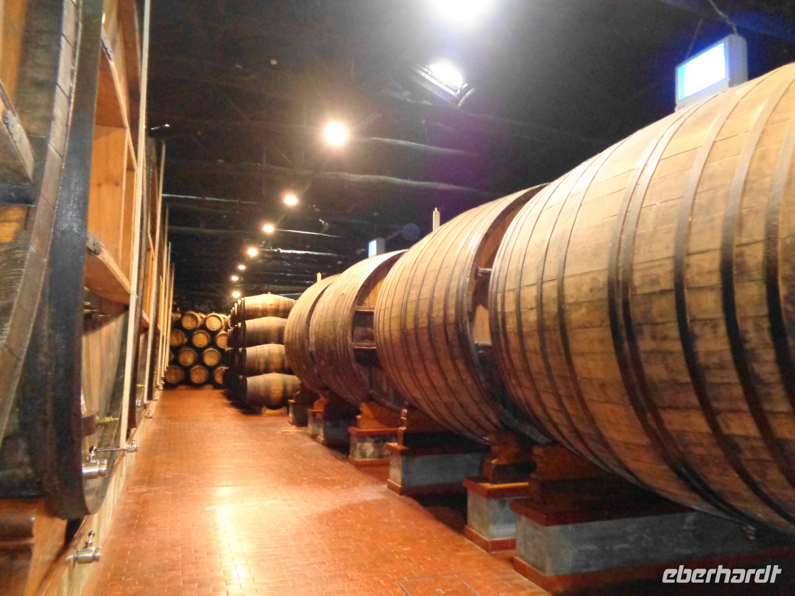 Der restliche Vormittag war für die Besichtigung einer der berühmten Weinkellereien am Südufer vorgesehen. Bei einer Führung durch die Weinkellerei „Rozès“ erfuhren wir viel Interessantes über Anbau und Herstellung des berühmten „Vinho do Porto“, der vor allem aus roten, seltener auch weißen Trauben aus dem Douro-Tal hergestellt wird. Die sogenannte „Aufspritung“ macht Wein zu Portwein. Während der Gärung wird dem Wein im Verhältnis 1 zu 4 hochprozentiger Branntwein zugefügt, um die Gärung zu stoppen. Es bleibt der Restzucker, der die Süße des Weins ausmacht. Der Alkoholwert ist mit 19-22% nicht zu unterschätzen. Je länger der Portwein in den bis zu 550 l fassenden Fässern lagert, desto besser sind Aroma und Geschmack. Die besten Weine sind die „vintage ports“. Dieses Prädikat erreichen nur herausragende Jahrgänge nach 10-50 Jahren Lagerung. Von Porto aus wurde der scheinbar ewig haltbare, süße Wein in alle Welt verschifft. Engländer, Holländer und Deutsche fanden besonderen Gefallen daran und bauten Niederlassungen im Hafenviertel von Porto. Seither ist der Handel mit Portwein in der Hand von internationalen Firmen.