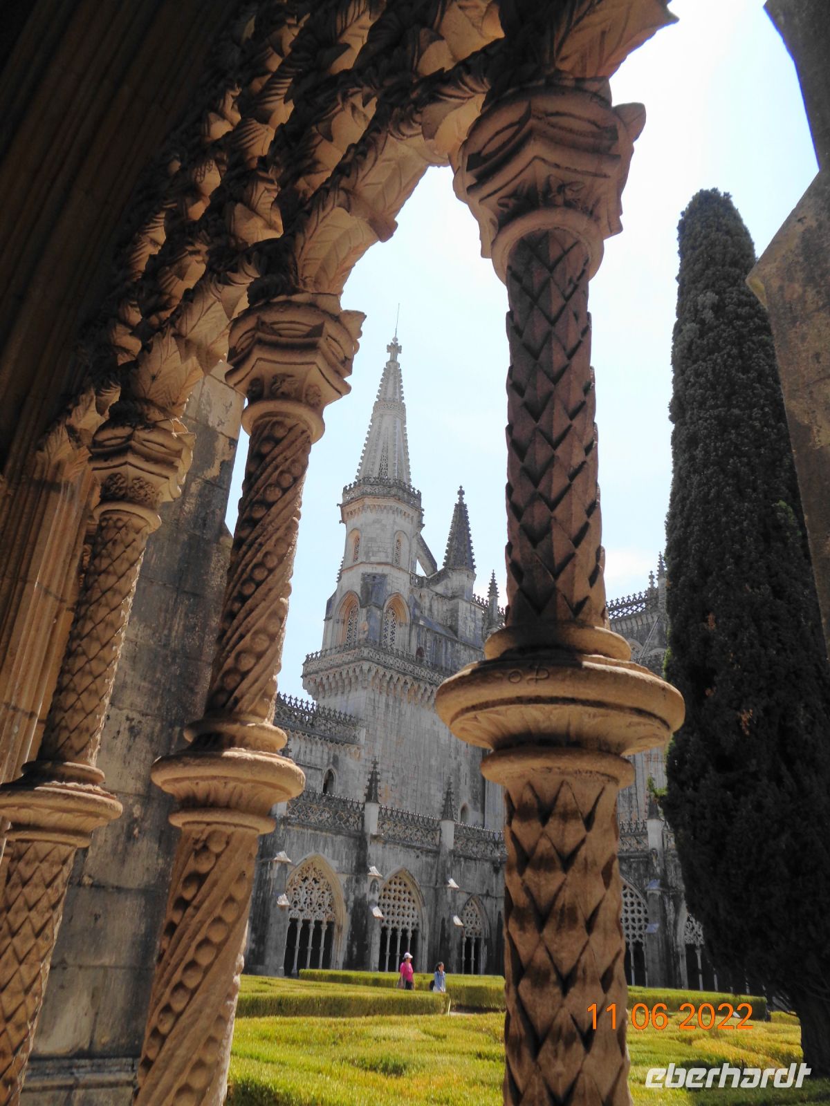 Der nächste Höhepunkt des Tages war die Besichtigung des Klosters von Batalha, das von dem späteren König von Portugal D. João im 14. Jh. anlässlich des Sieges seiner Truppen über das kastilische Heer gestiftet wurde. Das Kloster Santa Maria da Vitória, dessen Bauzeit sich über fast 200 Jahre erstreckte, gilt als eines der bedeutendsten gotischen Bauwerke der iberischen Halbinsel und ist seit 1983 Weltkulturerbe der UNESCO. Besonders beeindruckend ist der „Claustro Real“ (Königlicher Kreuzgang) mit seiner außergewöhnlich harmonischen Verbindung von gotischen und manuelinischen Stilelementen aus marmornen Blüten, die filigran wie geklöppelte Spitzen erscheinen. Selbst die Säulen sind mit vielfältigen Mustern und Perlen verziert.