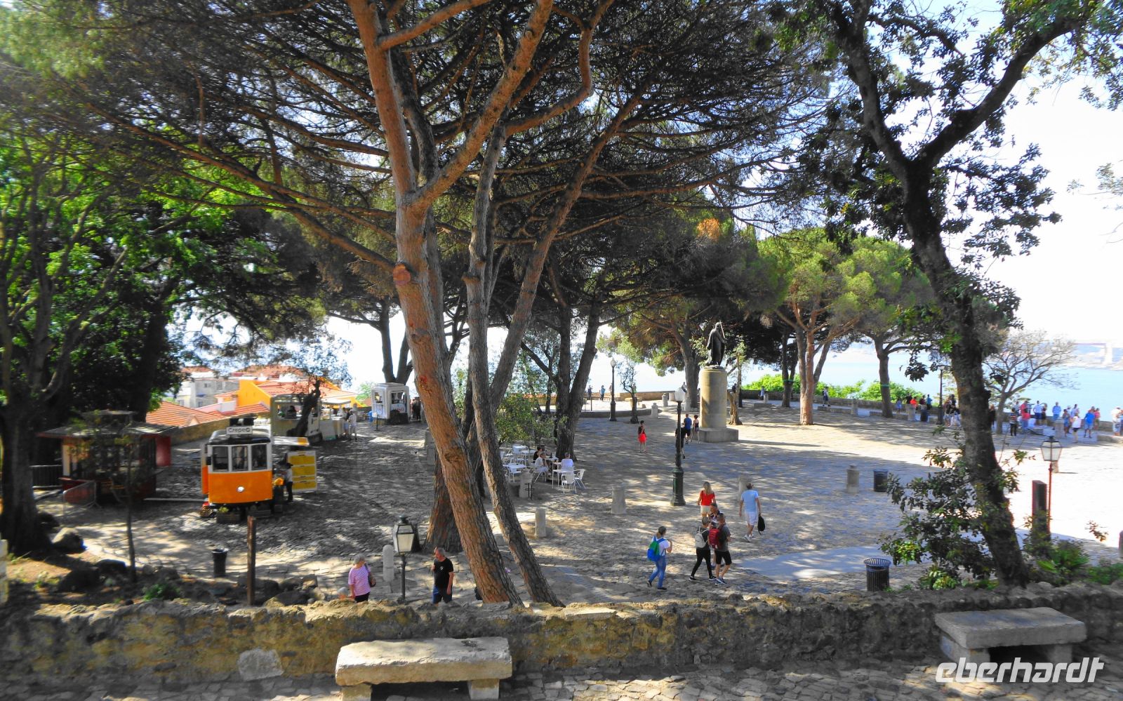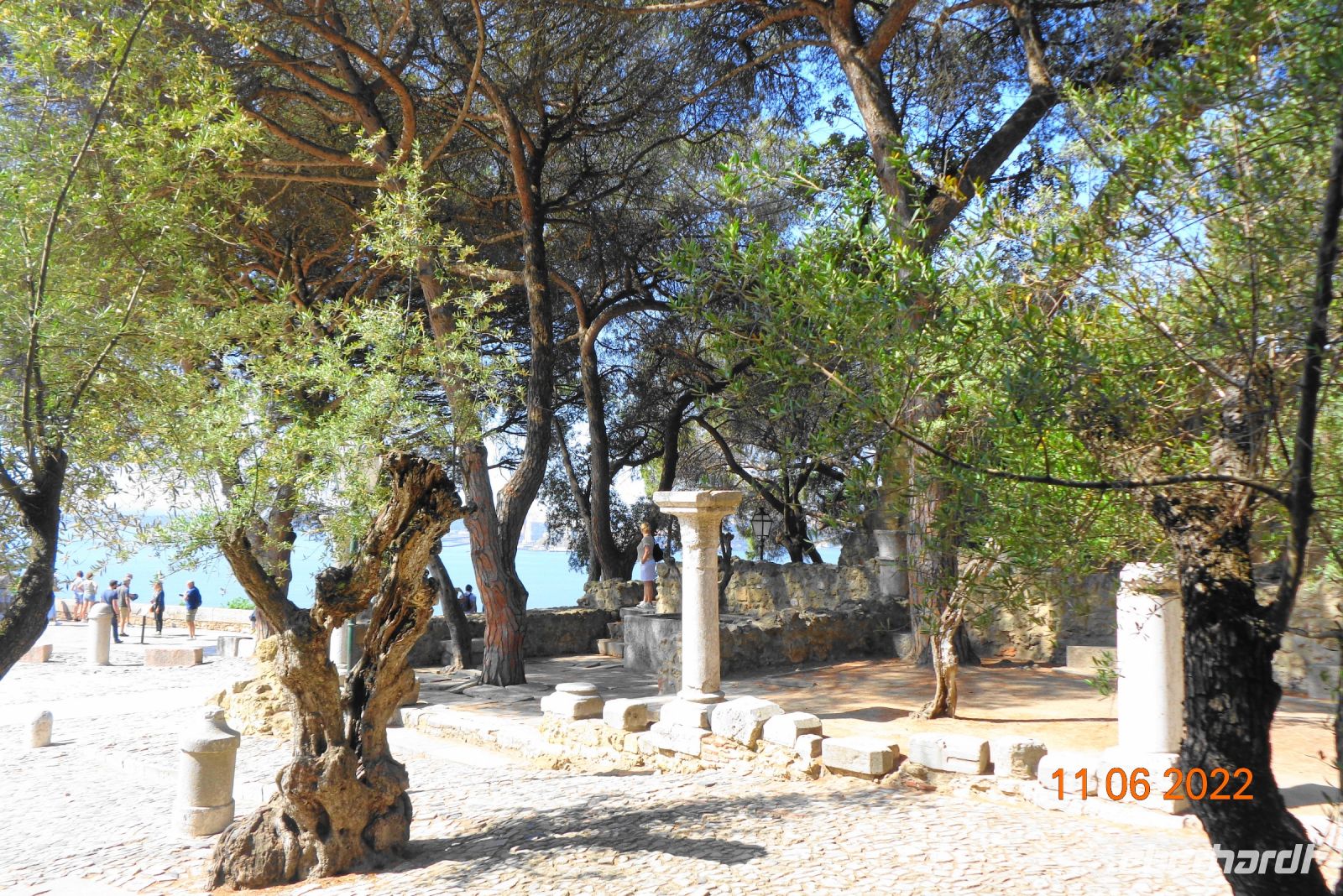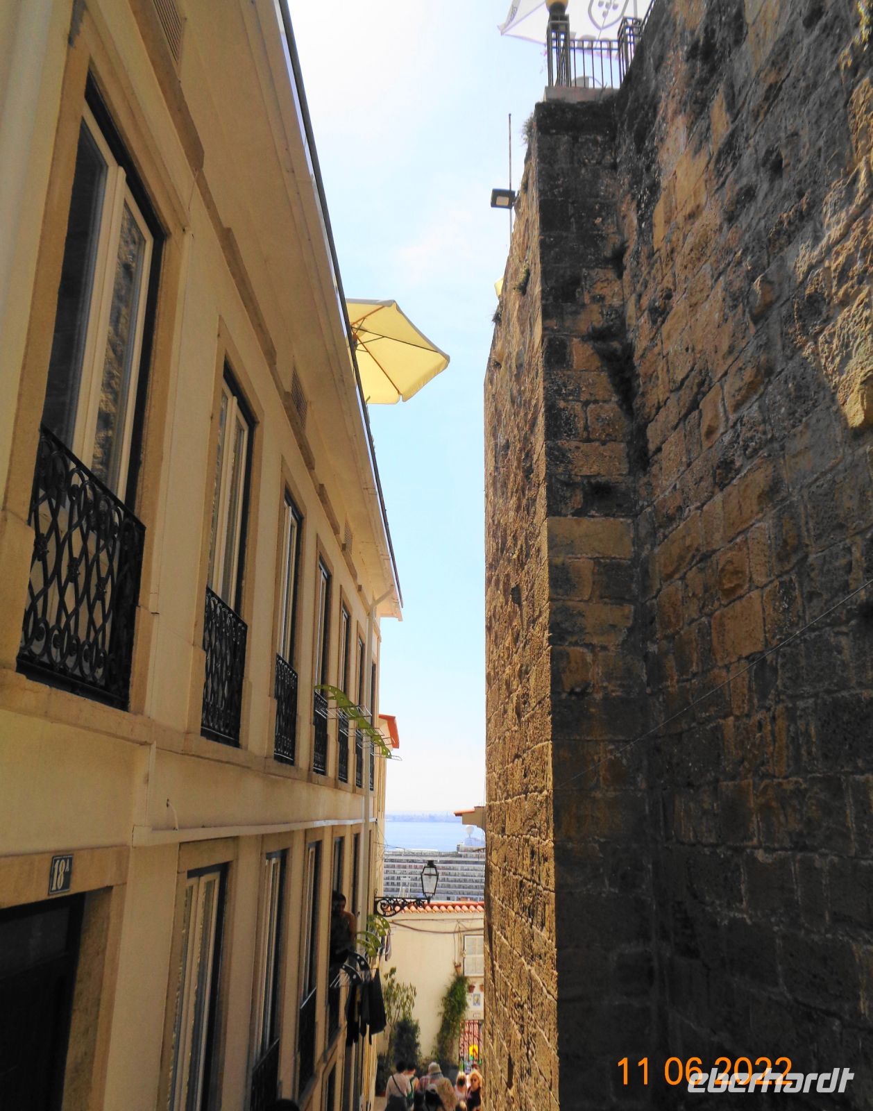 Der heutige Tag war ganz der quirligen, auf sieben Hügeln gelegenen Hauptstadt Lissabon gewidmet, die wir zu Fuß und per Bus erkundeten. Unter den fachkundigen Erläuterungen von Isabel spazierten wir an der Kathedrale vorbei die steilen Gassen der Alfama (Altstadt) hinauf zum Castelo de São Jorge (Burg) und genossen die herrlichen Ausblicke auf die Stadt und die Mündung des Tejo. Die ausladenden Pinien boten uns willkommenen Schutz vor der aufkommenden Hitze. Auf unserem Weg in die Unterstadt bekamen wir zwischen den uralten Gassen hindurch einige fotogene Aussichten auf die riesigen Kreuzfahrtschiffe, die regelmäßig tausende Tagestouristen in die Stadt schwemmen.