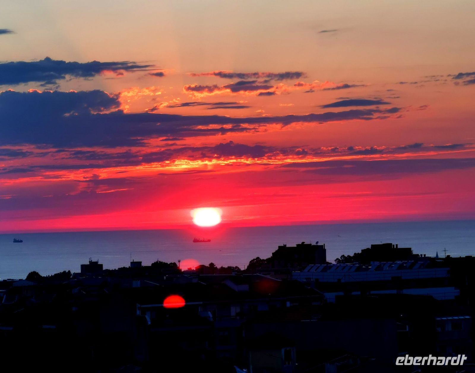 Nach dem Frühstück und einem glutroten Sonnenaufgang fahren wir wieder zu der Stelle am Douro zurück, wo wir gestern zu Abend gegessen haben. Dort wartet schon unser Boot auf uns. Simone hat bei einer nahe gelegenen Bäckerei Pasteis de nata, die typische portugiesische Leckerei bestellt und wir genießen sie auf dem Boot mit grandiosem Ausblick.
