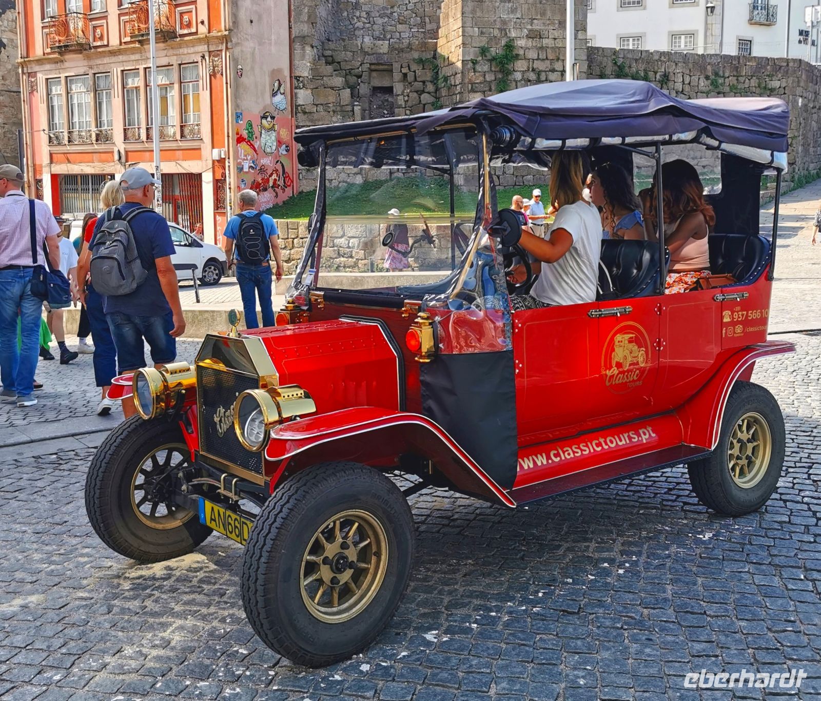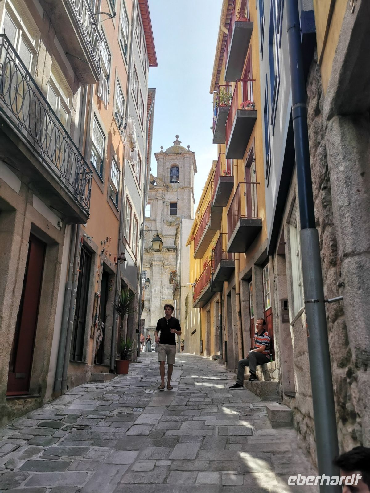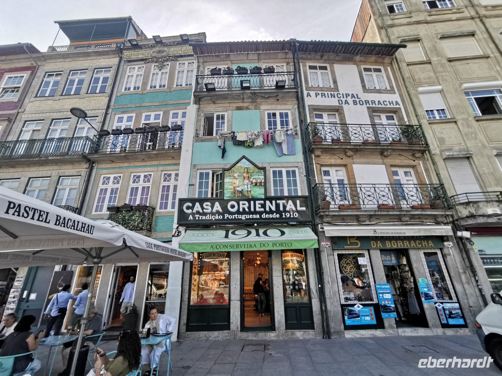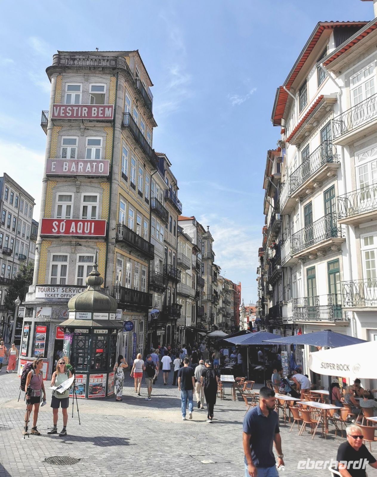 Anschließend begeben wir uns in die Altstadt von Porto, auch Ribeira genannt. Unser Spaziergang beginnt am Torre dos Clérigos, dem von Nicolau Nason errichteten Wahrzeichen der Stadt. Um den Turm herum sehen wir Straßencafés und im Casa Oriental schlägt den Damen der Gruppe das Herz höher beim Anblick der unzähligen bunten Sardinendosen, für die man stattliche 10 EUR ausgeben kann. Aber der Anblick ist einfach zu schön und solch ein Souvenir ist bei den Daheimgebliebenen beliebt.