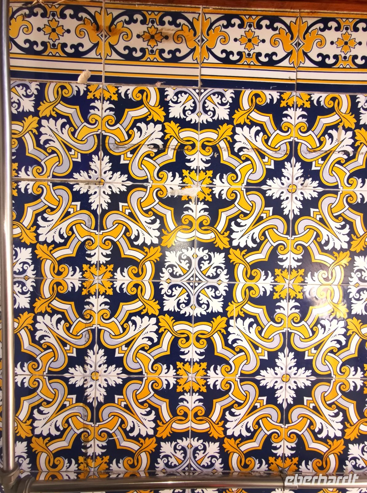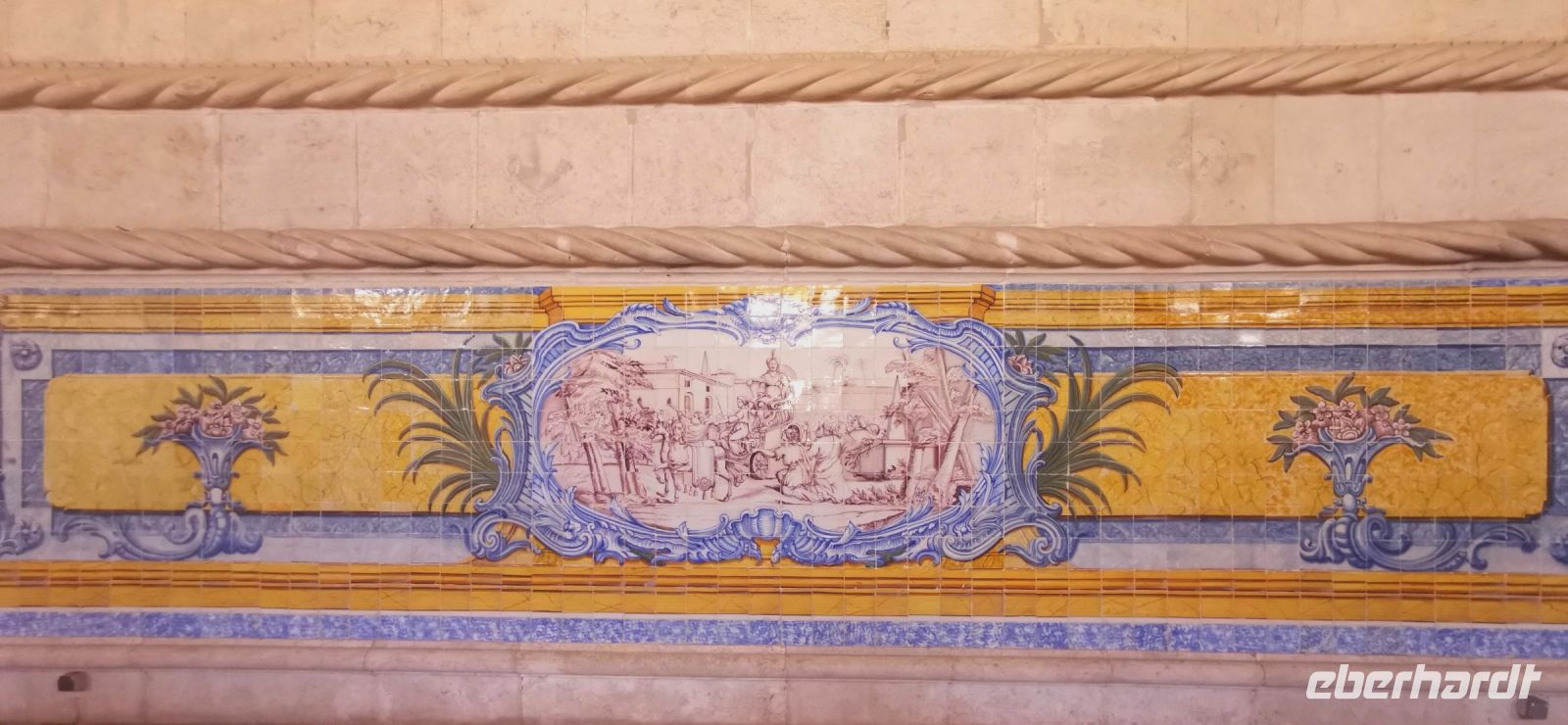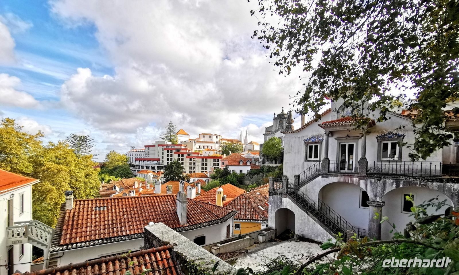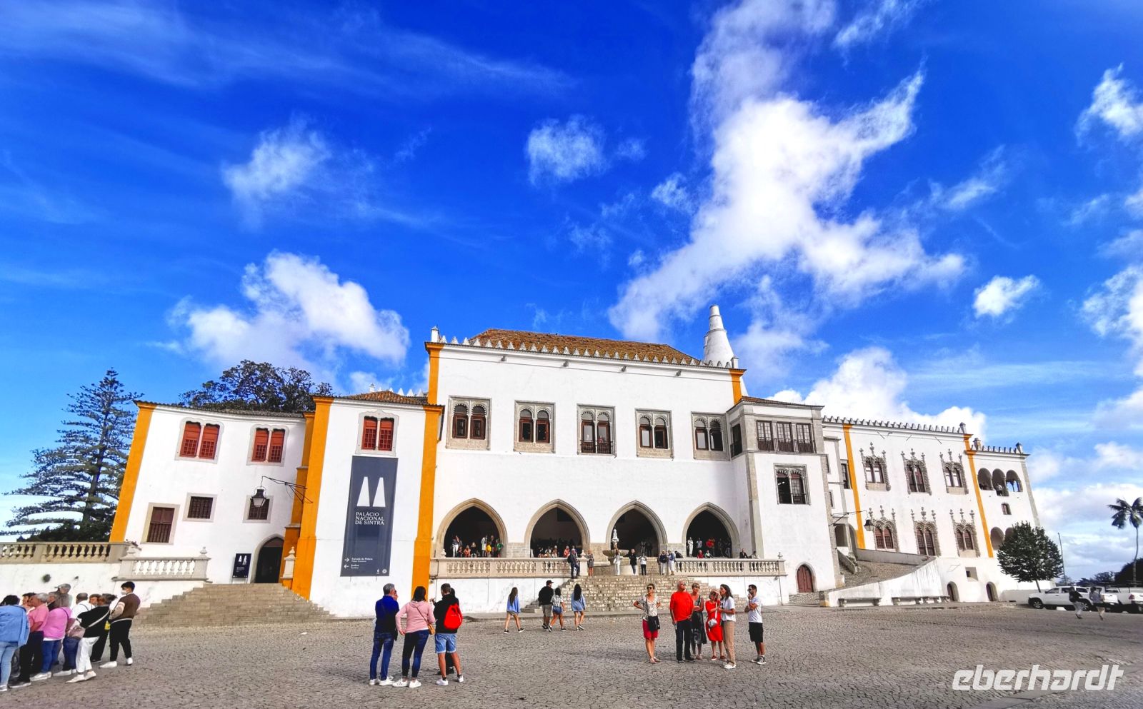 Den Nationalpalast von Sintra, der das Wahrzeichen der kleinen Gemeinde ist, besuchen wir zusammen mit Isabel. Er ist ein einzigartiges Beispiel mittelalterlicher Königspaläste in Portugal. Der heutige Bau ist eine Kreation König Joao I., der ihn wieder aufbaute, und König Manuel I., der ihn erweitern ließ und einen neuen Flügel schuf. Das Innere des Palacios spiegelt mit seinen verschiedenen Stilrichtungen und der überaus kostbaren Ausstattung die unterschiedlichen Geschmäcker der hier lebenden Könige wider. So bewundern wir die Decke im Schwanensaal, den Wappensaal, die Elsternhalle und die Kapelle des Palastes. Im Palast kann der kachelinteressierte Gast die Entwicklung der Fliesenkunst in Portugal studieren. Am Anfang standen wohl die hispano-arabischen Azulejos, die noch aus der Zeit Manuels stammen, bis hin zu den in weiß und blau gehaltenen Fliesenbildern, die typisch für das 18. Jahrhundert sind.