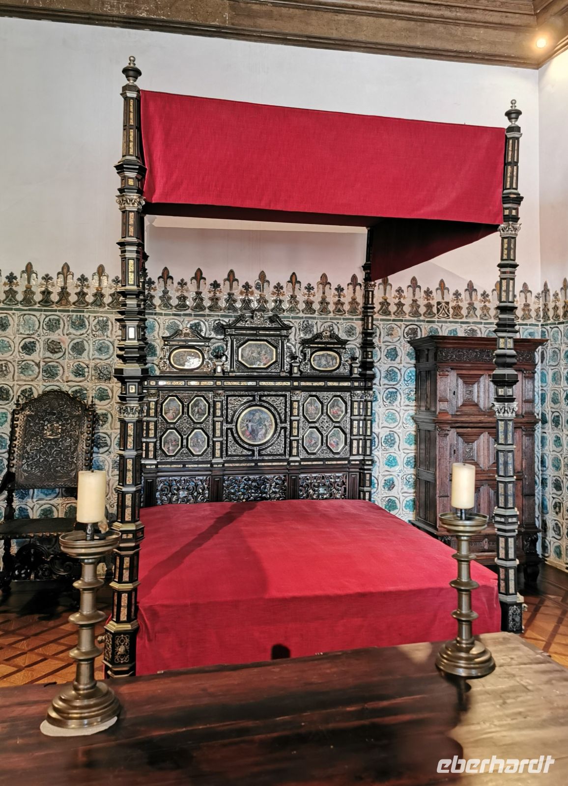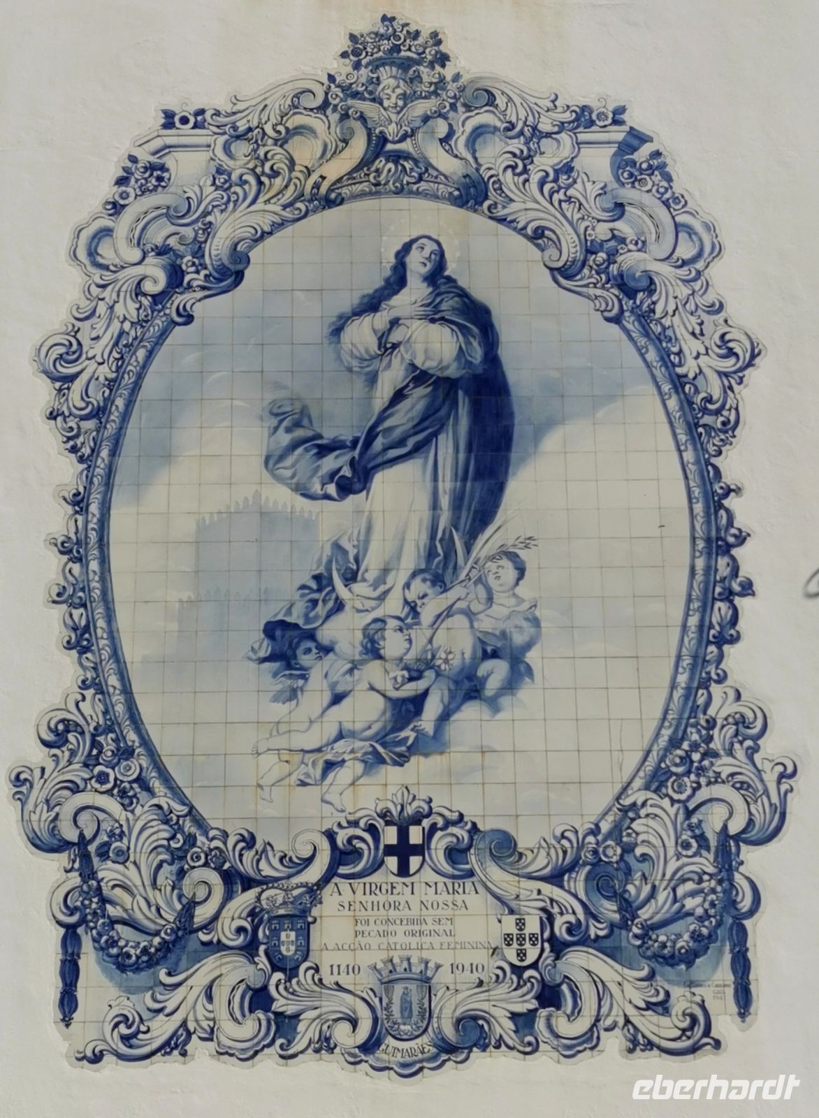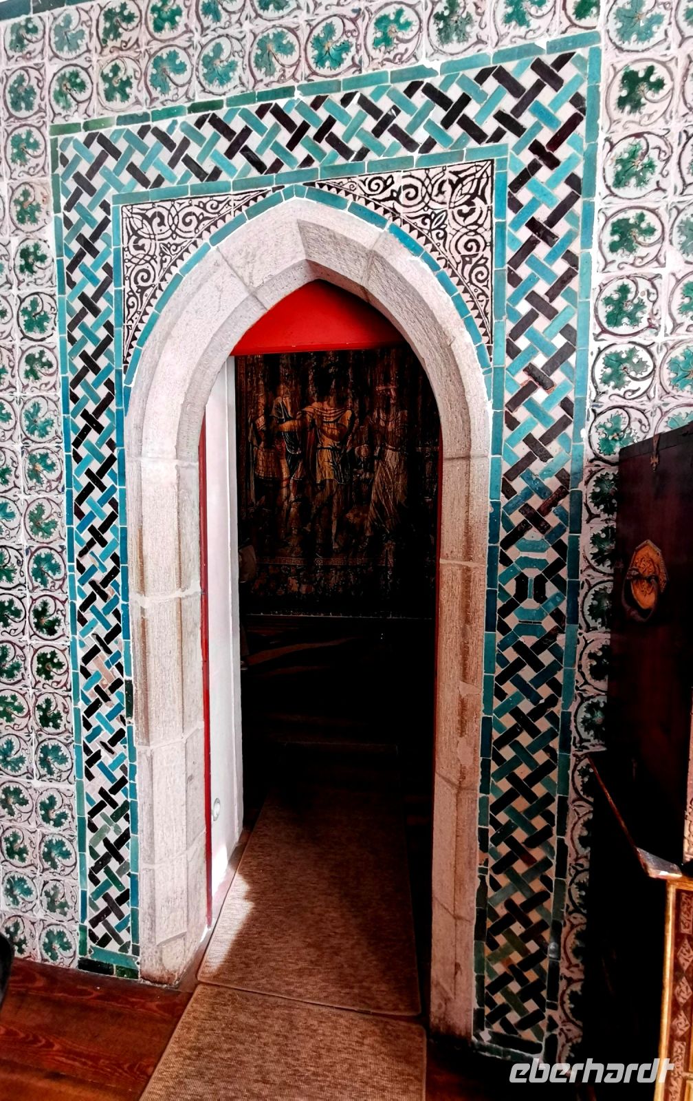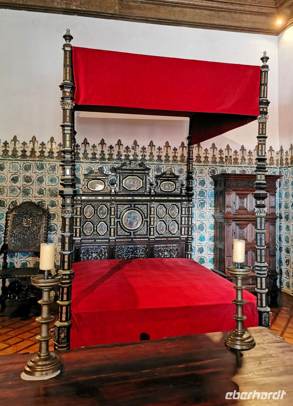 Den Nationalpalast von Sintra, der das Wahrzeichen der kleinen Gemeinde ist, besuchen wir zusammen mit Isabel. Er ist ein einzigartiges Beispiel mittelalterlicher Königspaläste in Portugal. Der heutige Bau ist eine Kreation König Joao I., der ihn wieder aufbaute, und König Manuel I., der ihn erweitern ließ und einen neuen Flügel schuf. Das Innere des Palacios spiegelt mit seinen verschiedenen Stilrichtungen und der überaus kostbaren Ausstattung die unterschiedlichen Geschmäcker der hier lebenden Könige wider. So bewundern wir die Decke im Schwanensaal, den Wappensaal, die Elsternhalle und die Kapelle des Palastes. Im Palast kann der kachelinteressierte Gast die Entwicklung der Fliesenkunst in Portugal studieren. Am Anfang standen wohl die hispano-arabischen Azulejos, die noch aus der Zeit Manuels stammen, bis hin zu den in weiß und blau gehaltenen Fliesenbildern, die typisch für das 18. Jahrhundert sind.