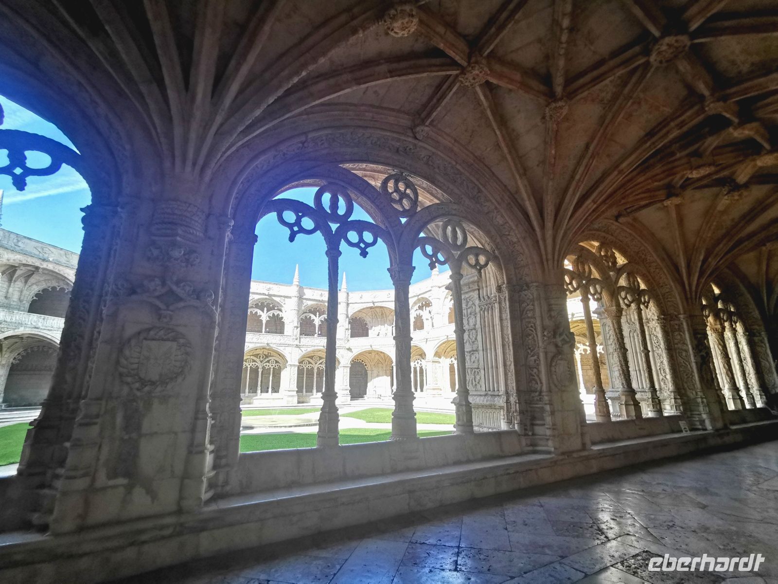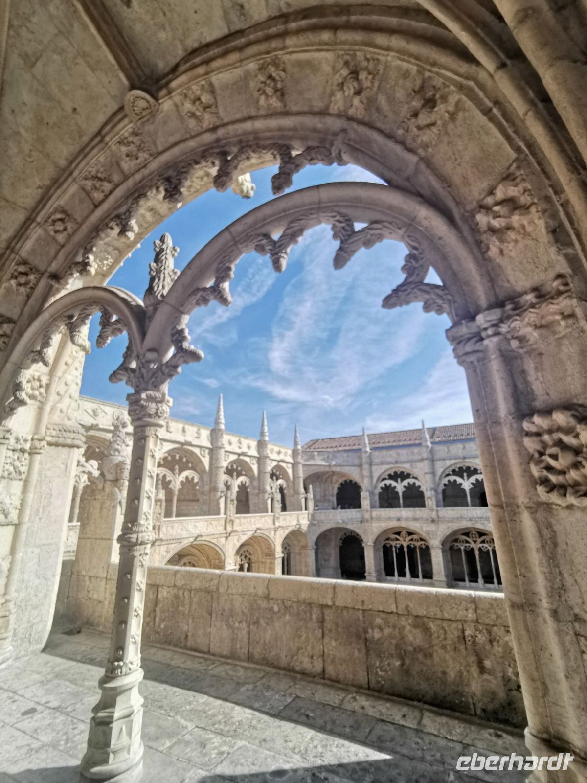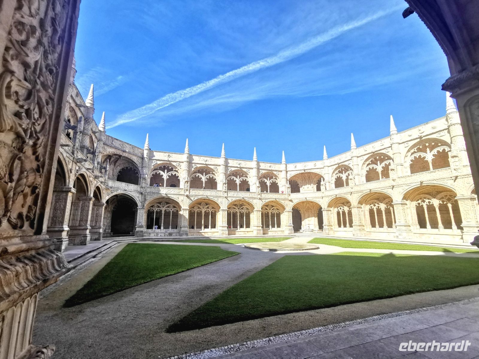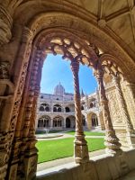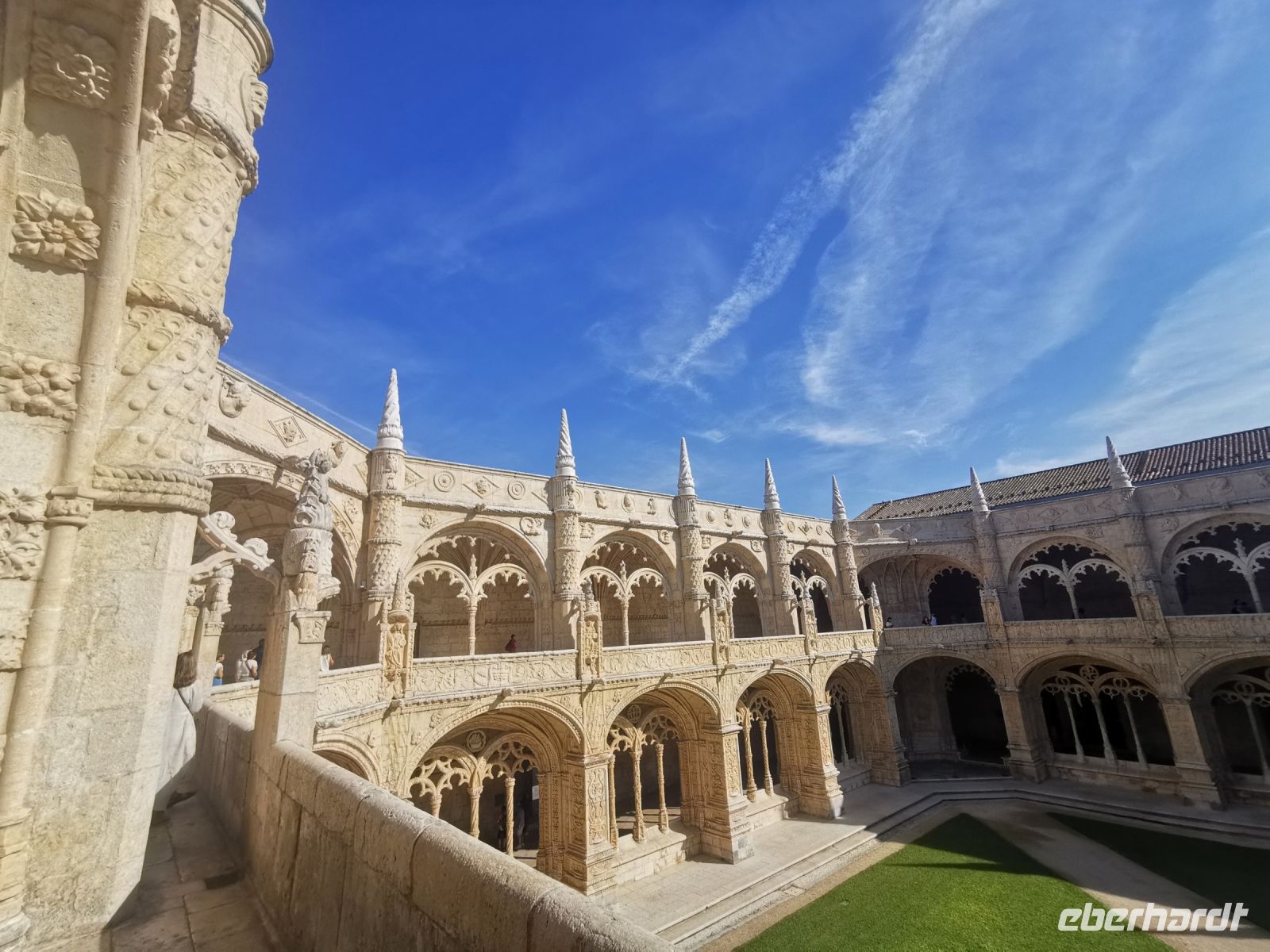 Unweit des Denkmals befindet sich auf der anderen Seite der Straße das berühmte Mosteiro dos Jerónimos, ein spätgotisches Kloster mit einer reich verzierten Fassade. Der beeindruckende Komplex ist 300 Meter lang und schneeweiß. In diesem Kloster sind viele der wichtigsten Portugiesen beigesetzt, darunter Vasco da Gama, Fernando Pessoa, Luis de Camoes und eine ganze Reihe portugiesischer Könige. Das aus dem 16. Jahrhundert stammende Hieronimuskloster ist ein beeindruckendes Beispiel manuelinischer Baukunst. Im Jahre 1502 begann man einst nach einem Entwurf des Architekten Boytac den Grundstein für das Kloster zu legen, unter anderen Baumeistern wurde der Bau fortgesetzt. Wir schauen uns die reich verzierten Kreuzgänge, die Kirche und die Grabmäler an.