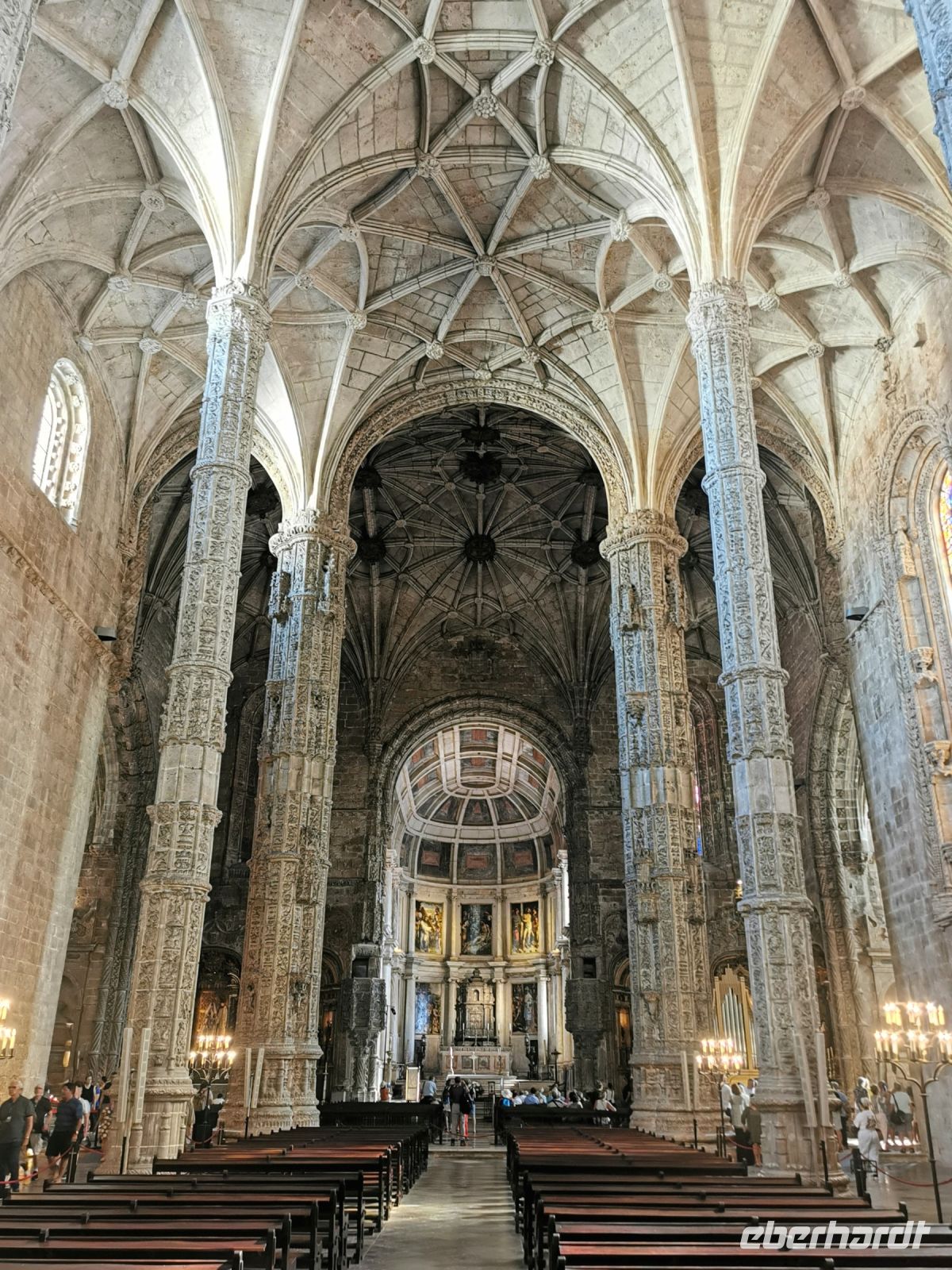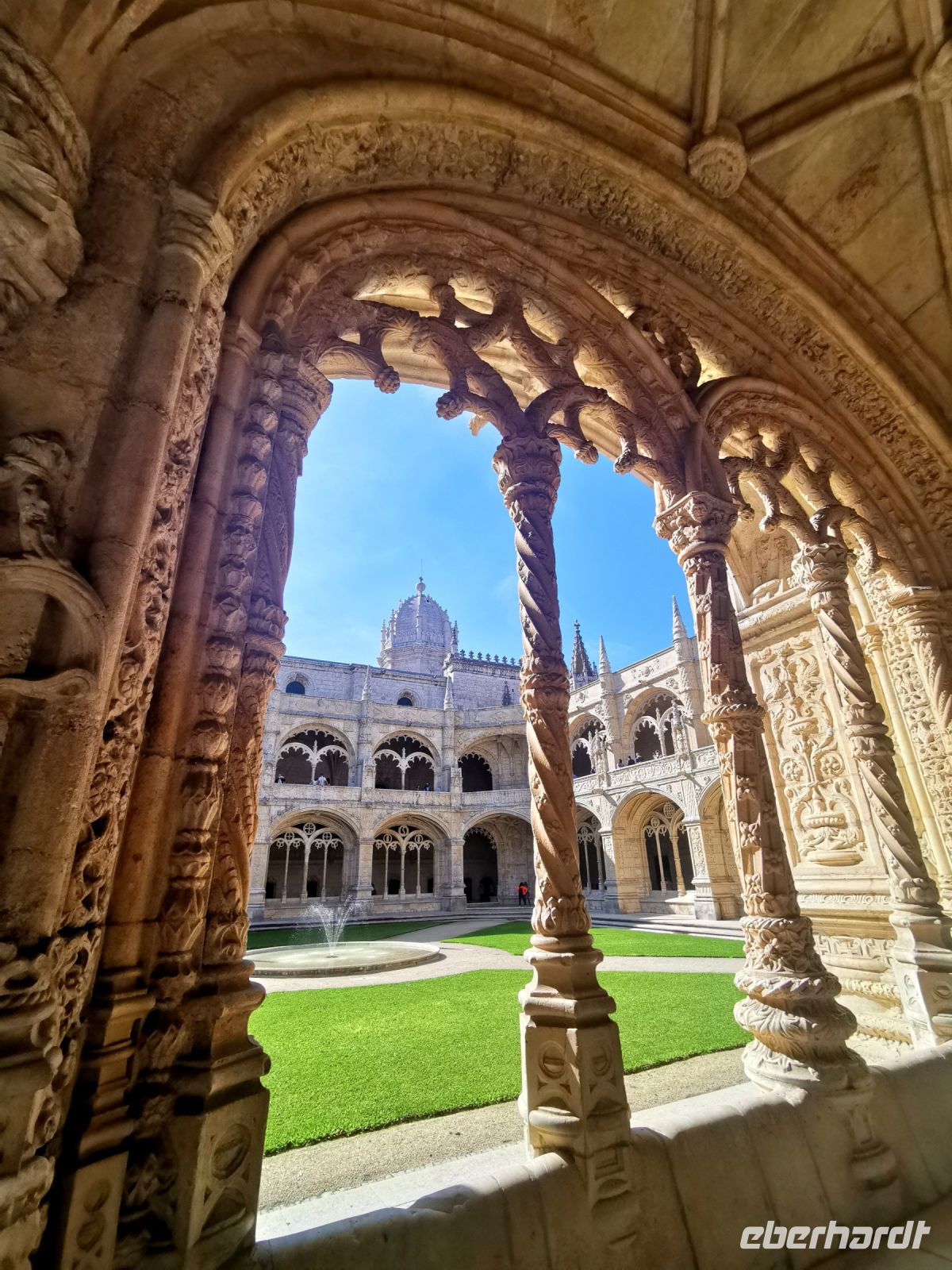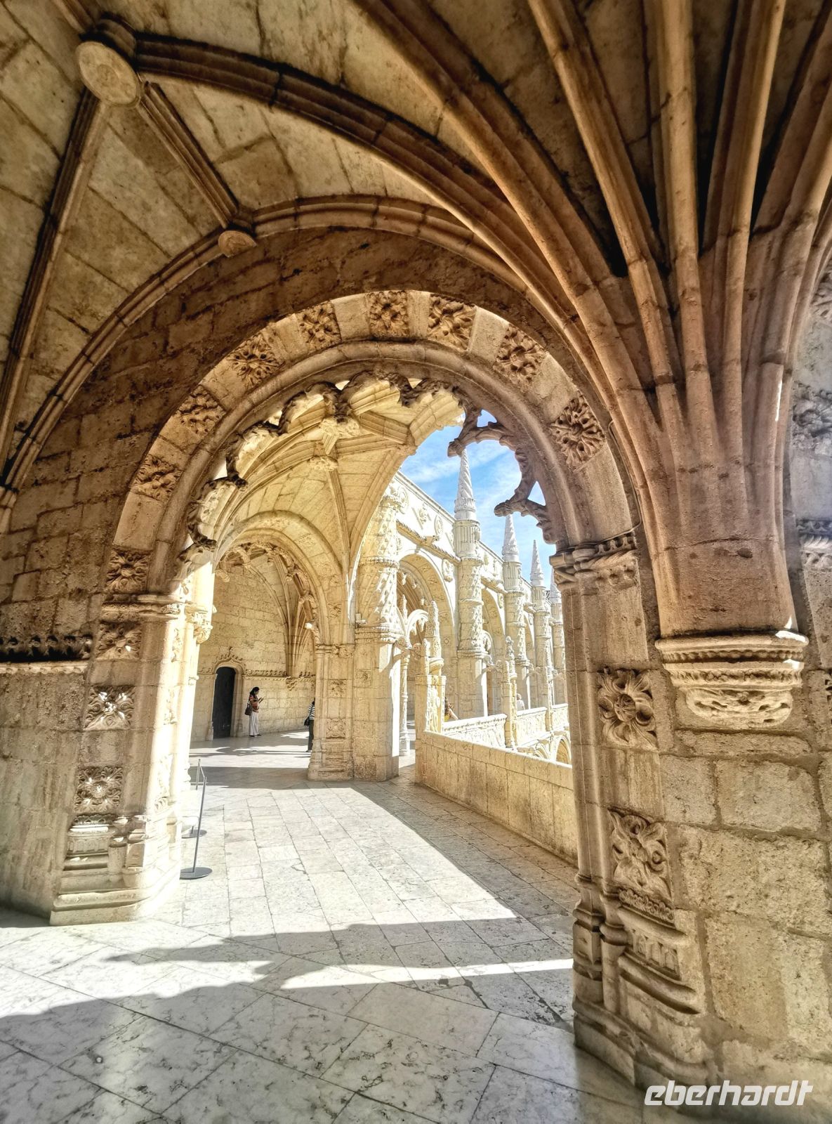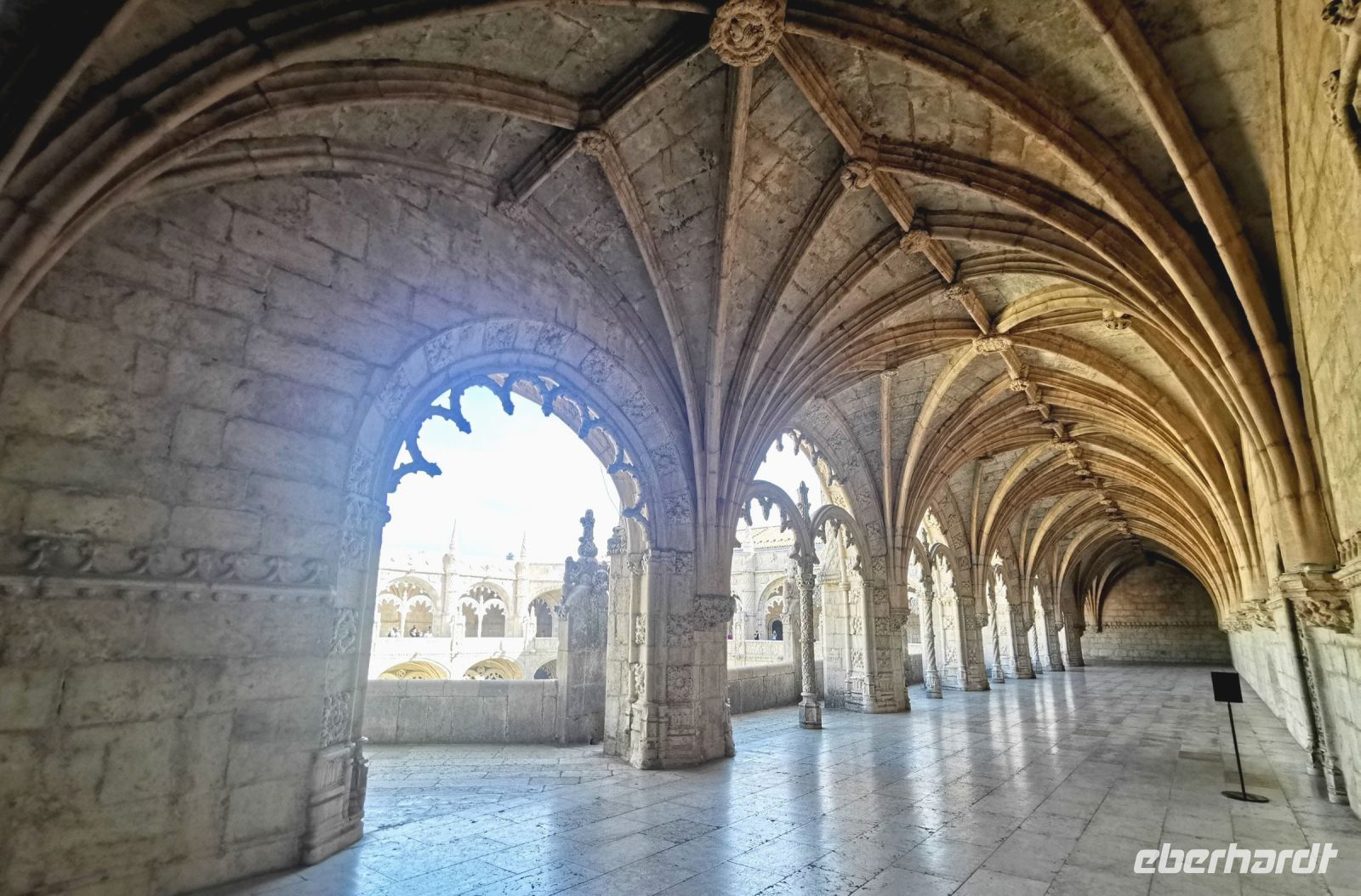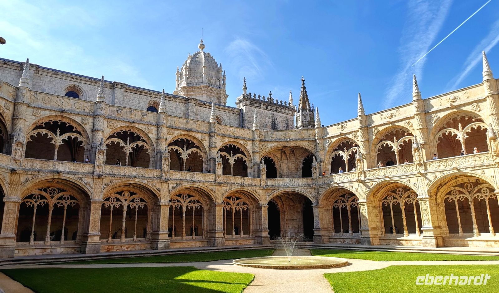 Unweit des Denkmals befindet sich auf der anderen Seite der Straße das berühmte Mosteiro dos Jerónimos, ein spätgotisches Kloster mit einer reich verzierten Fassade. Der beeindruckende Komplex ist 300 Meter lang und schneeweiß. In diesem Kloster sind viele der wichtigsten Portugiesen beigesetzt, darunter Vasco da Gama, Fernando Pessoa, Luis de Camoes und eine ganze Reihe portugiesischer Könige. Das aus dem 16. Jahrhundert stammende Hieronimuskloster ist ein beeindruckendes Beispiel manuelinischer Baukunst. Im Jahre 1502 begann man einst nach einem Entwurf des Architekten Boytac den Grundstein für das Kloster zu legen, unter anderen Baumeistern wurde der Bau fortgesetzt. Wir schauen uns die reich verzierten Kreuzgänge, die Kirche und die Grabmäler an.