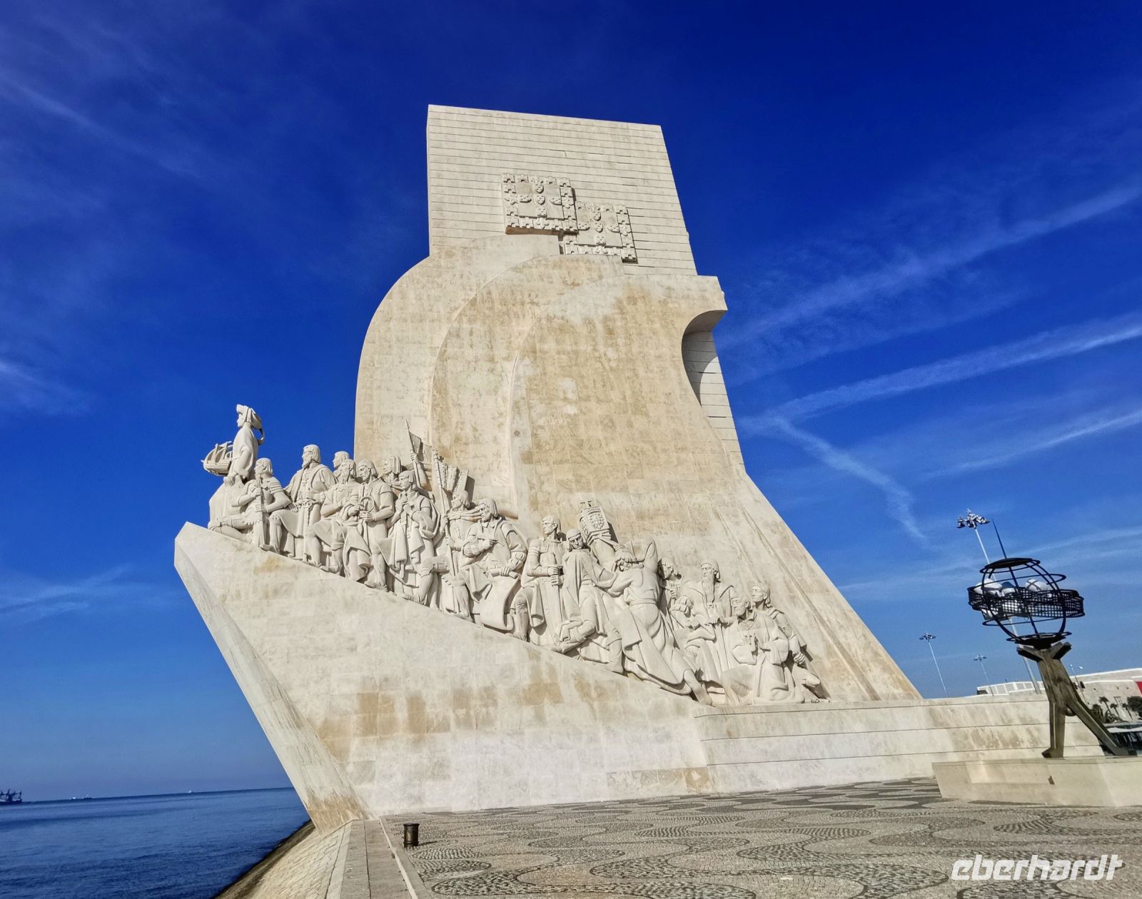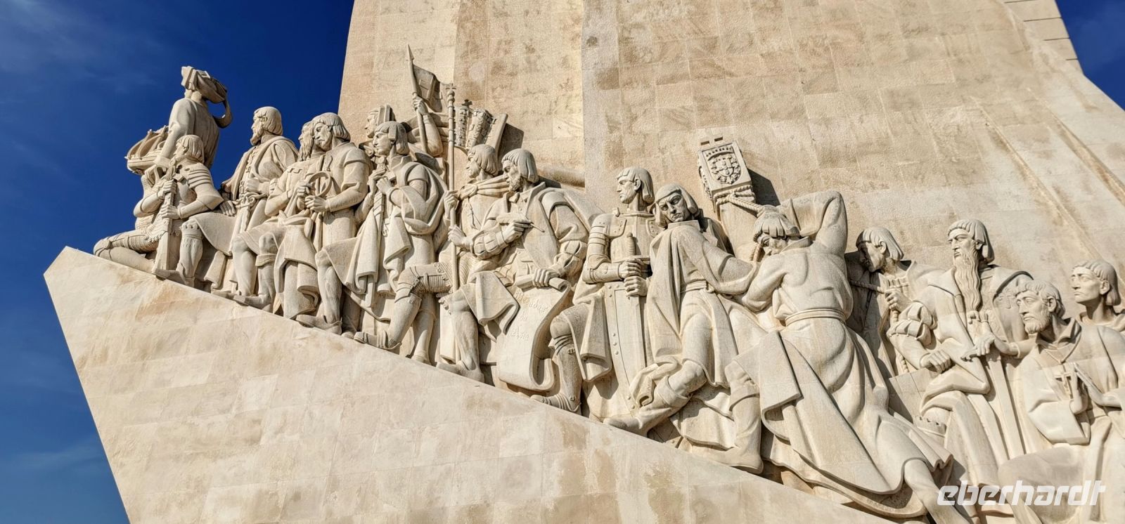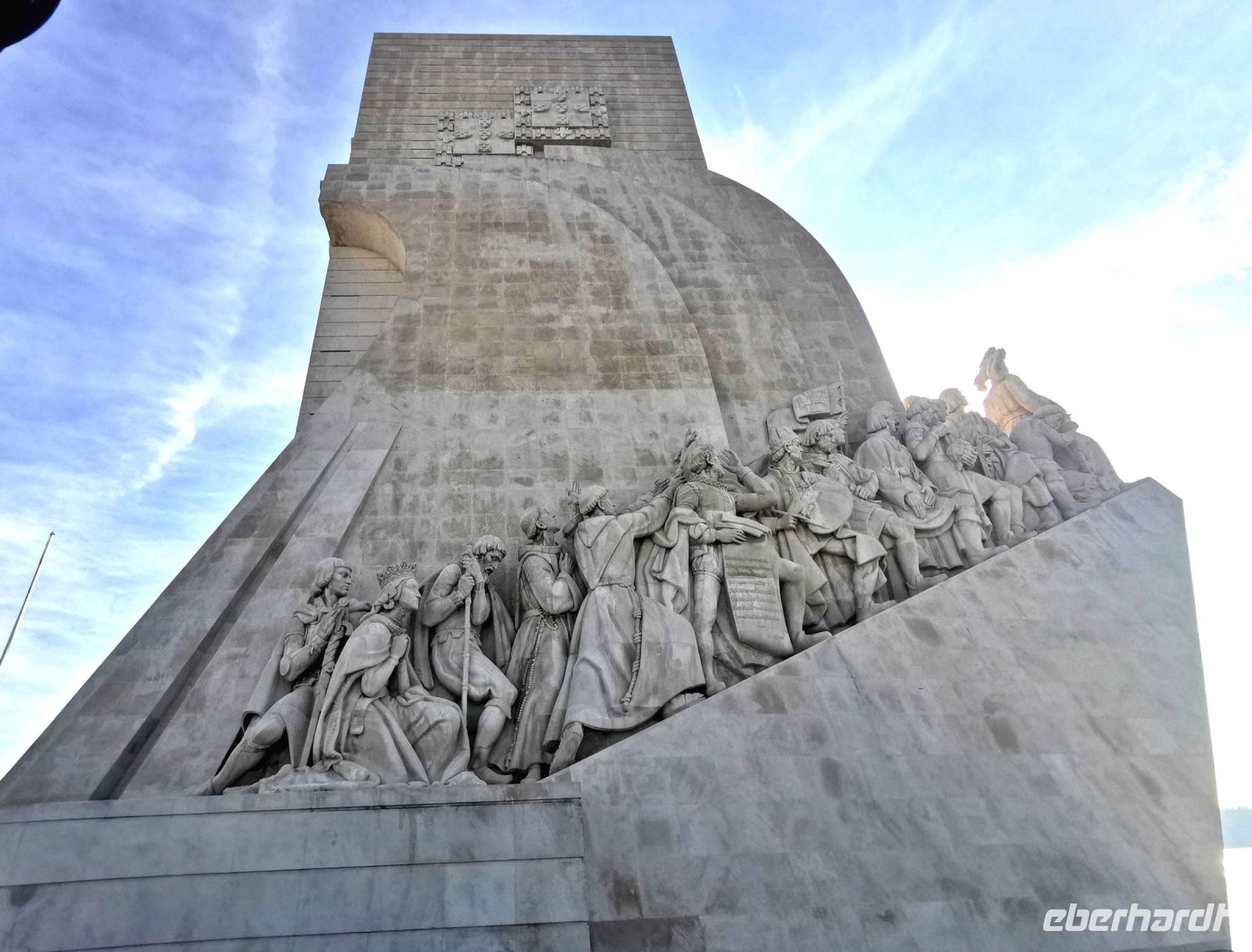 Nachdem wir wunderschöne Fotos vom Turm geschossen haben, schauen wir uns das Padrao dos Descobrimentos, das Denkmal der Entdeckungen an. Es wurde 500 Jahre nach dem Tod Heinrichs des Seefahrers gebaut und soll an das Zeitalter der großen Entdeckungen im 15. und 16. Jahrhundert erinnern. In dieser Blütezeit war Portugal die führende Seemacht und hatte das Monopol über den europäischen Gewürzhandel. So sehen wir auf dem 52 Meter hohen Bau aus Beton Statuen aus Kalkstein. Es sind 32 wichtige Persönlichkeiten, die sich in Richtung Wasser bewegen. An der Spitze steht Heinrich der Seefahrer mit einem Schiff in seinen Händen. Auf der anderen Seite führt Prinz Heinrich die Reihe an, der zahlreiche Entdeckungsreisen initiiert und finanziert hat, aufgrund derer Portugal zur Kolonial- und Seemacht werden konnte. Das Denkmal entstand zur Regierungszeit von Salazar.