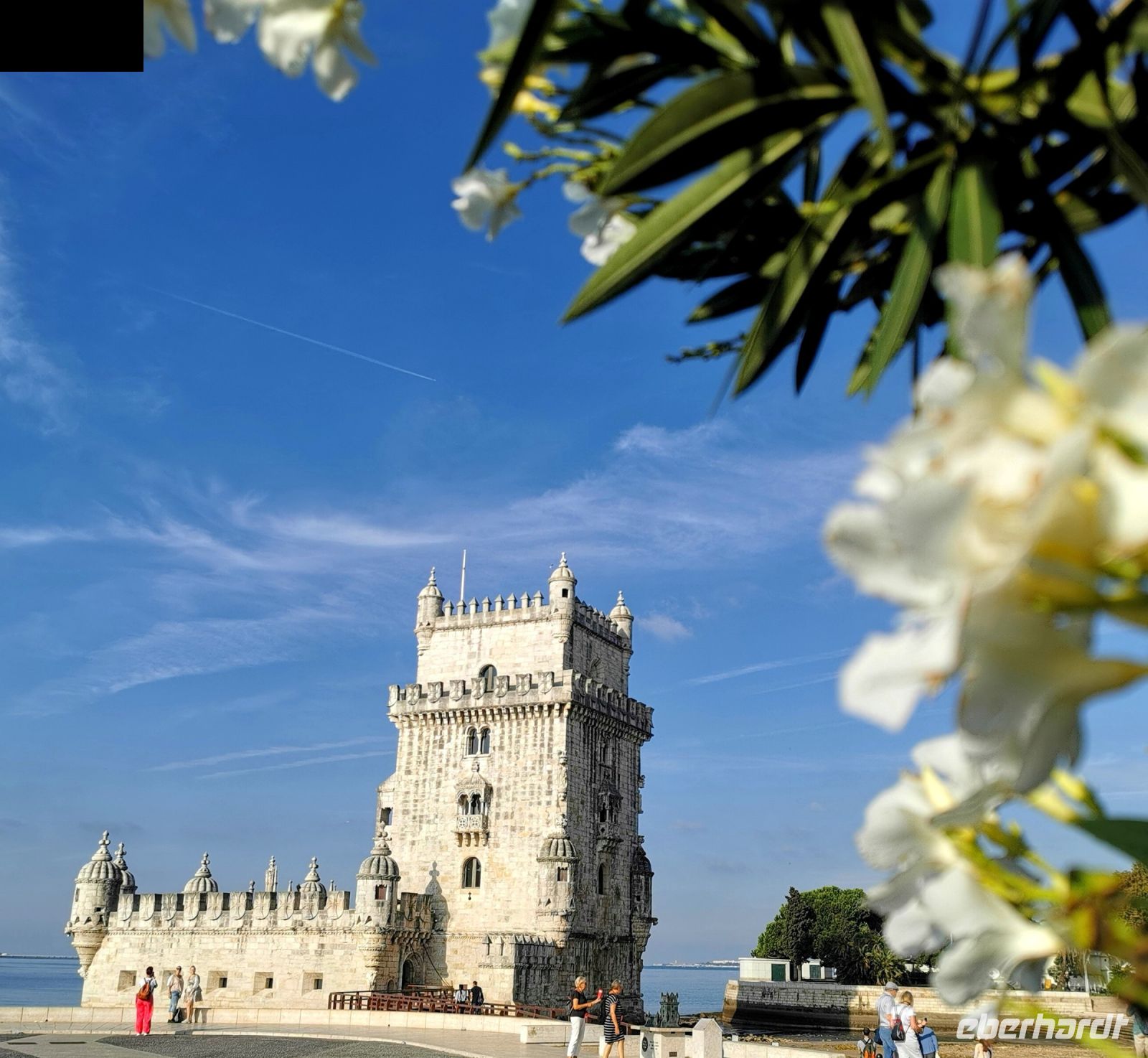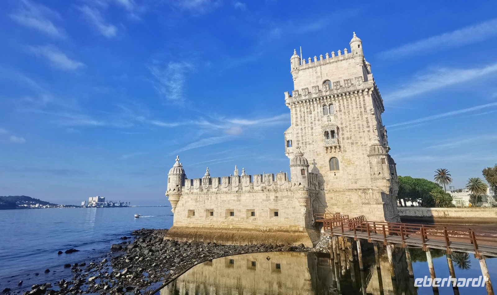 Unsere heutige Hauptstadtbesichtigung starten wir am etwas außerhalb der Stadt gelegenen Torre de Belém. Dieser Turm ist das Wahrzeichen von Lissabon und liegt genau an der Mündung des Tejo ins Meer. Sein Name bedeutet nichts anderes als der Turm von Bethlehem. Das Bauwerk gehört zusammen mit dem nahe gelegenen Kloster Mosteiro dos Jerónimos zum UNESCO Weltkulturerbe. Er wurde 1515 vom portugiesischen König Manuel I. in Auftrag gegeben und 1521 nach seinem Tod fertig gestellt. Ursprünglich diente er als Leuchtturm und Geschützstellung. Auf der anderen Uferseite existierte einst ein zweiter Turm identischer Bauart. Gemeinsam bildeten die Türme die bewachte Hafeneinfahrt. Beim schweren Erdbeben von 1755 wurde dieser andere Turm vollständig zerstört.