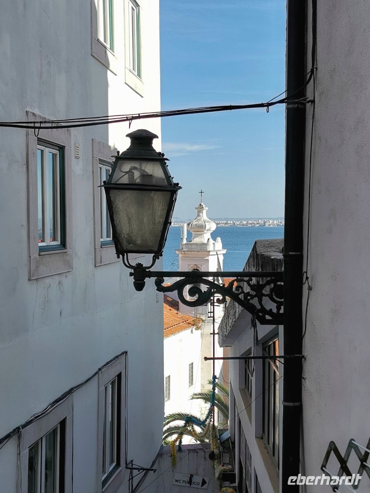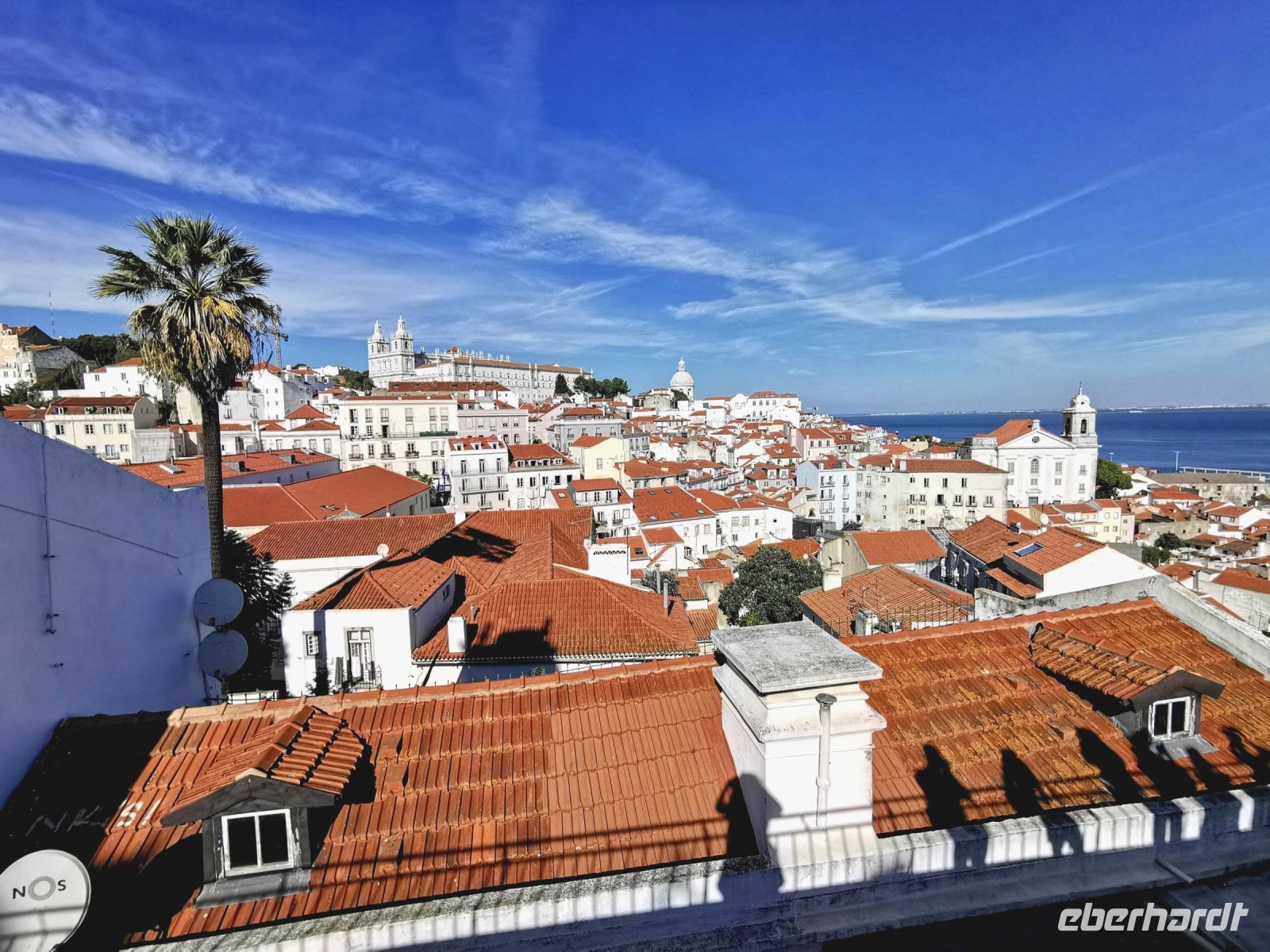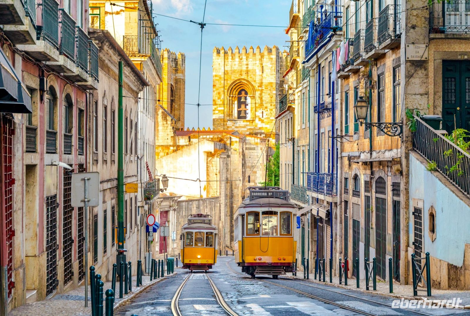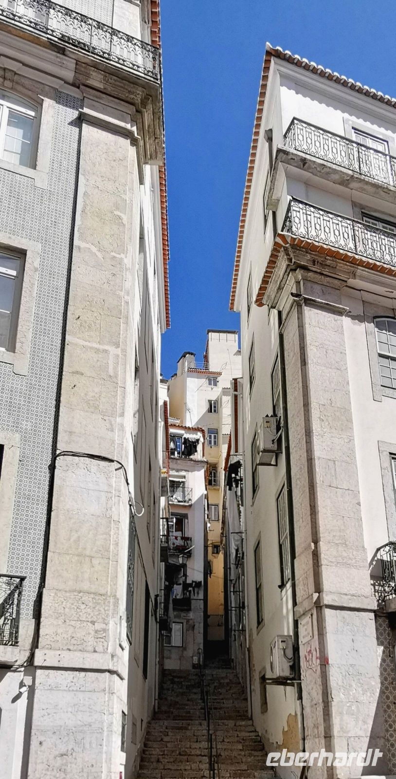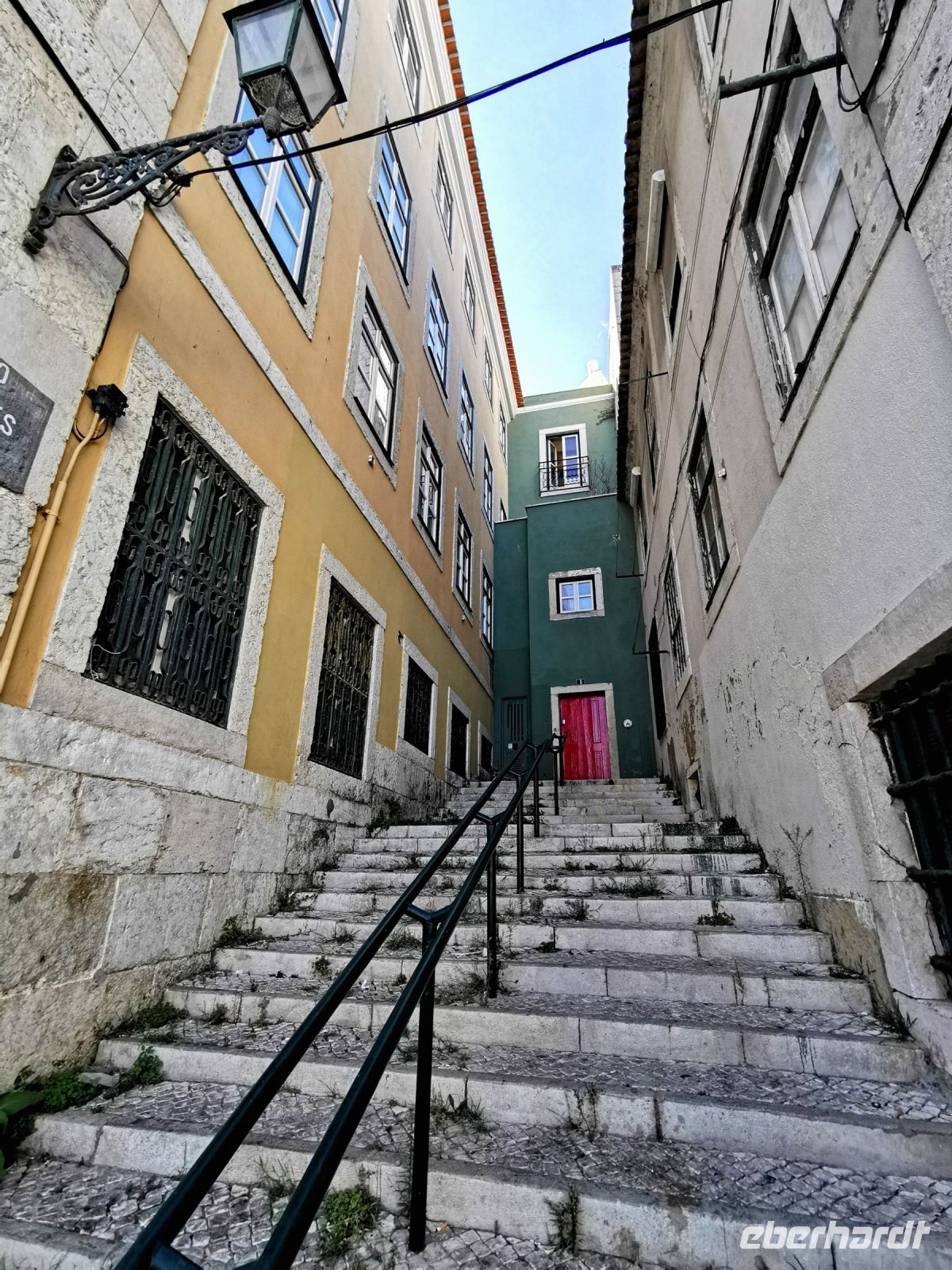 Unseren Abstieg wagen wir durch die steilen Straßen der Alfama, einem der ältesten Viertel der Stadt. Hier gibt es unzählige Geschäfte für traditionelles Kunsthandwerk und Tascas - Eckkneipen. Obendrein kennen dieses Gebiet viele, da die historische Straßenbahnline 28 E sich seit Urzeiten hier durch die engen Gassen hinauf zum Castelo de Sao Jorge hinauf windet.