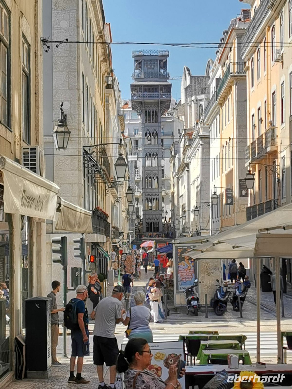 Es ist bereits Mittag geworden und nun wollen wir natürlich das Zentrum der quirligen Metropole Lissabon besuchen. Wir beginnen unseren Rundgang in der Nähe des Elevador de Santa Justa im gut besuchten Bairro Alto. Diese so genannte Oberstadt ist das Szene- und Kneipenviertel Lissabons, in den engen Gassen gibt es unzählige Bars, Cafés, Clubs, Kneipen und Restaurants. Was liegt also näher, als hier eine Mittagspause einzulegen.