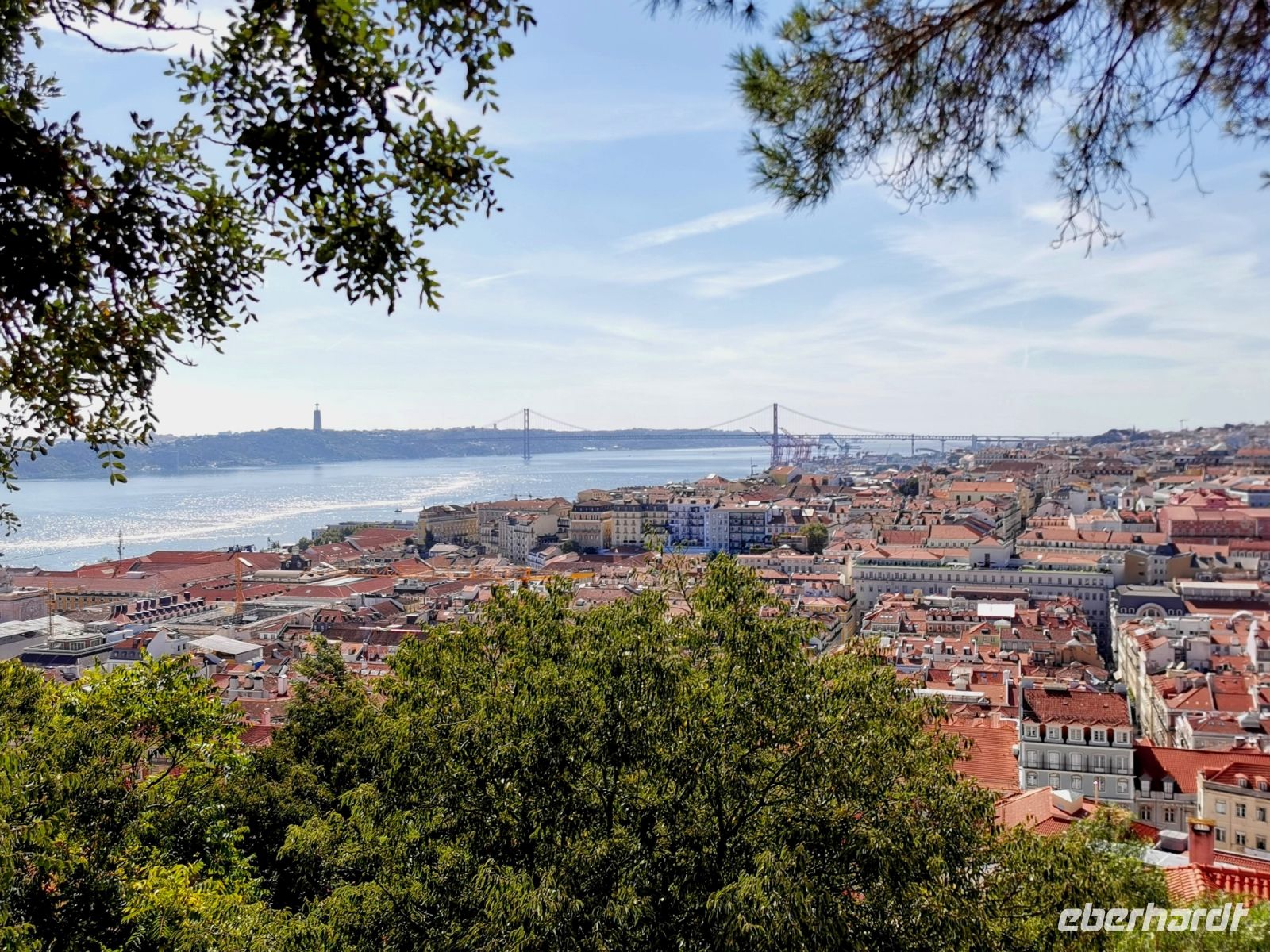 Nachdem wir uns gestärkt haben, wagen wir den steilen Aufstieg zum Castelo de Sao Jorge, einer Festungsanlage mit einer alten Burgruine. Diese Anlage thront majestätisch über Lissabon und zählt zu den berühmtesten Sehenswürdigkeiten der Stadt, die ganze Anlage ist eng mit der frühen Geschichte Lissabons verknüpft. Diese Anlage "sah", wie die Römer ihre Herrschaft an die Westgoten verloren, erlebte heftige Kämpfe zwischen Arabern und Christen, überlebte beachtliche Belagerungen der Kastilier und "erlebte", wie Portugal eine Seefahrernation wurde. Hier hoch oben über den Dächern der Stadt hat man einen fantastischen Ausblick auf die Alfama und die ganze Stadt und durch den 1940 angelegten Park flaniert man hier schattig und kühl.