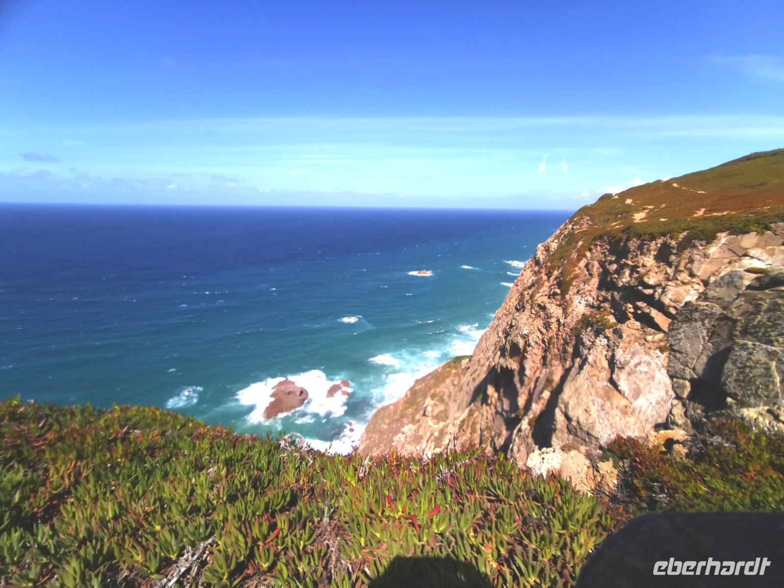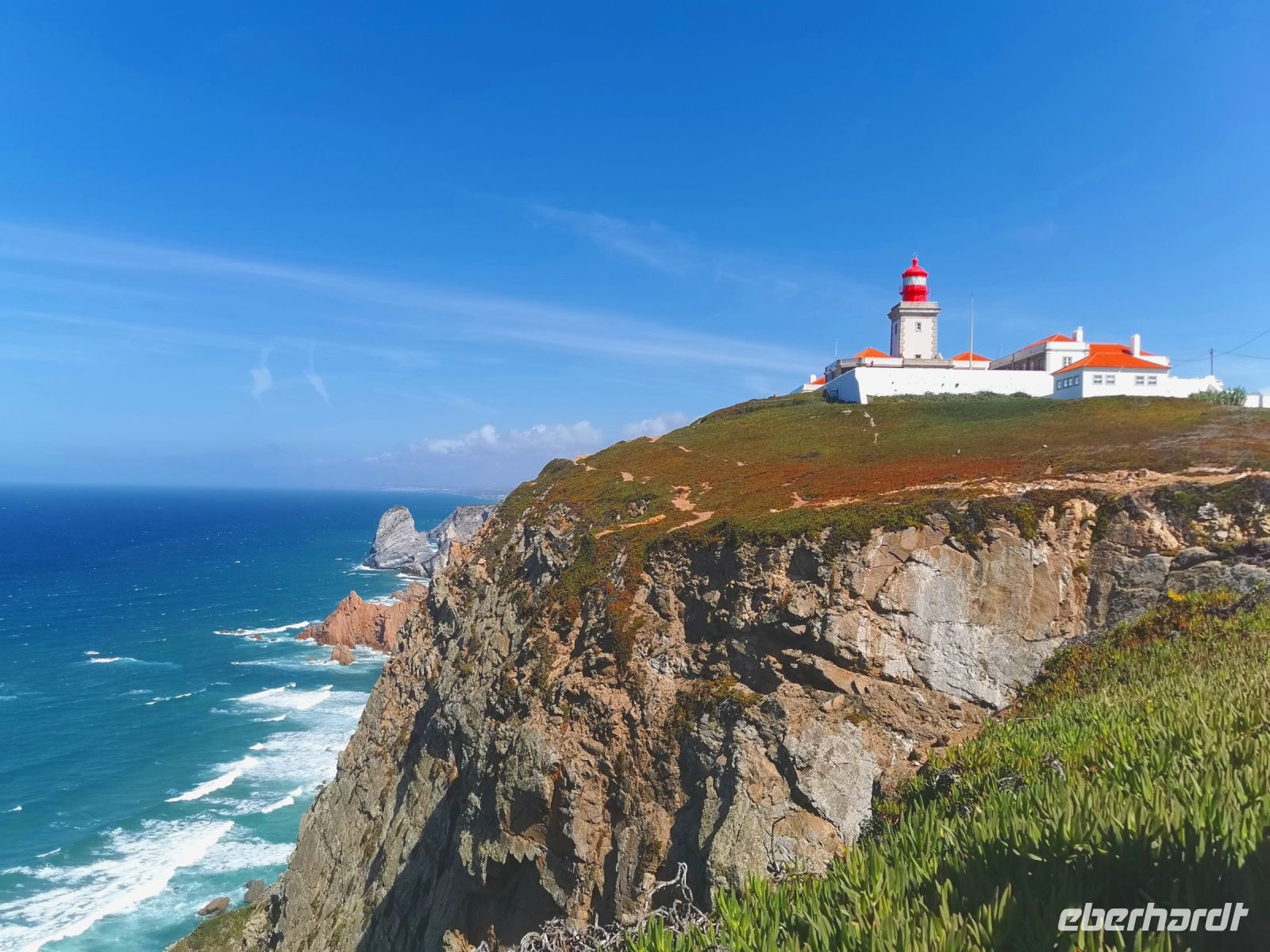 Weiter fahren wir ans Ende der Welt. Das so genannte Cabo da Roca ist der westlichste Punkt des Festlands des europäischen Kontinents. Er liegt an der Atlantikküste westlich von Lissabon in einer Höhe von 140 Metern über dem Meeresspiegel. Der Leuchtturm wurde bereits 1772 in Betrieb genommen und ist der zweitälteste in Portugal überhaupt. Uns weht eine steife Brise um die Ohren, als wir den Bus verlassen, aber Isabel lockt uns mit frisch gebackenen Leckereien schnell an die steile Küste und wir genießen gemeinsam eine Spezialität aus Blätterteig und Puddingfüllung. Danach lassen wir uns den Wind um die Ohren wehen, schauen die steilen Klippen hinunter in türkisblaues Meer und staunen über einige mutige Besucher, die sich weit über die Absperrungen hinaus auf die Felsen wagen, um ein spektakuläres Foto zu schießen.