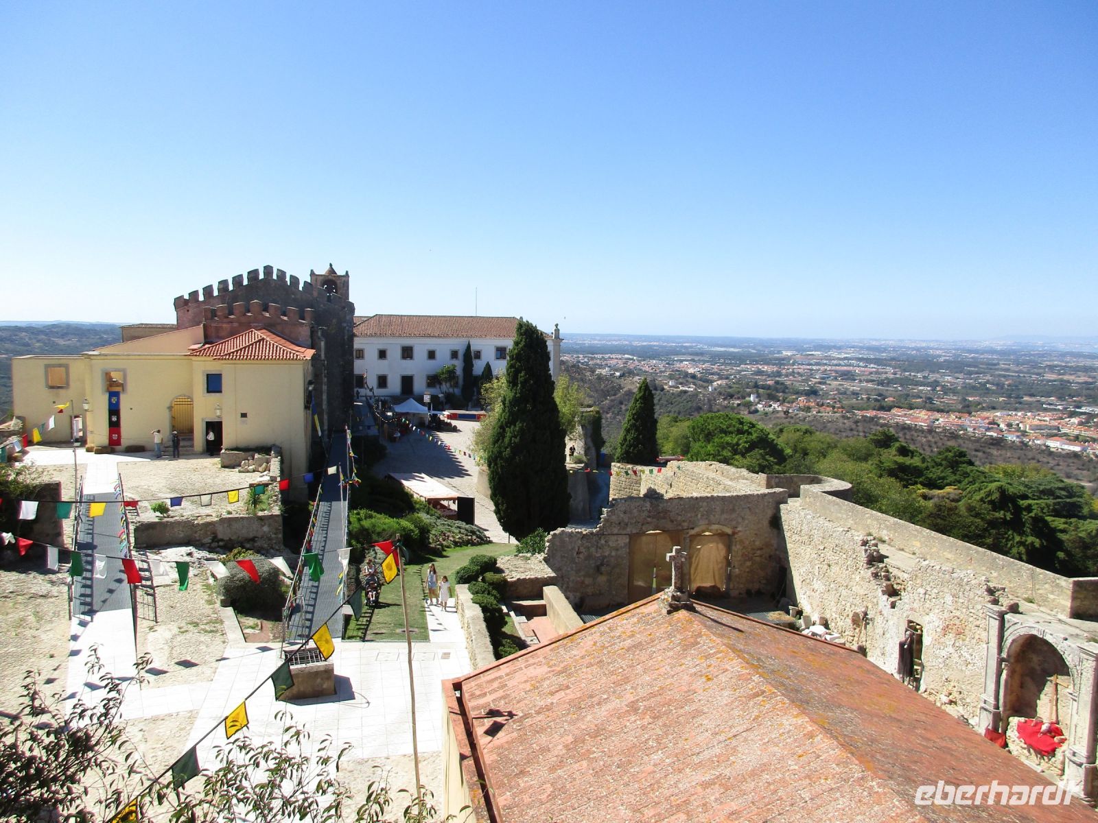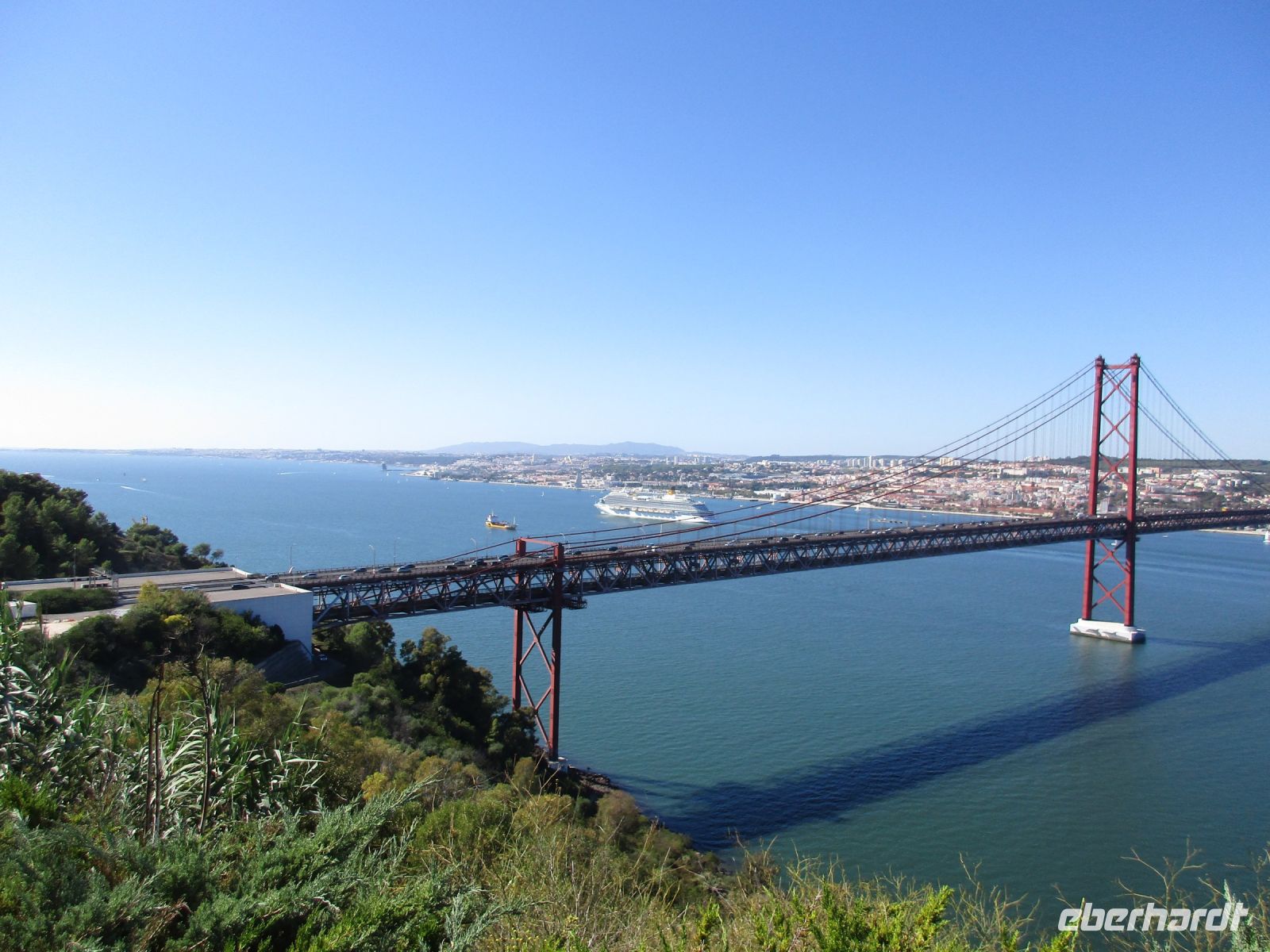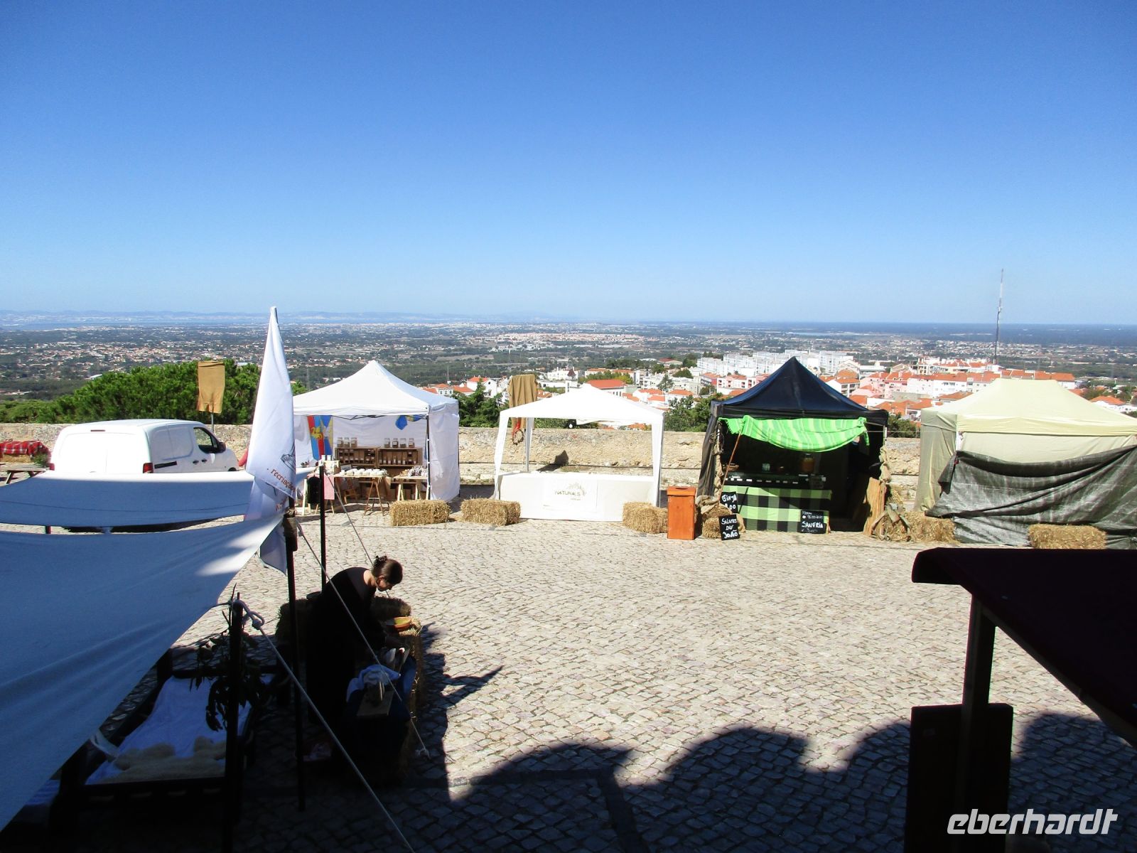 Ein riesiger Parkplatz lädt die Besucher zum Verweilen ein, aber wenige sind da. Einige Camper nutzen das großzügige Angebot der Natur und der Stille auf diesem weiten Areal. Wir sind einfach nur begeistert! Die Investoren stehen allerdings schon bereit und wollen hier bauen… wie schade. Nachdem wir unsere Fotos geschossen haben, geht es weiter nach Sesimbra. Der Ort wird auch als die Perle von Portugal bezeichnet. Das ehemalige Fischerdorf liegt auf der Halbinsel von Setúbal. Der feinsandige Strand in der Stadt wurde künstlich angelegt und erfreut sich vieler Besucher. Hier würden wir unsere Reise sofort verlängern und die Spa- und Wellnessangebote nutzen. Aber wir wollen noch mehr erkunden. Vorbei am Kloster direkt am Berghang, Convento da Arrábida, fahren wir nach Palmela. Mitten im Ort auf einem Hügel erhebt sich die Burg Palmela, wo heute ein Burgfest mit Ritterspielen und mittelalterlichen Märkten stattfindet. Wir kommen gerade richtig zur Eröffnung und kosten einige Leckereien und Getränke. Leider können wir nicht länger verweilen, denn der krönende Abschluss soll der Besuch der König-Christus-Statue Cristo Rei sein. Falls Gott Portugal vom II. Weltkrieg verschont, gelobten die Bischöfe 1940, würden sie eine Christus Statue wie in Rio de Janeiro errichten. Das geschah 1949 und dauerte 10 Jahre. 1959 weihten die Erzbischöfe und etwa 300.000 Menschen diese Statue in Almada ein. Seitdem thront sie über Lissabon und ist ein Wahrzeichen der Stadt. Wir blicken von hier aus über den Tejo und die Brücke des 25. April und sagen obrigado und adeus Portugal, denn morgen Abend werden wir schon wieder zu Hause sein.