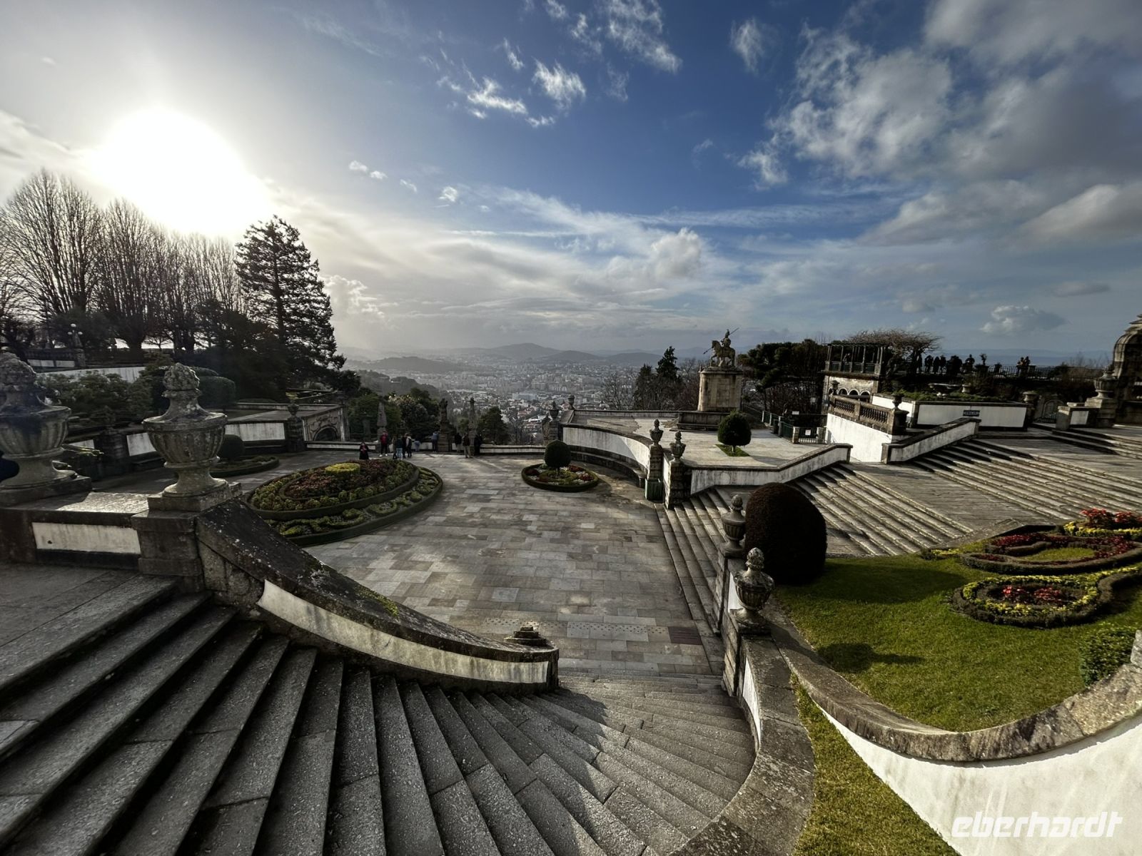 Mit der ältesten Standseilbahn, einer sogenannten Wasserballastbahn fuhren wir hinauf zu dem geschichtsträchtigen Pilgerort. Über die barocke Treppe aus dem 18. Jahrhundert, welche die 14 Leidensstationen Christi symbolisiert erreichten wir schließlich unser Ziel. Uns verschlug es die Sprache. Zum einen stand hier diese riesige Kirche umzäunt von einer hübschen Parkanlage zum anderen hatten wir von hier aus eine atemberaubende Sicht über das Städtchen Braga. Wahnsinn! Dieser Ausflug hat sich mehr als gelohnt.