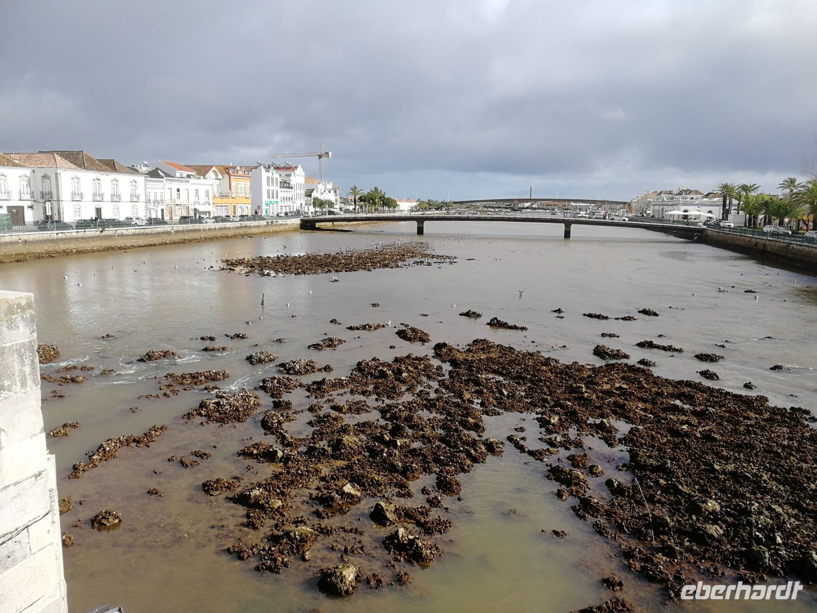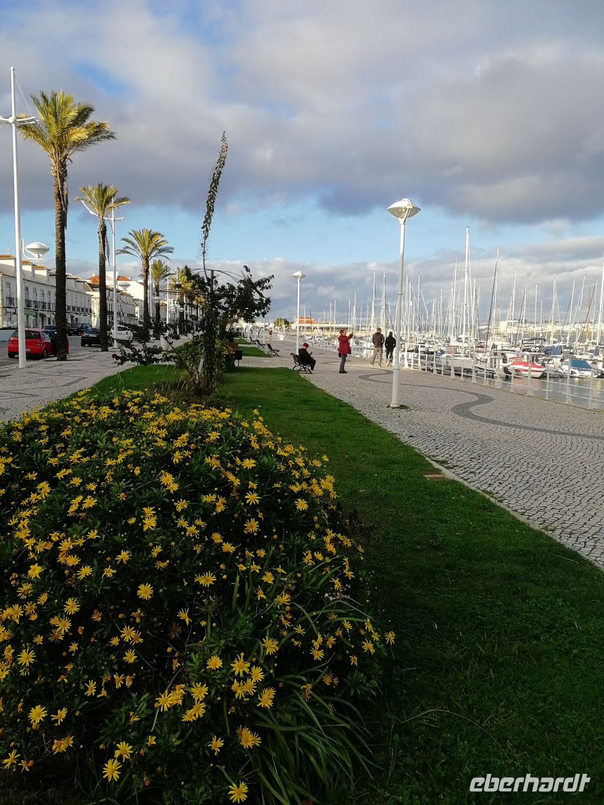 Die Energiepolster gut aufgeladen brachte uns Jorge, unser Busfahrer zum vorletzten Programmpunkt des Tages, in die Stadt am Guadiana namens Vila Real de St. António, welche die Grenzstadt zu Spanien bildet. Die Stadt hatte bis ins 18. Jahrhundert mit Überflutung und Versandung zu kämpfen. Doch durch die Nähe zu Spanien sollten die verschifften Waren über den Guadiana und den Fischfang unter königliche Aufsicht gestellt werden, da man Mitte des 18. Jahrhundert gegen Spanien einen Krieg führte. Die Stadt selbst wurde architektonisch nach dem Vorbild Lissabons nach schachbrettartiger Ordnung errichtet, was wir bei einem Bummel durch die langgezogenen Straßen wahrnehmen konnten. Viele von uns bummelten entlang der mit Dattelpalmen gesäumten Hafenpromenade, wobei die Weitblicke bis in das benachbarte Ayamonte und den Golfplatz Isla Canela reichten.