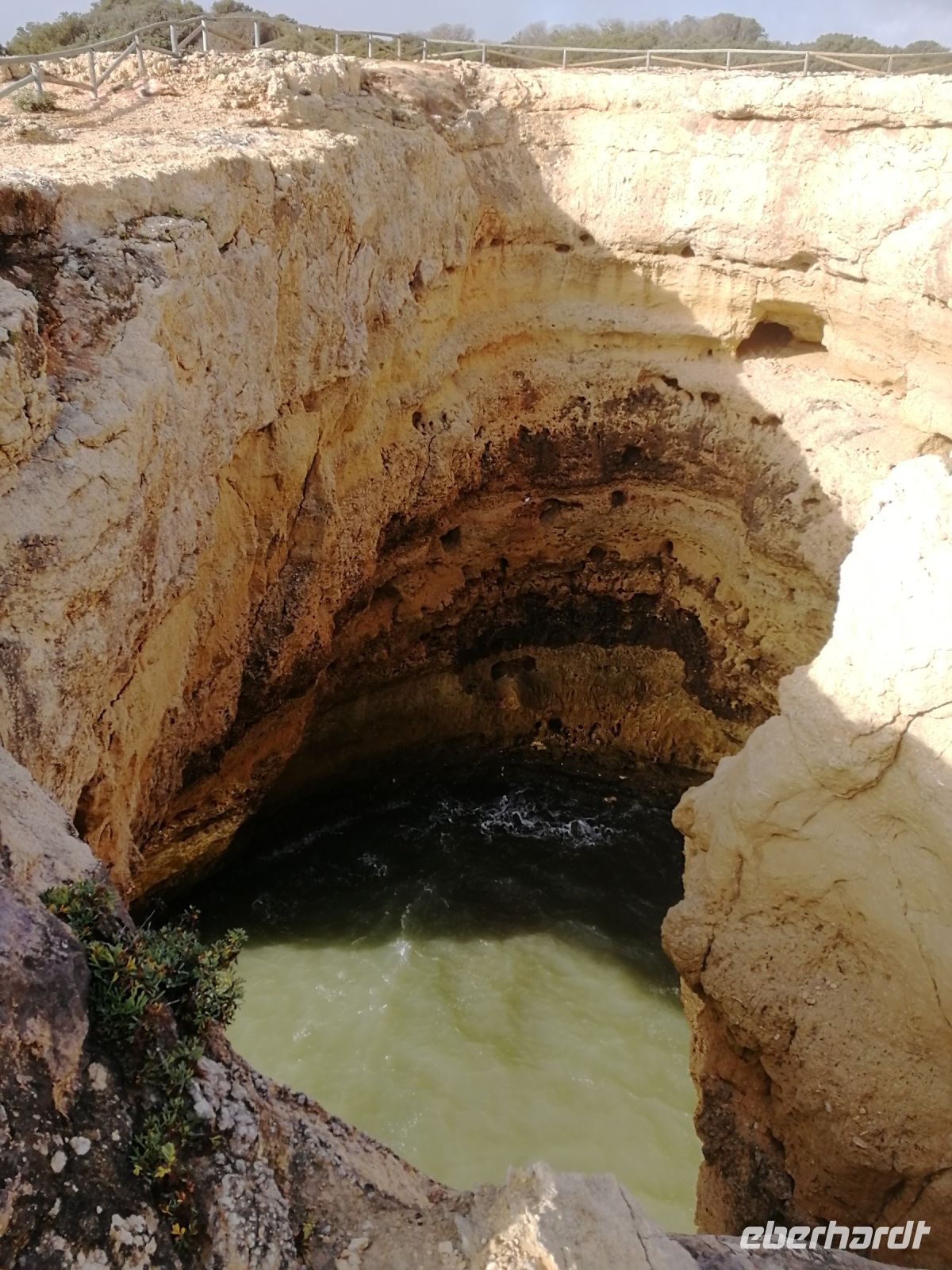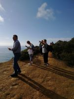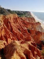 Unser heutiger Tag stand im Zeichen der Zentralalgarve mit seinen bizarren Felsformationen welche in Konfrontation oder besser im Einklang mit der gewaltigen Kraft des Atlantischen Ozean stehen. Wer kann bei einer Klippenwanderung im Glanz der Sonne, dem Duft der Pinien, in weiß getünchten Villen auf so manchen Felsen und den verschiedenen Sandsteinskulpturen entlang der Felsalgarve schon Nein sagen? Nach den ersten Sonnenstrahlen am morgendlichen Frühstück empfing uns unsere Wanderführerin Fatima zu unserer gemeinsamen Küsten- oder doch zutreffender Klippenwanderung von Senhora da Rocha bis zum Farol de Alfanzina bei Carvoeiro. Schon während der Fahrt zu unserem Einstiegspunkt ist Fatima überzeugt: Es ist der schönste Küstenabschnitt der Algarve. Da hat sie wahrhaft nicht zu viel versprochen, wobei das Gesamtbild die Schönheit einer Region vergegenwärtigt. Andererseits wurden wir bei der Durchfahrt durch Armação de Pêra mit den Auswirkungen des „Overtourism“ und deren Overcrowding Effekte sensibilisiert. Ein einstiges Fischerdorf wurde von fatalen Bausünden in Form von Hochhäusern, Massenhotels und Appartements eingenommen. Meist nehmen Gentrifizierungserscheinungen die führende Oberhand. Der Startpunkt unserer Wanderung sollte bereits vor der offiziellen Wandermarkierung beginnen. Dabei wurde uns bewusst, dass wir uns in einem sensiblen Raum befinden, die Natur achten und nur auf den ausgewiesenen Pfaden gehen. Alle Gäste bereits vor Reisebeginn in Deutschland für festes Schuhwerk und geeigneter Outdoorkleidung sensibilisiert, ging es "auf und ab", immer auf festen Sandsteinboden, sodass keinem etwas passieren konnte. Die Reisebegleitung bildete dabei immer den Schlusspunkt um alle Wanderteilnehmer im Blick zu haben. Entlang der Route gab uns Fatima spannende Erläuterungen zu Flora und Fauna, den Besonderheiten der Algarve und zeigte uns verschiedene Verformungen an Land wie im Wasser. Wer hat schon mal ein Erdmännchen im Wasser gesehen? Oder ein Bügeleisen mitten im Meer? Äolische und fluviatile exogene Erosionsprozesse machen es möglich! Bald haben wir die Praia da Albandeira und die Praia da Marinha erreicht, sodass wir ein kleines Picknick mit traditioneller portugiesischer Blutwurst, der Choriça Morcela und frischen Brot durchführen konnten. An dieser Stelle verlassen uns drei tapfere Wanderinnen, sie nehmen den am Vortag angebotenen Ausstieg und die Vorzüge eines Reisebusses entgegen, welcher sie zu unserem Treffpunkt am Farol de Alfanzina brachte. Doch bis dahin konnte der Rest der Gruppe sich auf einen abwechslungsreichen Pfad freuen, entlang der Praia de Benagil, wo uns der Rauch von frisch geräucherten Fisch in unser Angesicht bläst. Beim nächsten Mal werden wir hier einkehren und die Ausblicke über den Atlantik und die Praia de Benagil bei frisch geräucherten Fischgerichten in Erfahrung bringen. Entlang des Weges berichtete unsere Wanderführerin von so mancher Episode aus ihren Wanderungen mit verschiedenartigen Gästen. Wer einmal den Blick hinunter zum Abgrund der Klippe wagte, sah das ein oder andere Boot, welches auf dem Weg in die Benagil Höhlen von Portimão war. Aber auch von Land konnten wir tiefe Blicke wagen. Dolinen, eine Art von schlot-, oder trichterförmigen Senken von meist rundem oder elliptischem Grundriss bestätigte, dass wir auf Karstgebiet unterwegs sind. Wir mussten nur wenige Augenblicke warten bis eine starke Welle sich in der Doline den Weg ebnete. Nun war es nicht mehr weit und wir sahen die rote Kuppel des Leuchtturm Farol de Alfanzina und damit unser Ziel der Wanderung.