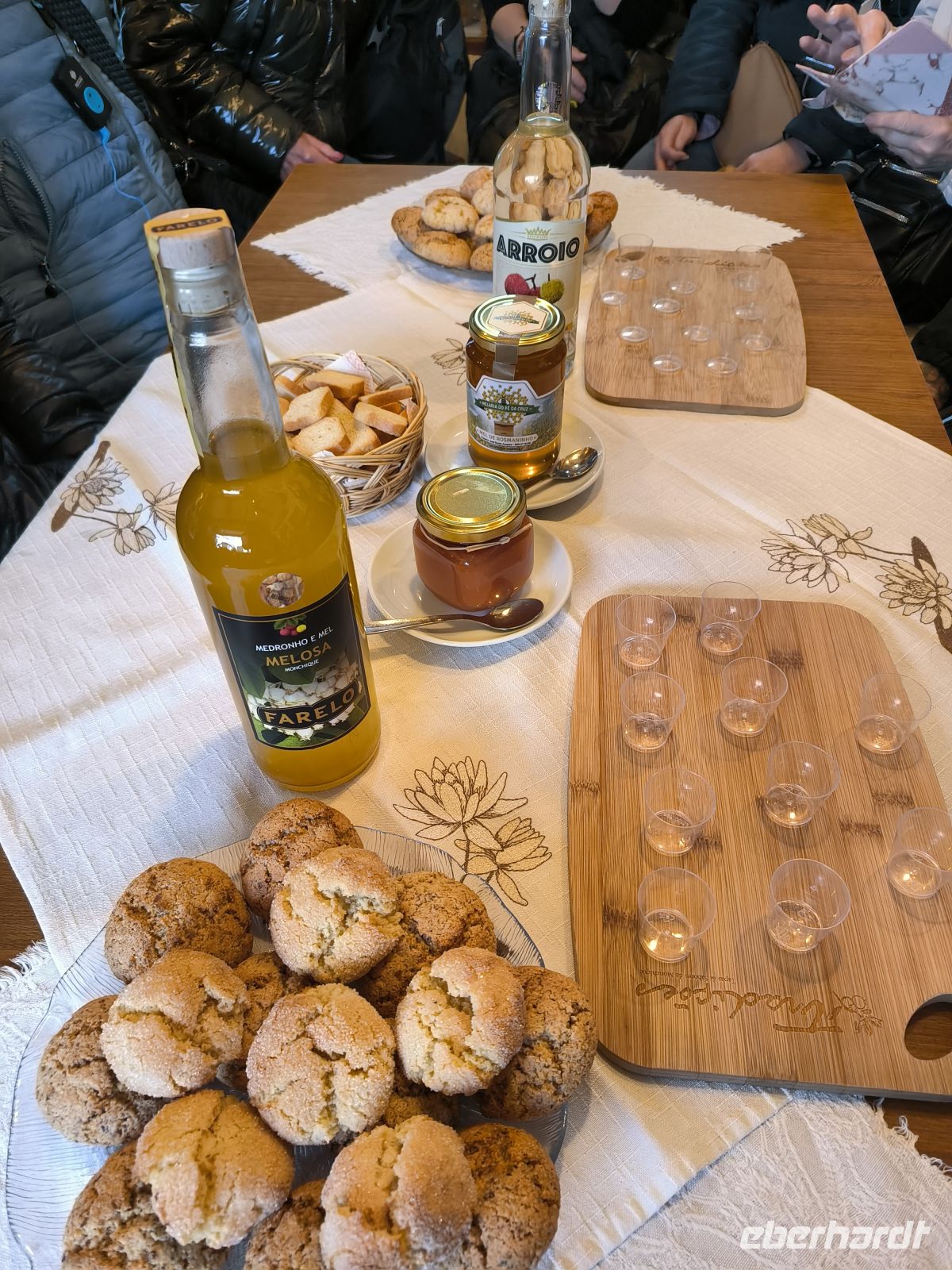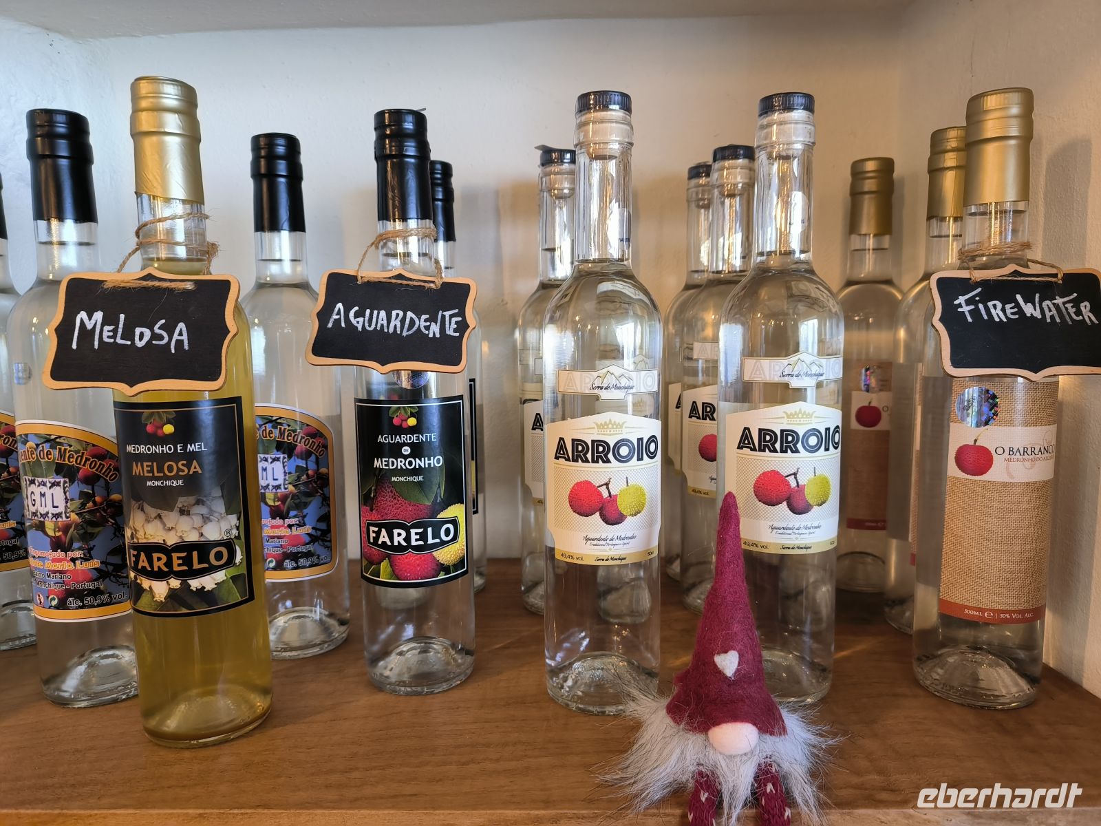 In Monchique, dem Hauptort des gleichnamigen Gebirges legen wir - noch immer im Regen – unsere Mittagspause ein. Danach probieren wir den berühmten Medronho-Schnaps, einen traditioneller portugiesischen Obstbrand, der aus den fermentierten Früchten des wild wachsenden Erdbeerbaums hergestellt wird. Seine wärmende Wirkung können wir bestätigen, sie tut uns gut.