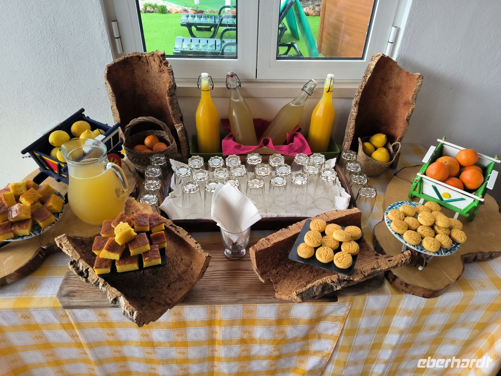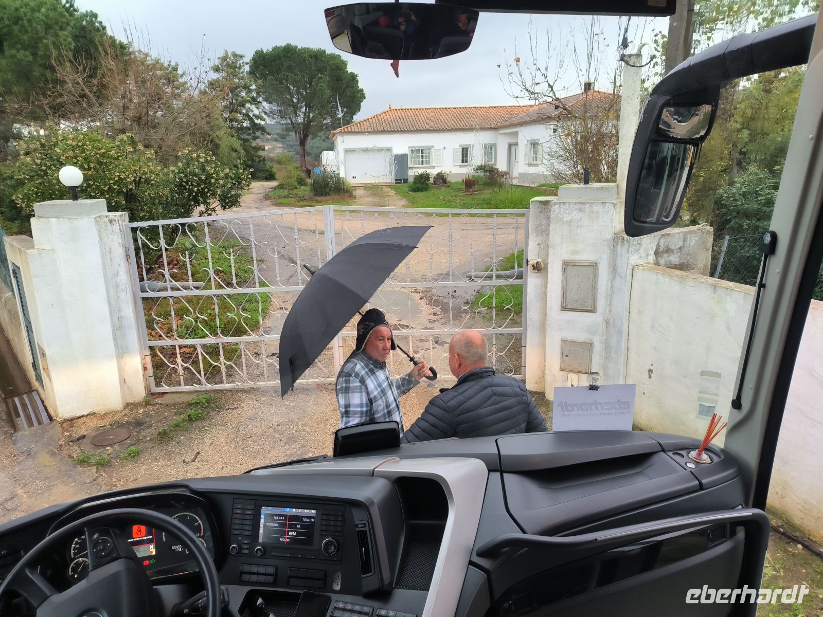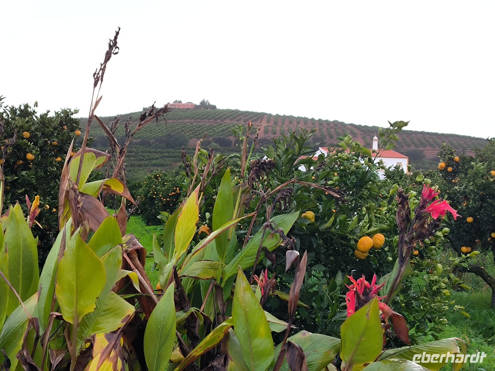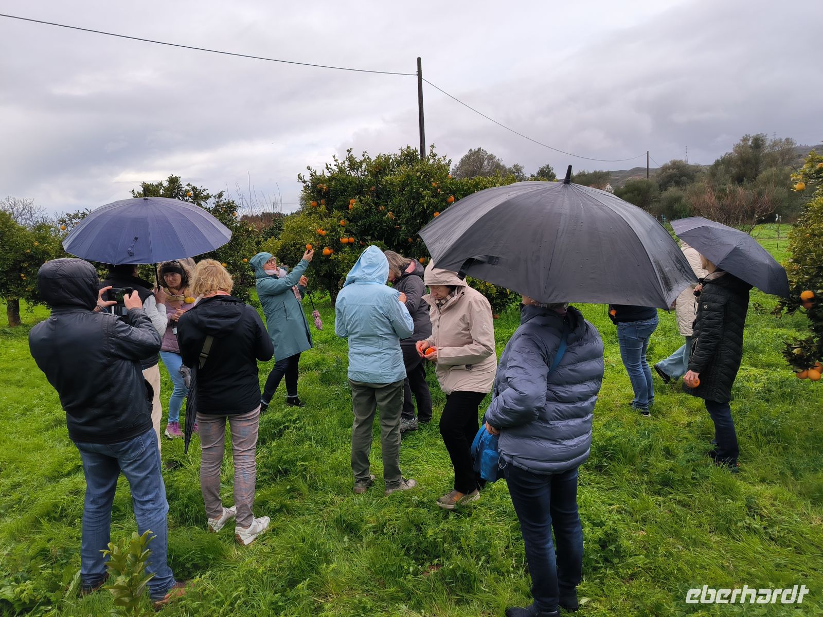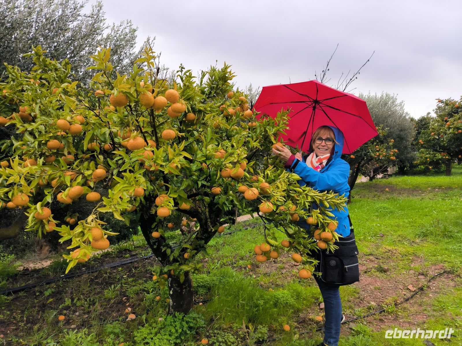 Heute fahren wir in den "Garten der Algarve", ins immergrüne Gebirge Serra de Monchique im Landesinneren. Hier sehen wir tropische Vegetation ebenso wie stille Bergdörfer mit teils römischen Wurzeln. Leider regnet es. Zuerst besuchen wir eine portugiesische Orangenplantage. Man könnte denken, dass Orangenbäumen zu Mangroven werden, sie stehen unter Wasser. Trotzdem lässt es sich der Bauer nicht nehmen, uns von seinen Früchten zu überzeugen. Mit Regenschirm und guter Laune geht es zwischen den Bäumen hindurch und wir dürfen nach Herzenslust frische Orangen und Mandarinen pflücken. Im Trocknen gibt es dann noch weitere Kostproben, auch Gebäck, Honig und Zitronensaft stehen bereit.