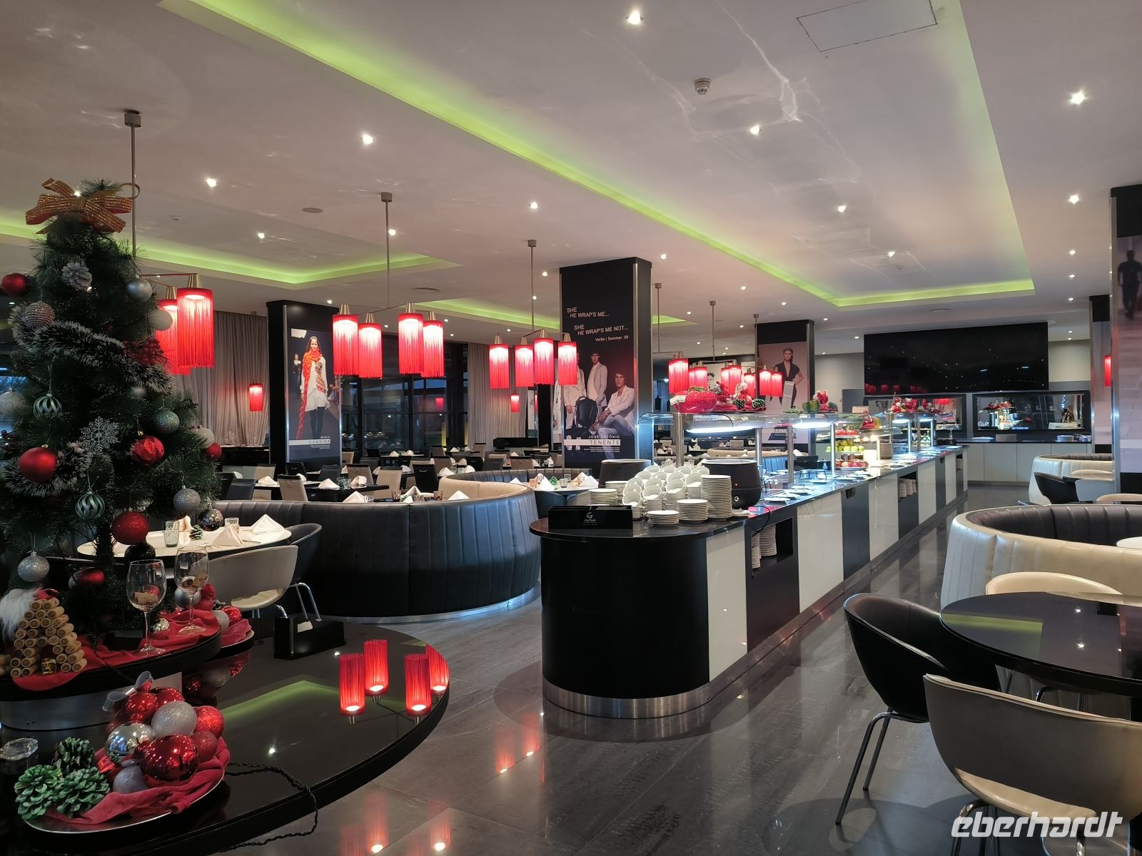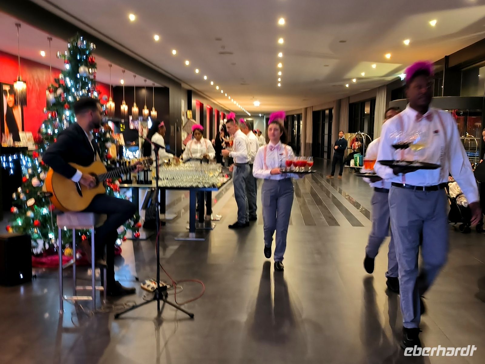 Zurück im Hotel verschwinden alle auf ihren Zimmern, um sich für den Silvester-Abend zu rüsten. 19 Uhr haben wir uns zum Welcome-Drink in der Lobby verabredet. Es ist festlich geschmückt, ein Live-Musiker sorgt für Unterhaltung. Wir haben uns alle schick gemacht. Von Heike gibt es blaue und neue Glücksbringer. Wir möchten ja einige der portugiesischen Neujahrstraditionen teilen. Der Abend ist thematisch eine Hommage an die starken Frau der Geschichte. Auf dem Weg zum Festsaal wird unsere Gruppe von einem professionellen Fotografen fotografiert, wir sind gespannt auf das Ergebnis. Tisch 25 und 26 (wie passend zu diesem Jahreswechsel) sind für uns reserviert. Na gut, an einem Tisch direkt neben den Boxen an der Bühne ist es einfach zu laut. Wir können tauschen, die Tischnummer wandert mit. Auf der Bühne spielt eine tolle Band, es zuckt uns schon in den Füßen, aber zuerst wird das Menü serviert. Zum Thema des Abends passend, sind auch die Gänge nach starken Frauen benannt: