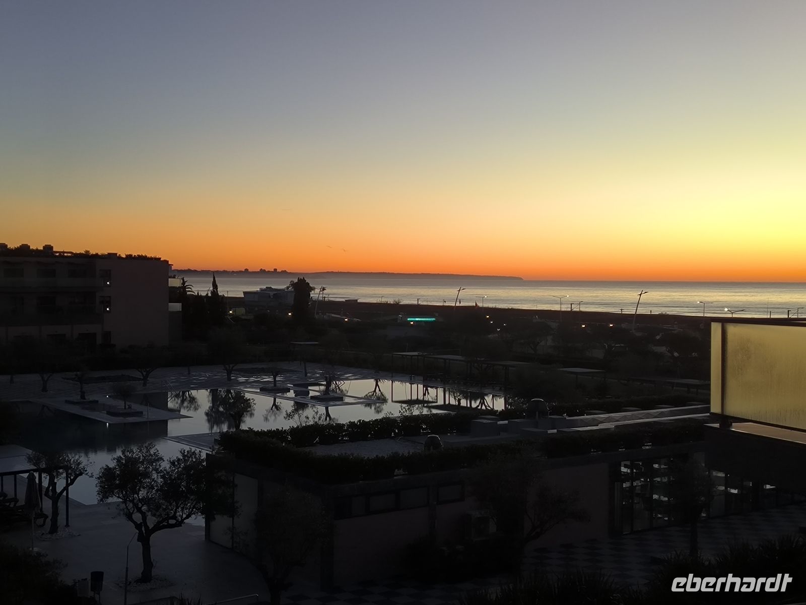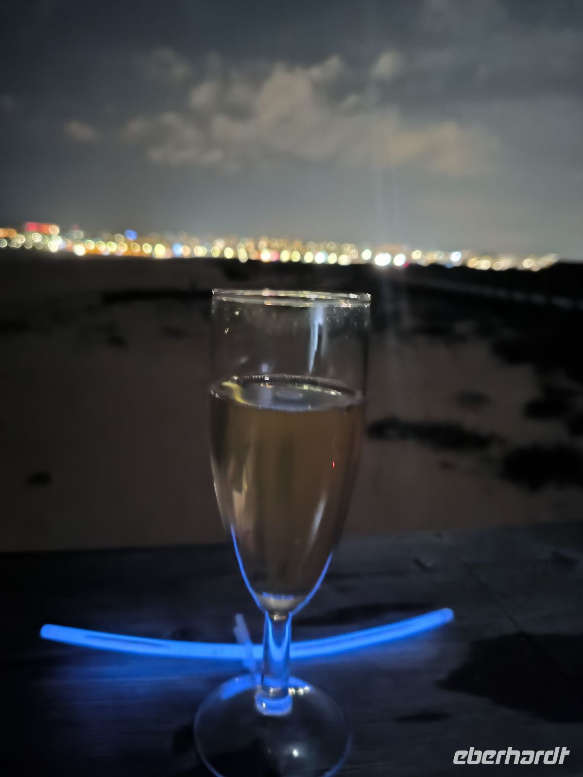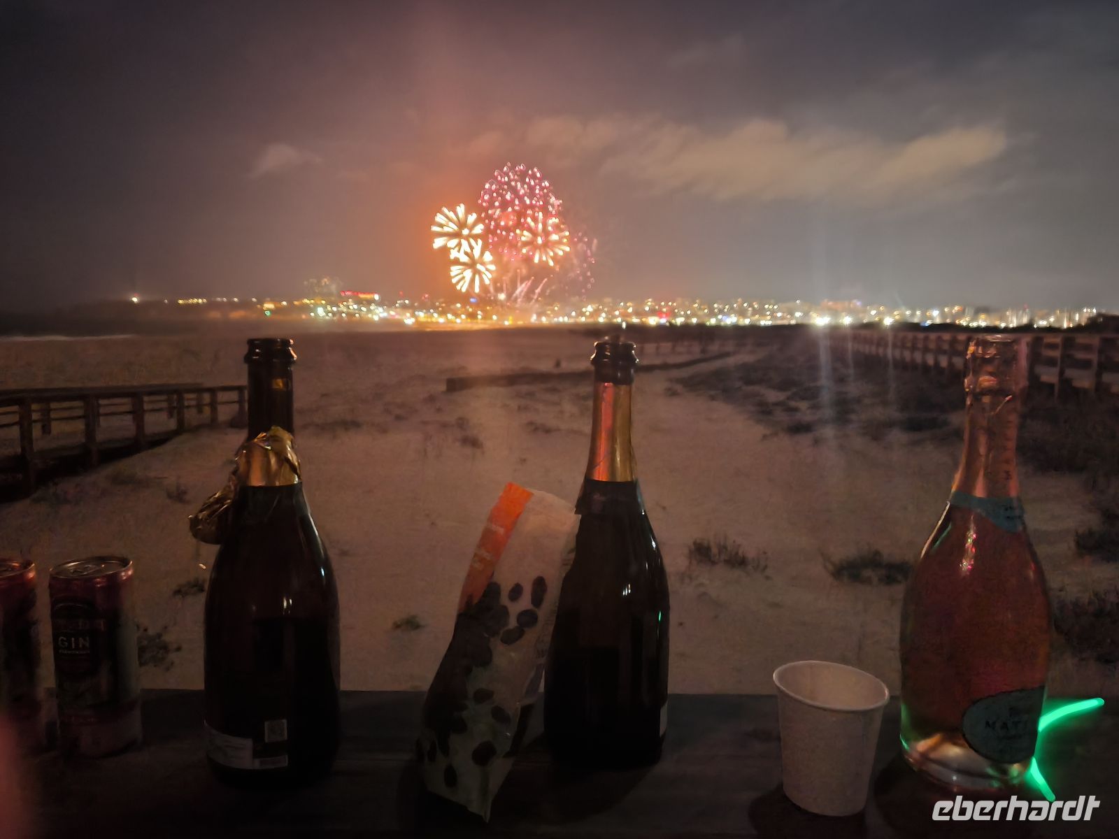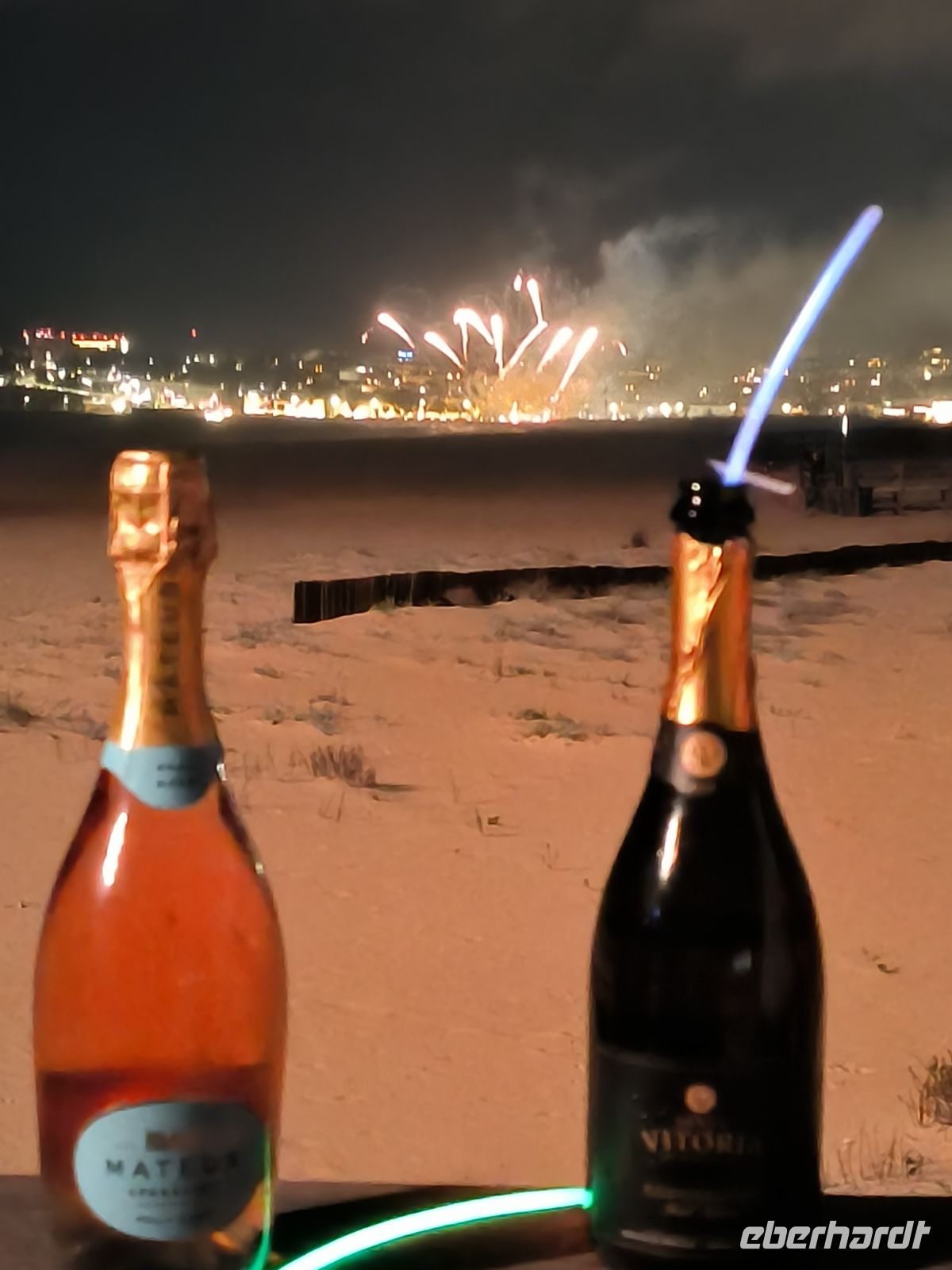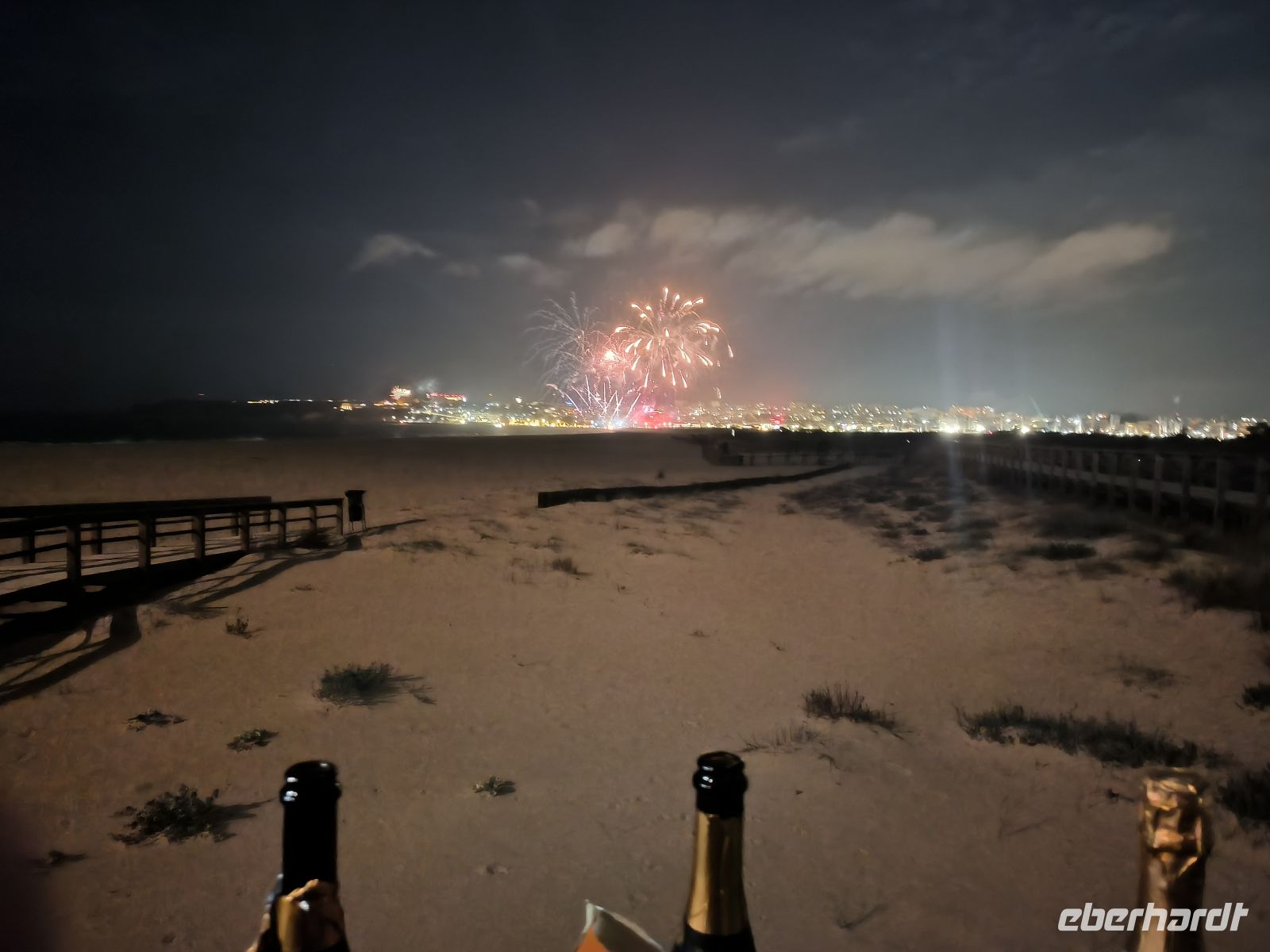 Und nun darf getanzt werden. Da wir in Portugal eine Stunde hinter der deutschen Zeit sind, bringt uns Animateur Ulisses schon um 23 Uhr eine Flasche Sekt, damit wir auf Silvester in Germany anstoßen können. Halb zwölf ziehen wir uns etwas über und gehen gemeinsam zum nahen Strand. Hier ist es nun soweit. Wir sehen die leuchtenden Raketen in Lagos in den Himmel steigen, das bunte Feuerwerk ist entspannt. Wir tauschen Neujahrswünsche und kehren fröhlich ins Hotel zurück, wo uns ein leckeres Austernbuffet erwartet. Noch bis zwei Uhr drehen wir auf der Tanzfläche unsere Runden.