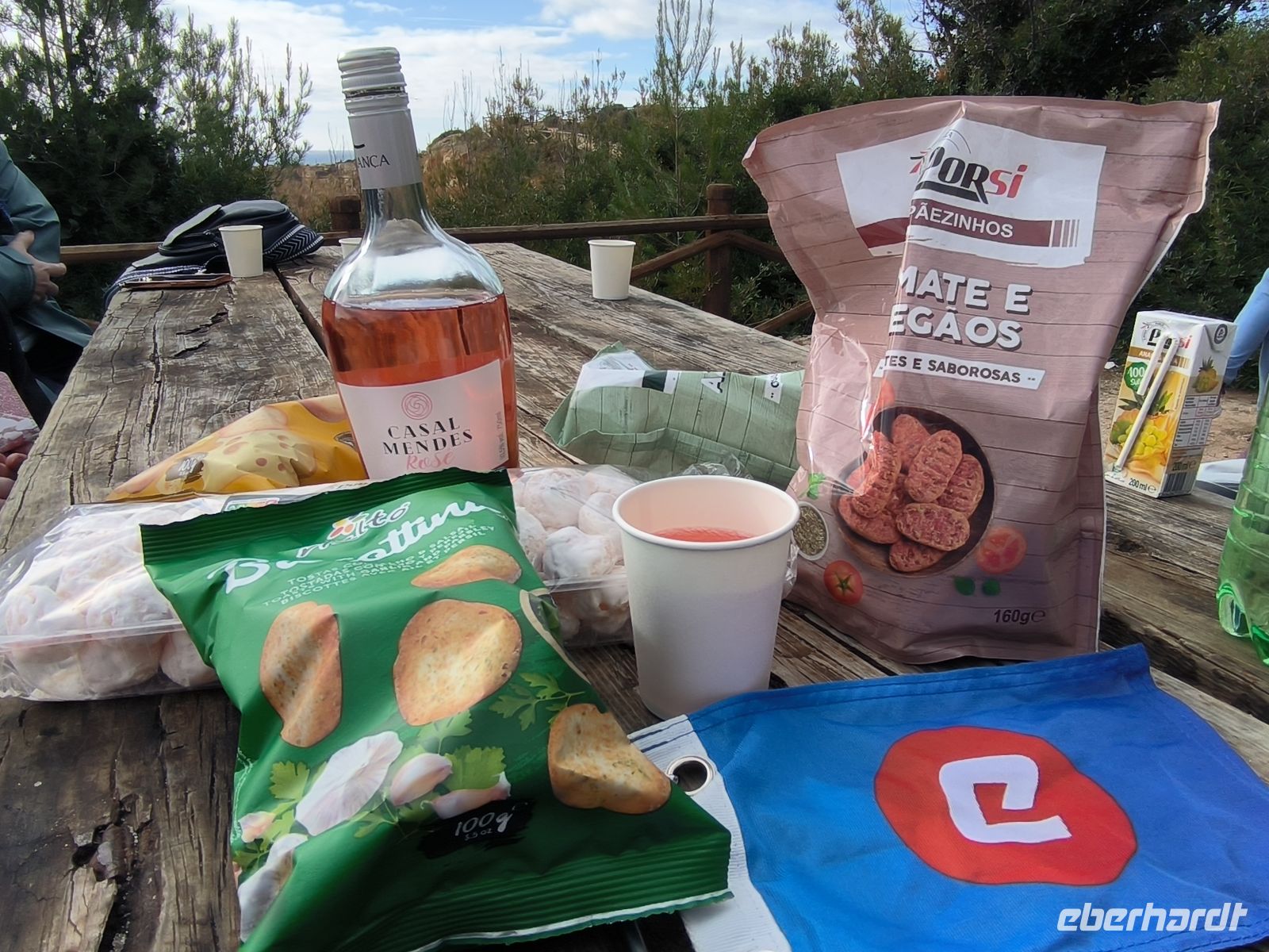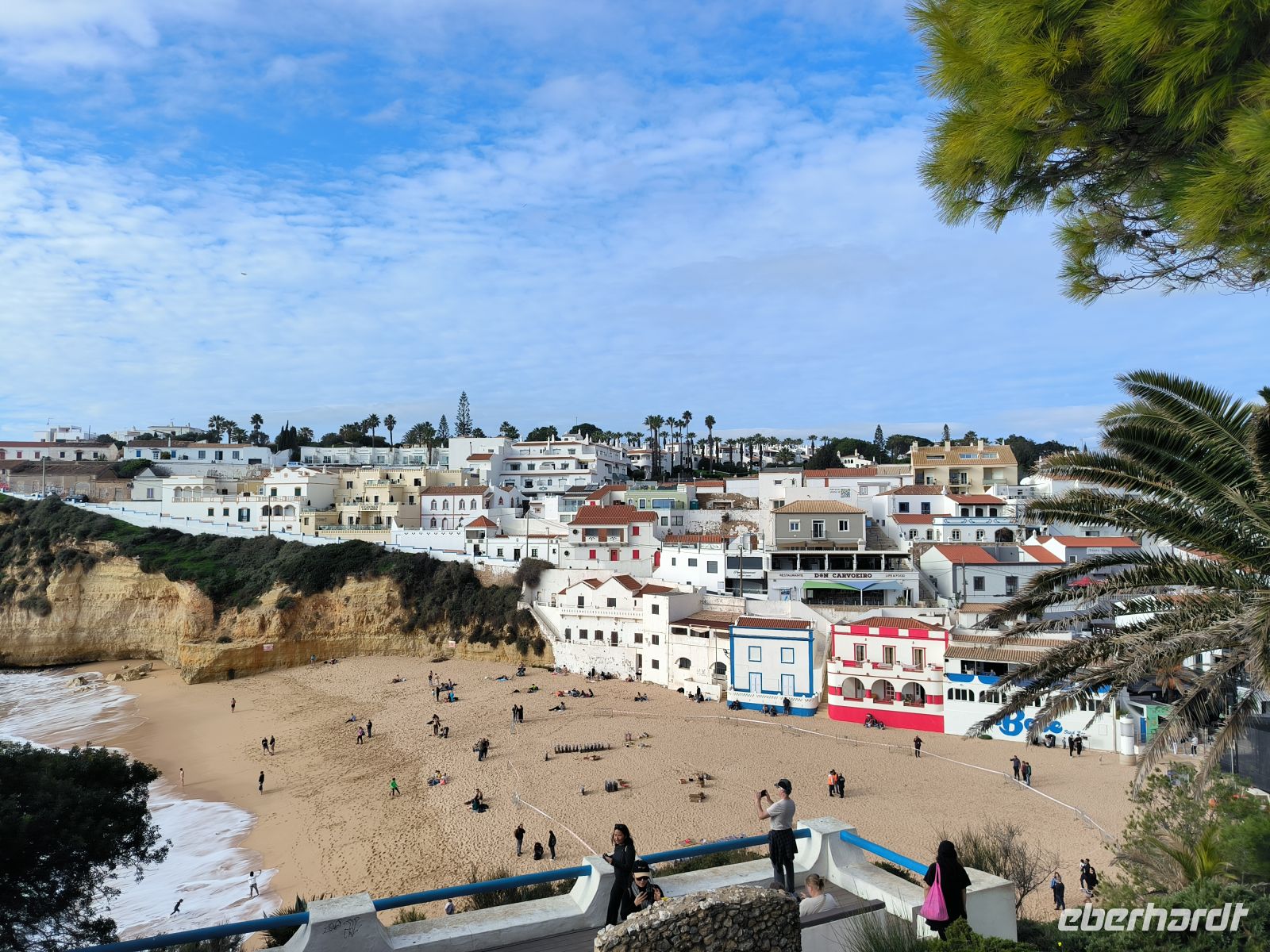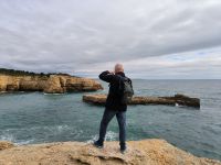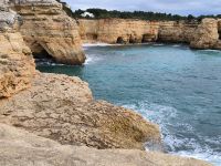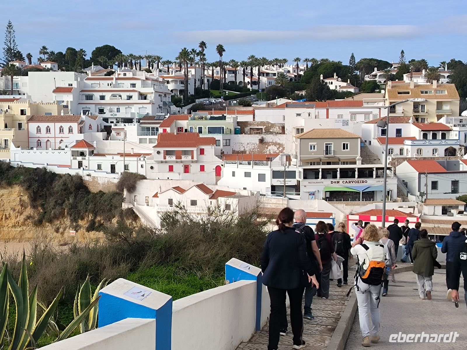 Unser Startpunkt ist an der Kapelle Nossa Senhora da Rocha. Die hübsche, weiße Pilgerkapelle liegt auf einem Felsvorsprung, von dem aus wir die ersten Ausblicke auf das typische ockerfarbene Gestein der Felsagarve haben. Wir wandern entlang der teilweise steilen Südküste mit gewaltigen Felsformationen, schroffen Klippen und romantischen Strandbuchten. Es geht hinauf und hinab. Wir staunen über ein Paar, das diesen Weg mit dem Fahrrad bewältigt. Unterwegs eröffnen sich uns immer wieder tolle Ausblicke auf das Meer. Oberhalb des Strandes Praia da Marinha wird es Zeit für ein Picknick. Heike hat leckeres Gebäck und portugiesischen Roséwein besorgt. Eine schöne Einstimmung auf den Abend. Der letzte Abschnitt der Wanderung führt bequem auf dem Holzweg bis nach Carvoeiro. Das einst idyllische Fischerdorf ist heute einer der beliebtesten Urlaubsorte mit bunten Häusern und schönen Stränden. Von dort bringt uns Busfahrer Stepan zurück zum Hotel, wo wir uns dankbar von ihm verabschieden.