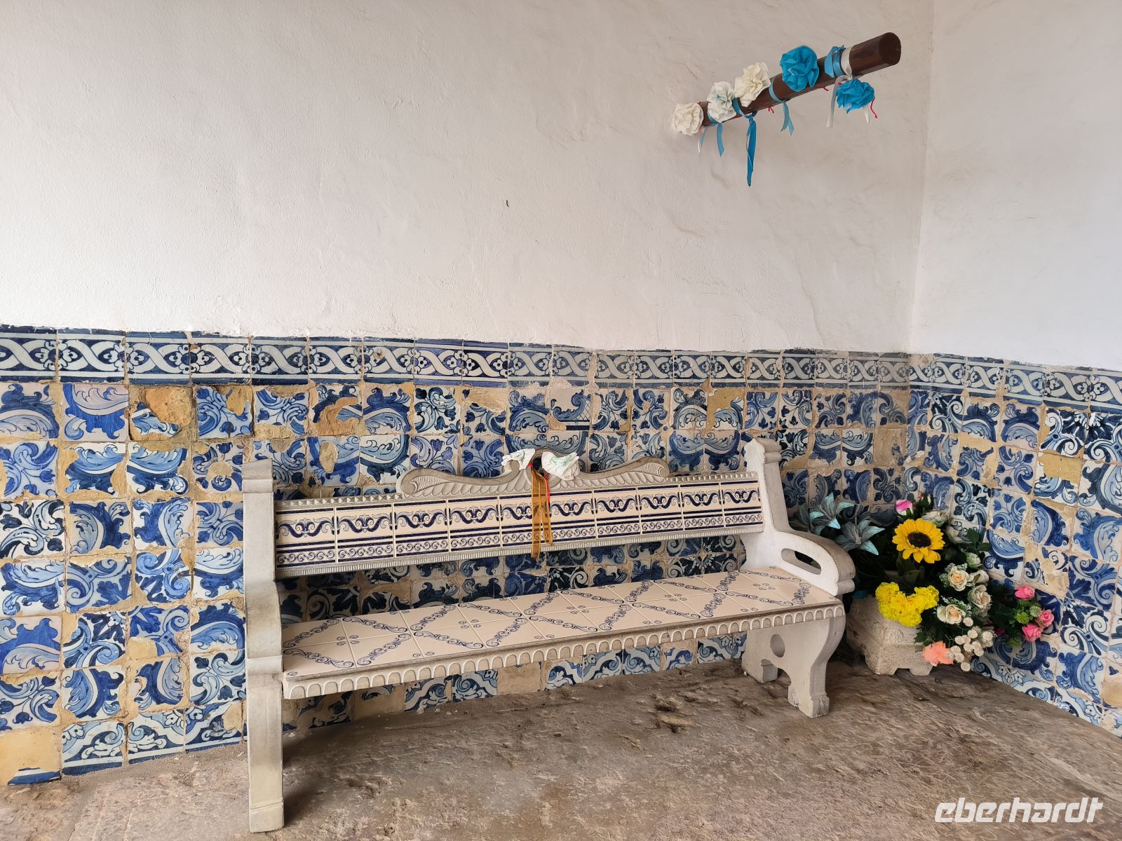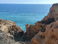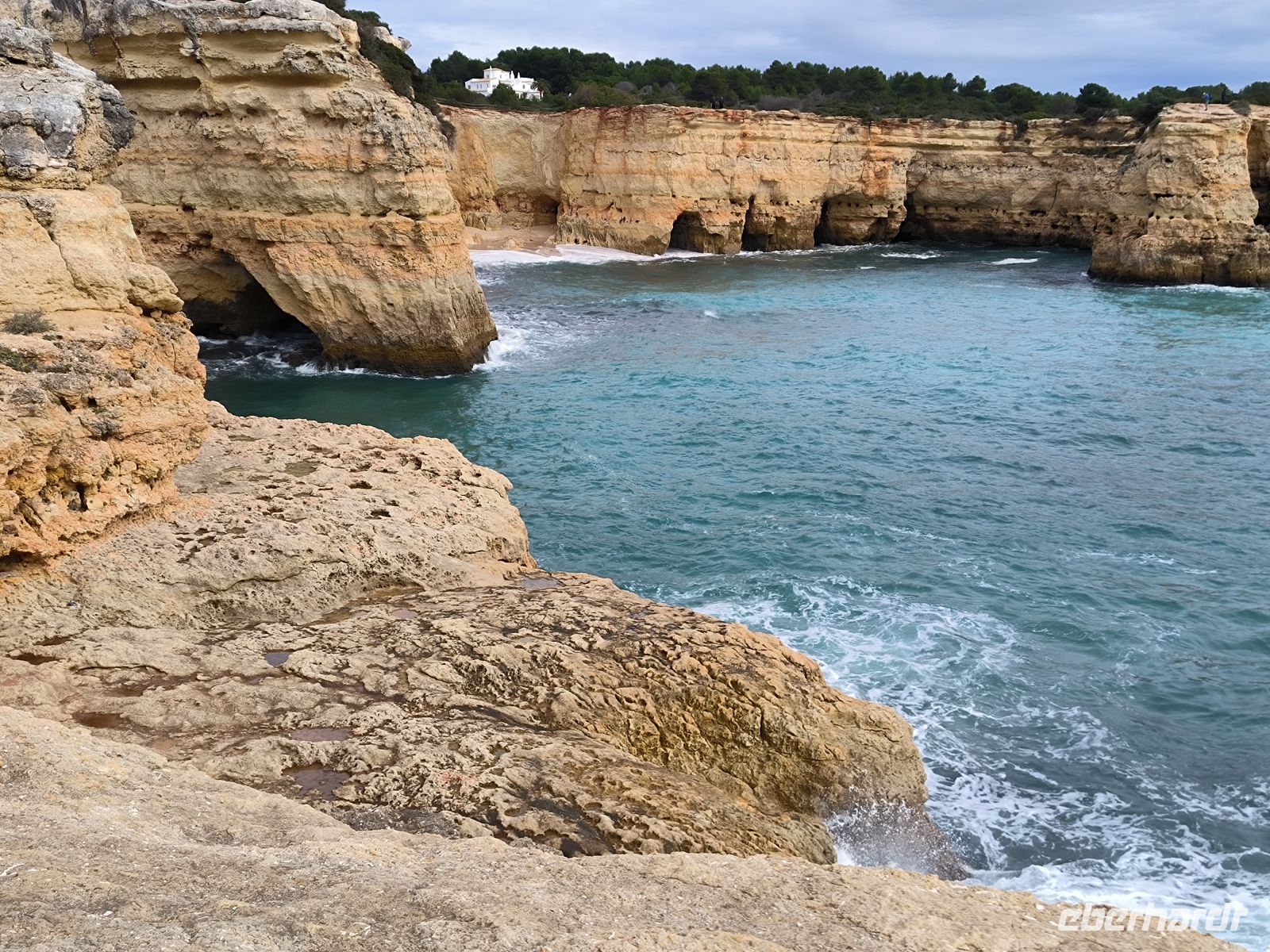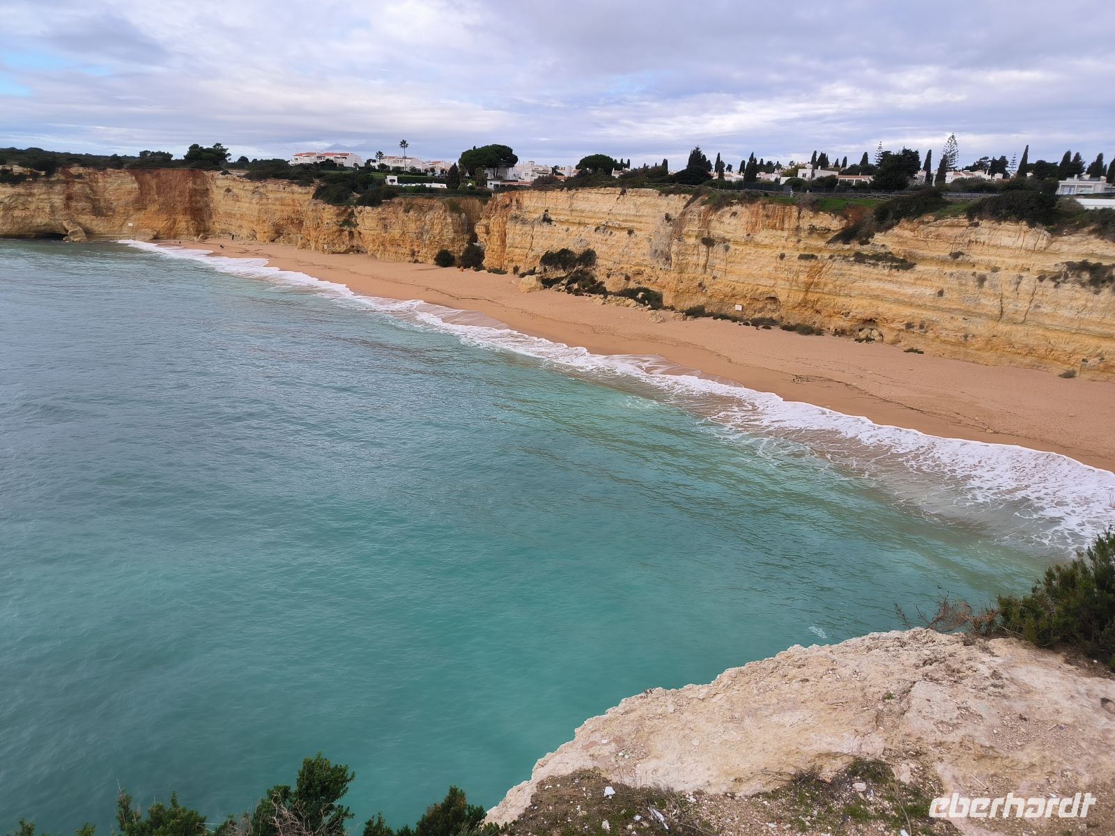 Unser Startpunkt ist an der Kapelle Nossa Senhora da Rocha. Die hübsche, weiße Pilgerkapelle liegt auf einem Felsvorsprung, von dem aus wir die ersten Ausblicke auf das typische ockerfarbene Gestein der Felsagarve haben. Wir wandern entlang der teilweise steilen Südküste mit gewaltigen Felsformationen, schroffen Klippen und romantischen Strandbuchten. Es geht hinauf und hinab. Wir staunen über ein Paar, das diesen Weg mit dem Fahrrad bewältigt. Unterwegs eröffnen sich uns immer wieder tolle Ausblicke auf das Meer. Oberhalb des Strandes Praia da Marinha wird es Zeit für ein Picknick. Heike hat leckeres Gebäck und portugiesischen Roséwein besorgt. Eine schöne Einstimmung auf den Abend. Der letzte Abschnitt der Wanderung führt bequem auf dem Holzweg bis nach Carvoeiro. Das einst idyllische Fischerdorf ist heute einer der beliebtesten Urlaubsorte mit bunten Häusern und schönen Stränden. Von dort bringt uns Busfahrer Stepan zurück zum Hotel, wo wir uns dankbar von ihm verabschieden.