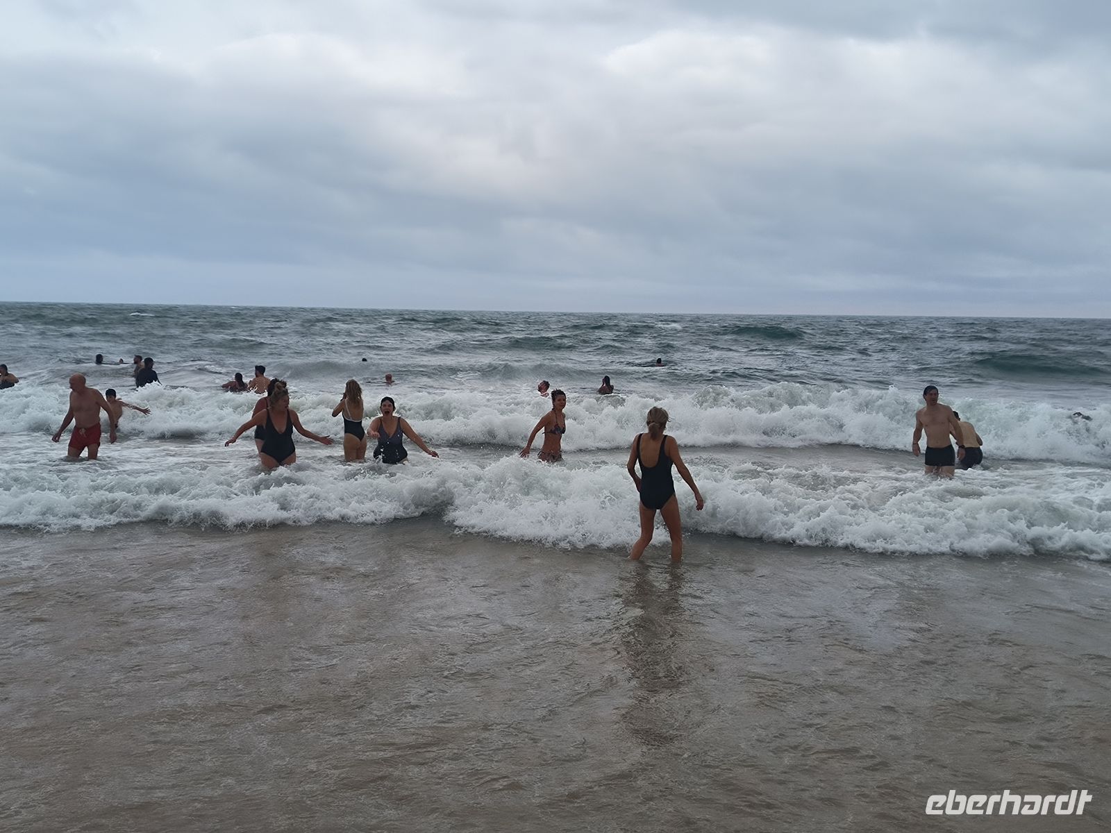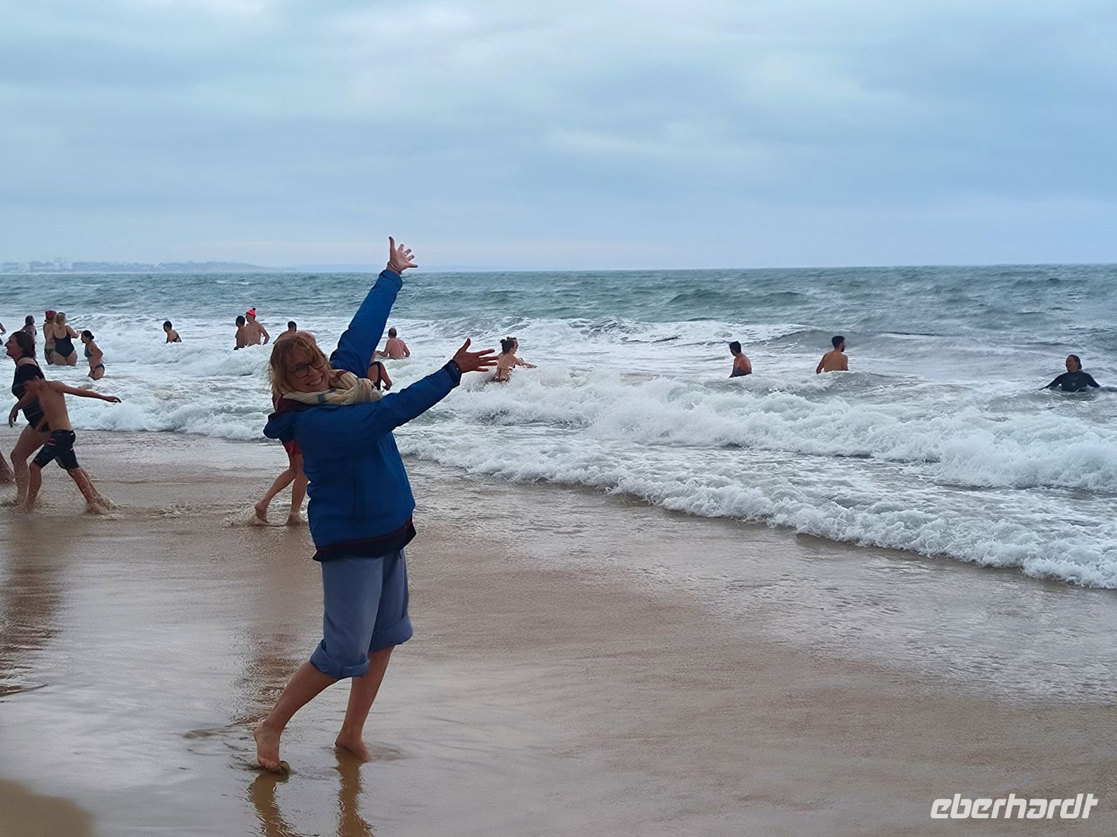 Nach einem späten Frühstück hat uns Heike an den Strand gerufen. Hier findet heute das traditionelle Anbaden statt. Am Neujahrstag um 11 Uhr gehen jede Menge Portugiesen an den Strand von Meia Praia in Lagos, um ihr erstes Bad des Jahres zu nehmen. Diese Erfahrung soll die Knochen härten und den Geist reinigen. Also sind wir dabei. Die meisten von uns nur mit den Füßen, eine schafft es sogar, sich ganz in die Fluten zu stürzen. Und dann wird auch noch gesungen. Heike hat gedichtet, auf die Melodie von „Freude schöner Götterfunken“ singen wir: