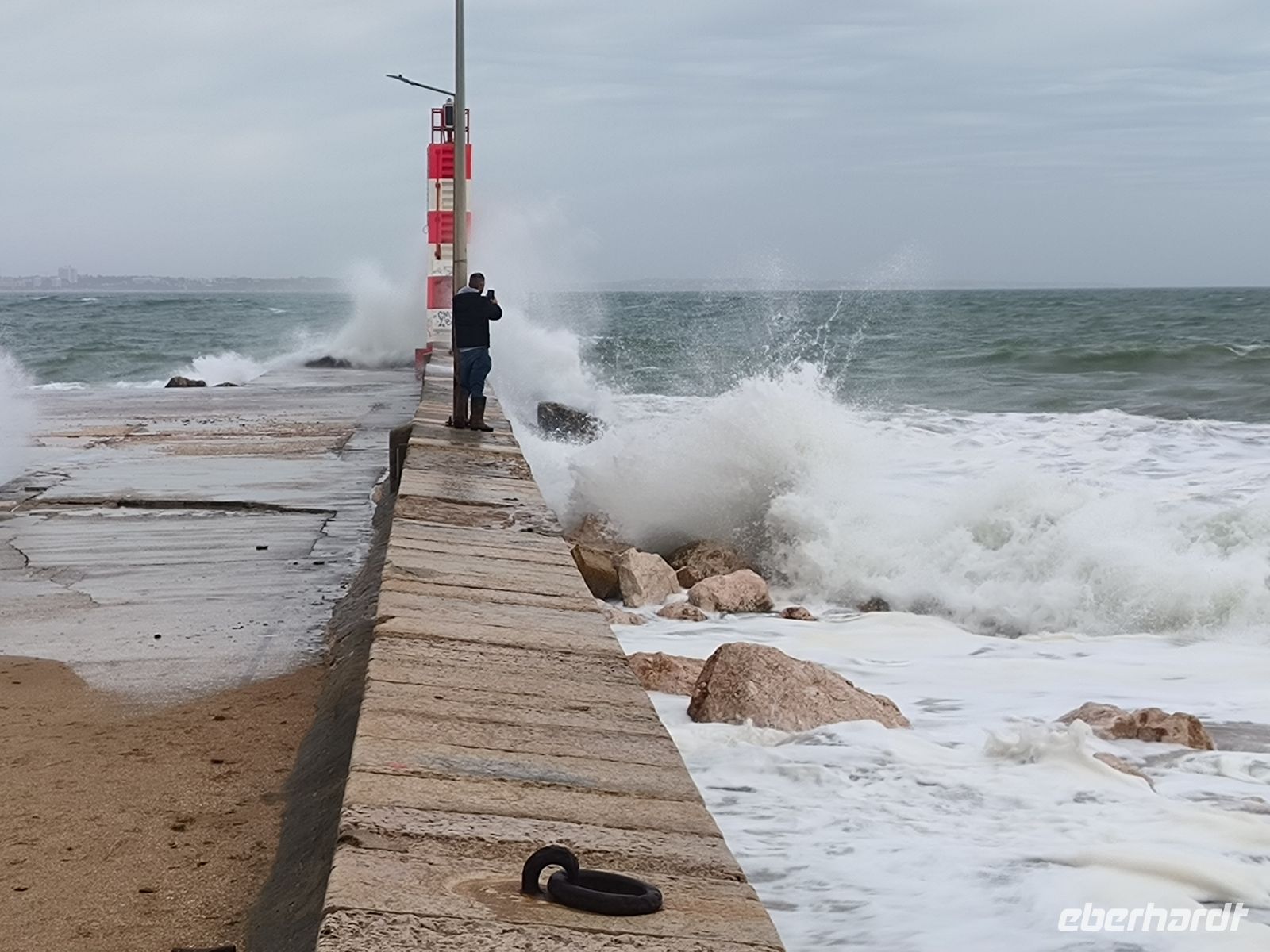Heute wäre ja eigentlich unsere Wanderung geplant gewesen und die Wettervorsage kündigt noch immer Dauerregen an. Trotzdem machen wir uns auf den Weg nach Lagos. Einige starten sogar noch einmal eine kleine Küstenwanderung. Und das ist auch gut so. Denn der Regen bleibt vorerst aus und es kommt sogar die Sonne durch. Andere gehen noch ein bisschen shoppen, trinken Kaffee in der Sonne oder entspannen sich bei einem Glas Sangria. Fast alle sind schon wieder im Hotel, als doch der Regen kommt. Und er kommt heftig, mit viel Wasser und viel Wind. Für manche eine unfreiwillige Dusche …