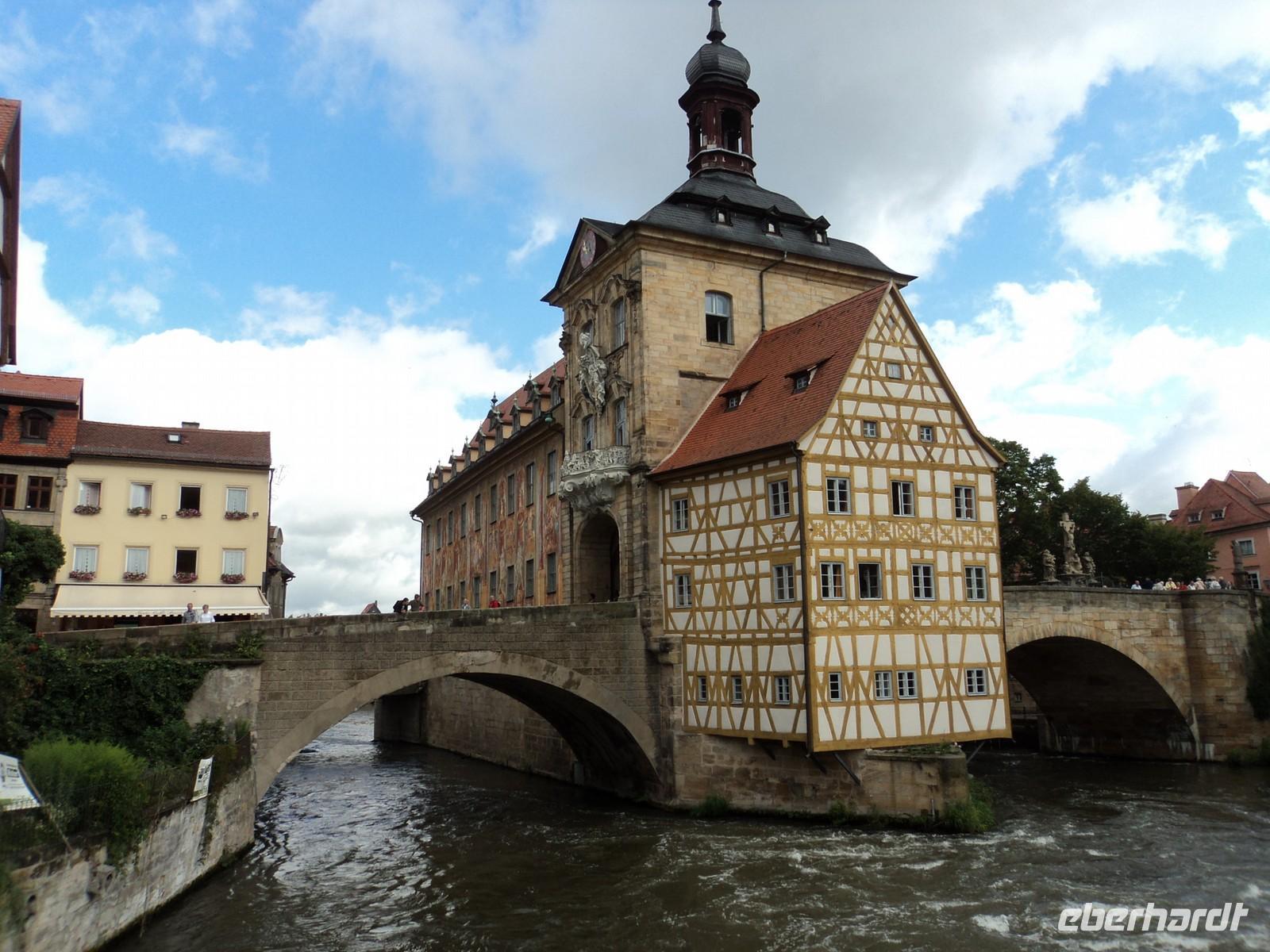 Unsere Fahrt auf dem Kanal ist zu Ende. 171km und 16 Schleusen hat unser Schiff hinter sich gelassen. Der Hafen liegt etwas außerhalb der Stadt, sodass wir wieder mit dem Bus ins Zentrum fuhren. Drei Stadtführer warteten bereits, um uns die Sehenswürdigkeiten der Stadt zu zeigen. Besonders das farbenfrohe alte Rathaus inmitten der Regnitz ist ein Unikat.
