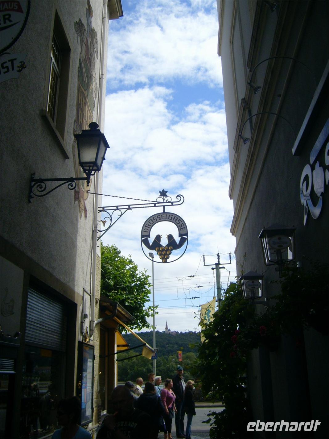 Gegen 14.00 Uhr legte die “MS Rigoletto“ relativ weit vom Zentrum Rüdesheims an. Für unsere Gäste bestellten wir den Rüdesheimer Winzerexpress. Er bzw. Sie da eine Dame am Steuer saß, fuhr uns durch die Weinberge, vorbei am Niederwalddenkmal, an der Drosselgasse bis zu Siegfrieds mechanischen Musikkabinett. In Gruppen besuchten wir dieses interessante Museum. Danach ging es durch die weltberühmte, nur 3 Meter breite und 144 lange Drosselgasse.