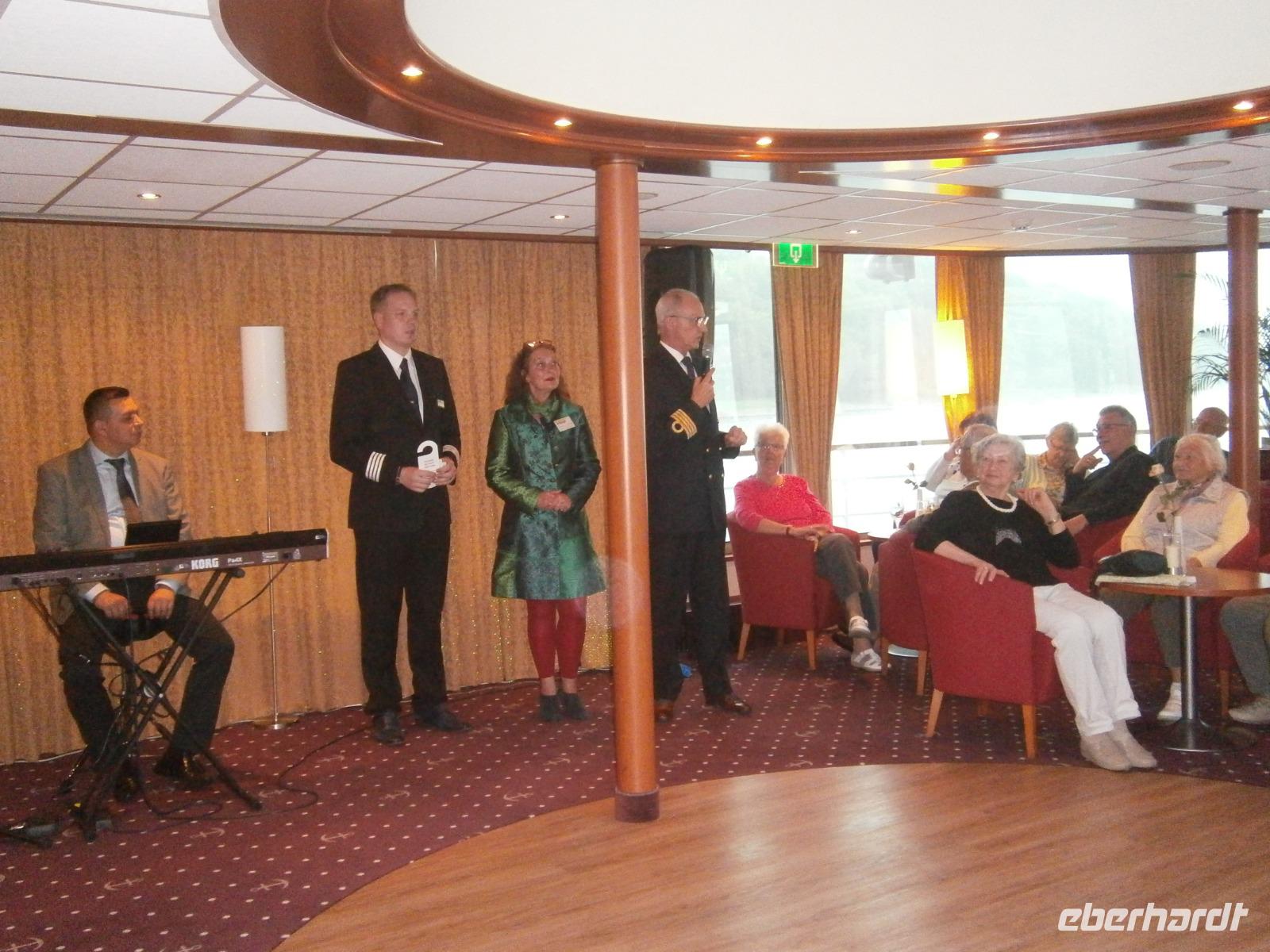 Von Vilshofen führte uns die Fahrt auf der Donau am Vormittag nach Passau, wo am Nachmittag ein Stadtrundgang gebucht war. Auch hier wartete schon ein einheimischer Stadtführer auf uns, der sachkundig und humorvoll die Sehenswürdigkeiten seiner Heimatstadt, wie den Residenzplatz mit seinen alten Patrizierhäusern mit ihrer Fassadenmalerei und den beeindruckenden St.Stephans Dom. In der anschließenden Freizeit ließen es sich einige Reisegäste im von ihm empfohlenen Kaffeehaus gut gehen. Nachmittags kehrten wir an Bord zurück. Man erwartete uns im Salon zu einem Abschiedscocktail. Kapitän, Mannschaft und Reiseleitung verabschiedeten sich schweren Herzens von den Reisegruppen, die- trotz des nicht immer schönen Wetters- die Fahrt auf den Flüssen, die Ausflüge in wunderschöne Städte und das Verwöhnprogramm an Bord täglich genossen haben. Höhepunkt des Abends war danach das festliche Kapitänsdinner, danach konnte man sich, wie allabendlich, an Josefs Live-Musik erfreuen und das Tanzbein schwingen. Der Tag endete wieder mit einem Late Night Snack.