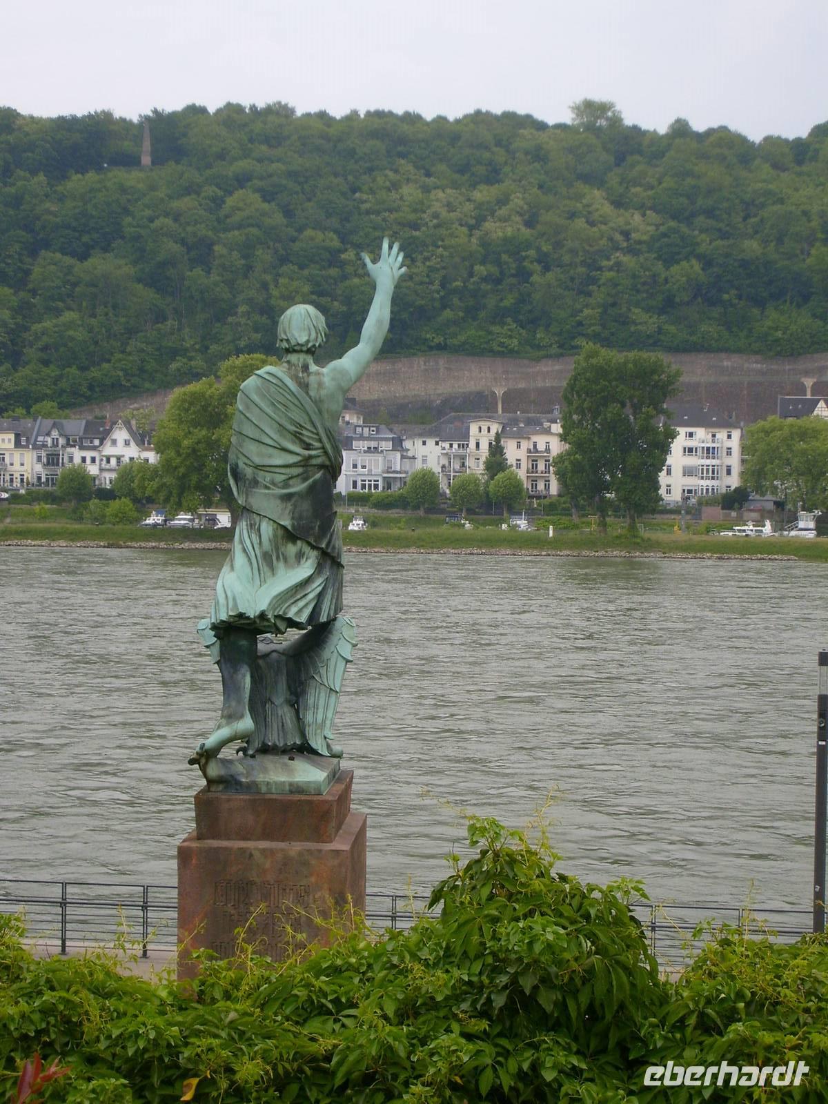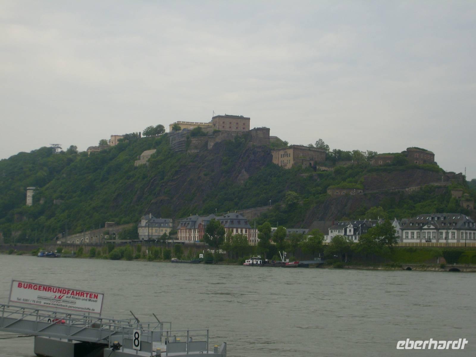 Koblenz mit dem Deutschen Eck, der Mündung der Mosel in den Rhein. Dort legen wir gegen 14.00Uhr an. Die Stadtführung beginnt direkt ab Schiff. Viele Gäste waren schon 2011 in Koblenz zur Bundesgartenschau. Die Festung Ehrenbreitstein hoch über der Stadt dominiert die Seite des Ortes Ehrenbreitstein. Die Seilbahn, mit den 18 Gondeln, überspannt den Rhein vom Deutschen Eck zur Festung Ehrenbreitstein. Sie brachte die Gäste der Bundesgartenschau 2011 hinauf auf das Ausstellungsgelände zur Festung und ist noch heute in Betrieb. Nach der Stadtführung nutzten viele Gäste in der Freizeit diese Möglichkeit. Von dort oben hat man einen herrlichen Blick auf den Rhein und die Gebirge der Umgebung. Den Abend und die Nacht ankerte das Schiff in Koblenz. Wer nicht noch einen Abendspaziergang zum beleuchteten Kaiser Wilhelm Denkmal oder zum Koblenzer Schloss machen wollte, vergnügte sich bei internationalen Melodien im Salon mit Bordmusiker Rudolf.