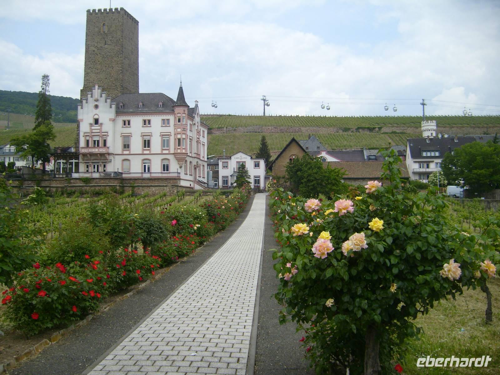 Gegen 10.00 Uhr passieren wie den Loreleyfelsen am km 555. Natürlich ertönt aus den Lautsprechern die berühmte Melodie nach dem Gedicht von Heinrich Heine und wir stimmen darin ein. Viele berühmte Dichter, Sänger und Maler haben diesen Abschnitt als den schönsten des Rheinverlaufes bezeichnet. Auch wir sind begeistert und die Fotoapparate klicken ständig. Während unseres Mittagessens erreichen Rüdesheim, mit der Germania hoch oben auf dem Weinberg auf der linken Seite und Bingen mit dem Mäuseturm auf der rechten Seite. Um 14.30Uhr holt uns die „Winzerbahn“ zur Fahrt durch die Weinberge ab. Während der Fahrt erfahren wir viel zur Geschichte des Weinanbaus. Die berühmte Äbtissin Hildegard von Bingen hat hier gewirkt. Der Ort Rüdesheim ist zu jeder Jahreszeit ein Touristenmagnet. Wir steigen aus und besuchen Siegfrieds Musikkabinet. Ein muß ist danach die Drosselgasse. Am heutigen Pfingstsonntag ist die berühmte, nur 3m breite und 155m lange Drosselgasse total verstopft. Aber es muß sein, wir kämpfen uns durch. Genießen in einem der vielen Lokale einen „Rüdesheimer Kaffee“. Diese Spezialität aus Kaffee, Weinbrand, Sahne und Schokolade hat es in sich. Einfach köstlich. Danach noch einen Riesling und am späten Nachmittag geht es zurück zum Schiff. Die MS Rigoletto bleibt über Nacht in Rüdesheim. Erst gegen 4.00Uhr legen wir ab. Das Ziel ist Speyer.