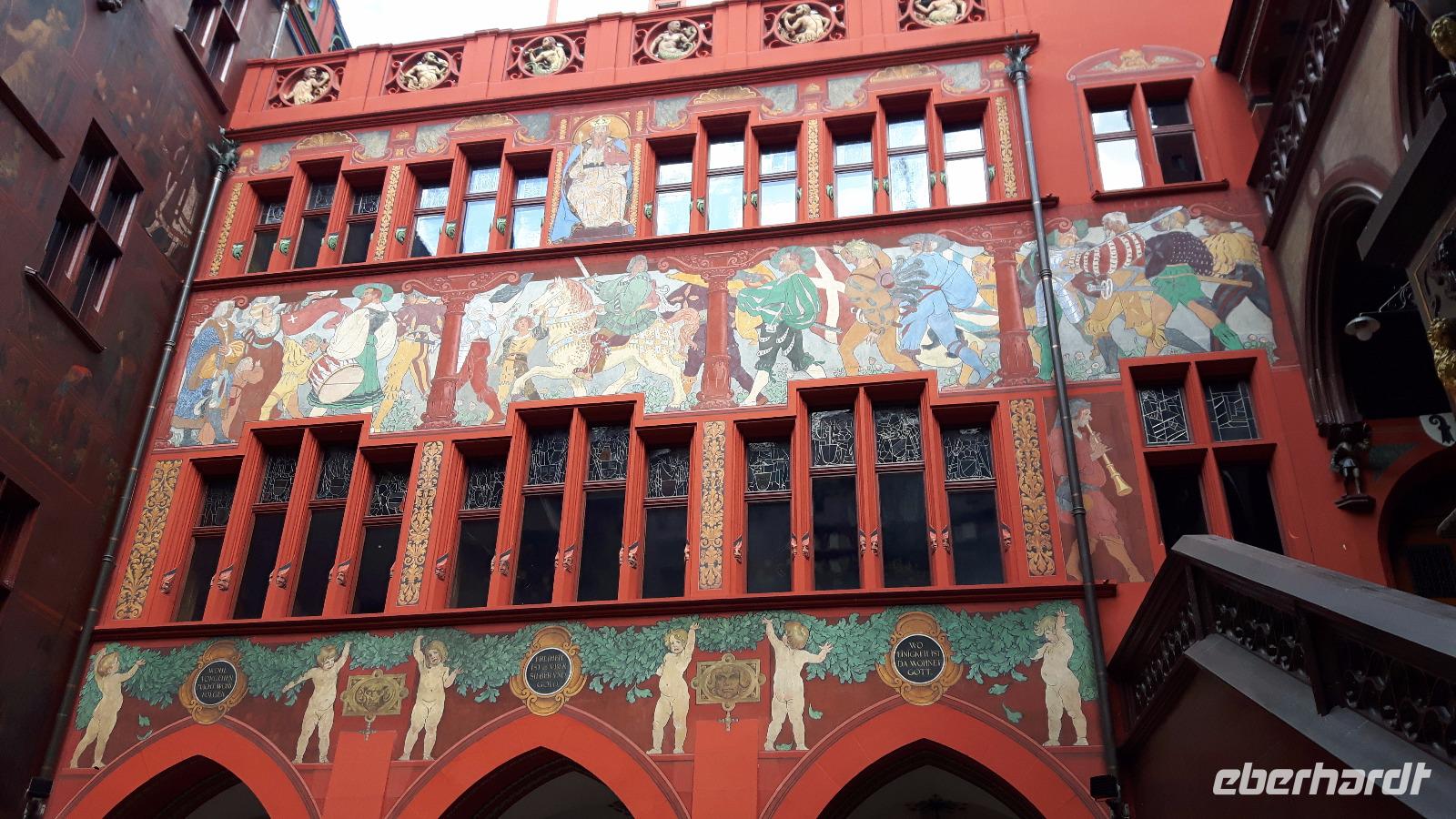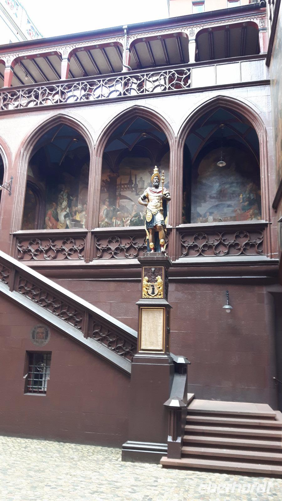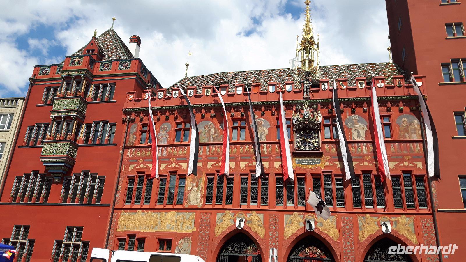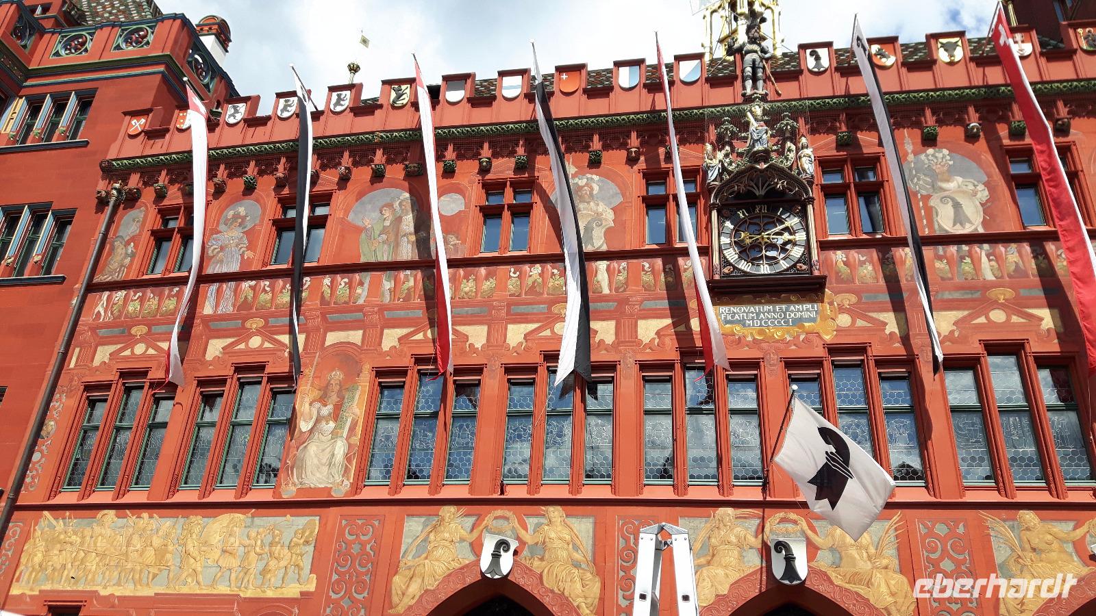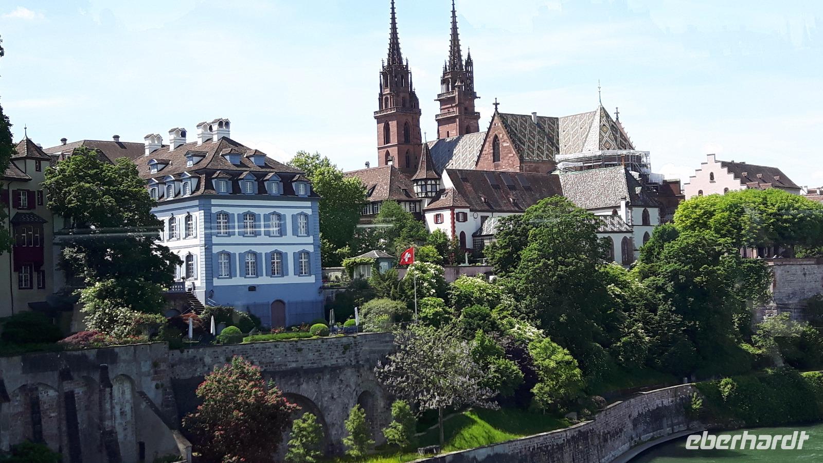 Während des Mittagessens sehen wir das Dreiländereck. Ein unspektakuläres Denkmal. Hätte uns die Bordreiseleiterin, Heike von Weber nicht darauf aufmerksam gemacht, wir hätten es übersehen. Am Steiger St.Johann beginnt 13.00 Uhr die Stadtrundfahrt durch Basel. Am Münster steigen alle Gäste aus. Von der Terrasse haben wir einen phantastischen Blick auf die schweizerische Stadt am Rhein. Es folgt ein Spaziergang in die Innenstadt bis zum Rathaus. Die teuren Geschäfte in der Stadt sind für uns keine Gefahr, es ist Sonntag und somit sind alle geschlossen. Nach kurzer Freizeit treffen wir uns am Bus der am Tengelibrunnen auf uns wartet. Am Schiff angekommen heißt es, schnell duschen und sich schön machen für das Kapitänsdinner. Auch Jürgen unser Busfahrer ist zu diesem festlichen Abend eingeladen. Natürlich auch der Busfahrer von Panoramica. Um 18.00Uhr geht es los. Kapitän und Schiffseigner Teun Sijbrands und seine Crew laden zum Kapitäns Cocktail in den Salon.