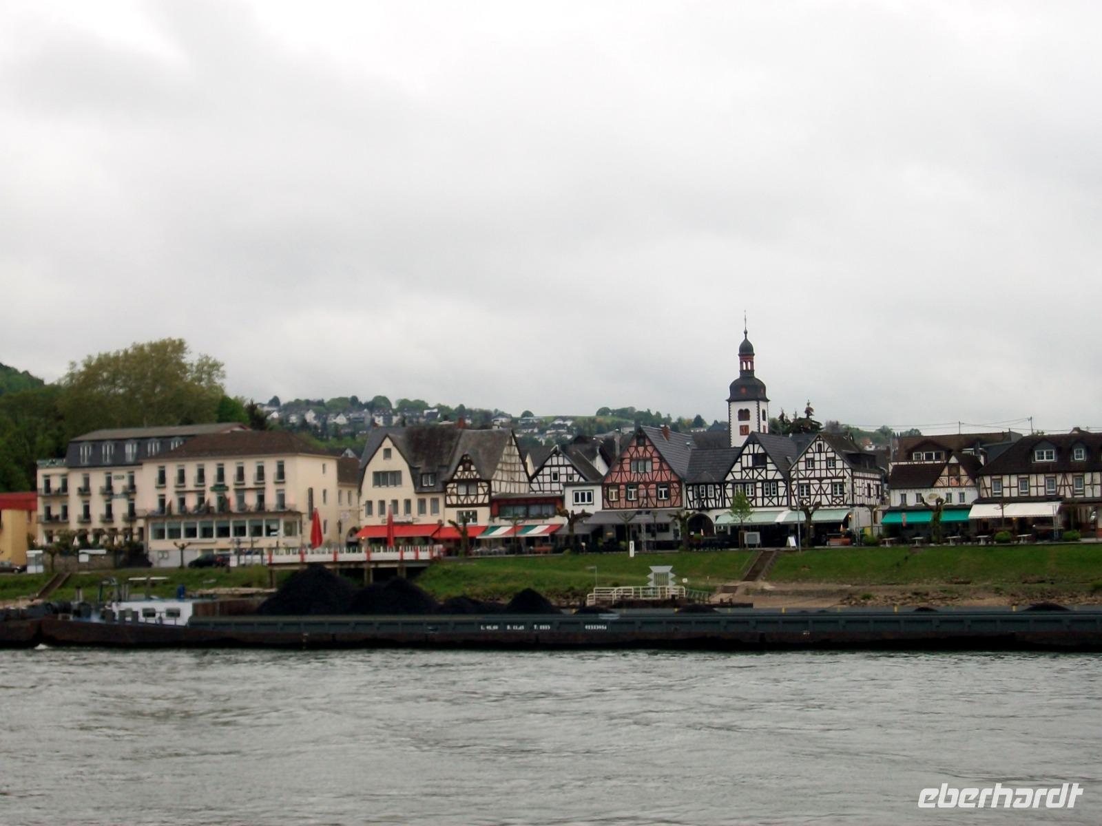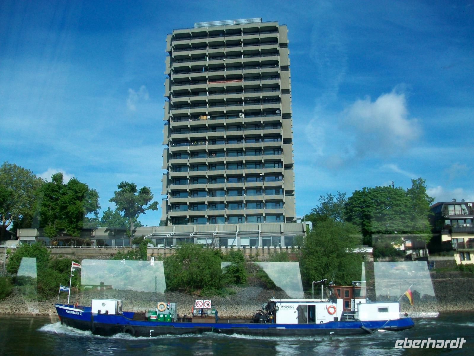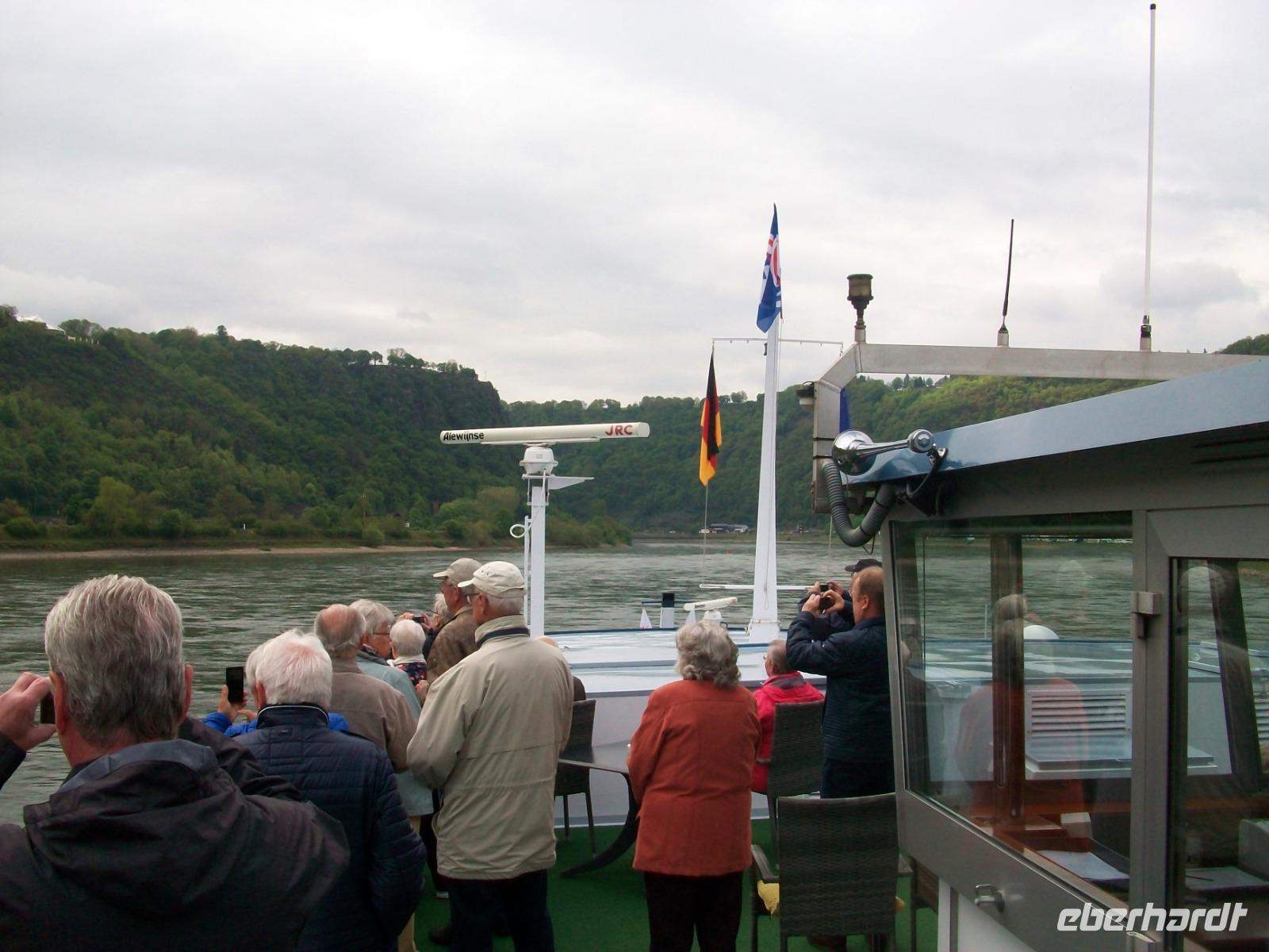 4.5.2019. Gegen sechs startet der Kapitän die Motoren, wir liegen zu dieser Zeit noch in den Betten. Dann geht es zum Frühstück und in dieser Zeit gelangen wir entlang der ehemaligen Bundeshauptstadt Bonn weiter den Rhein hinauf. Leider hat auch heute der Wettergott kein Einsehen mit uns; graue Wolken hängen am Himmel und es ist kühl. Weil es mit dem Sonnendeck vorerst nichts wird, genießen wir im gut geheizten Salon all die Höhepunkte die uns die heutige Fahrt bringt.