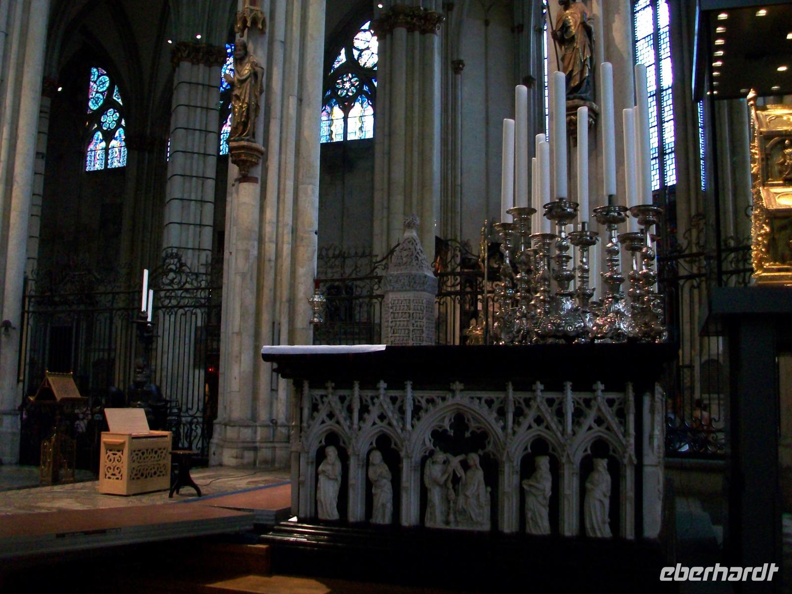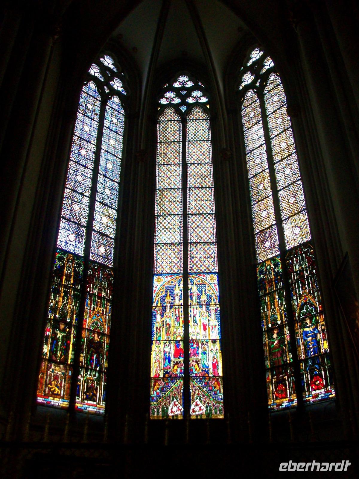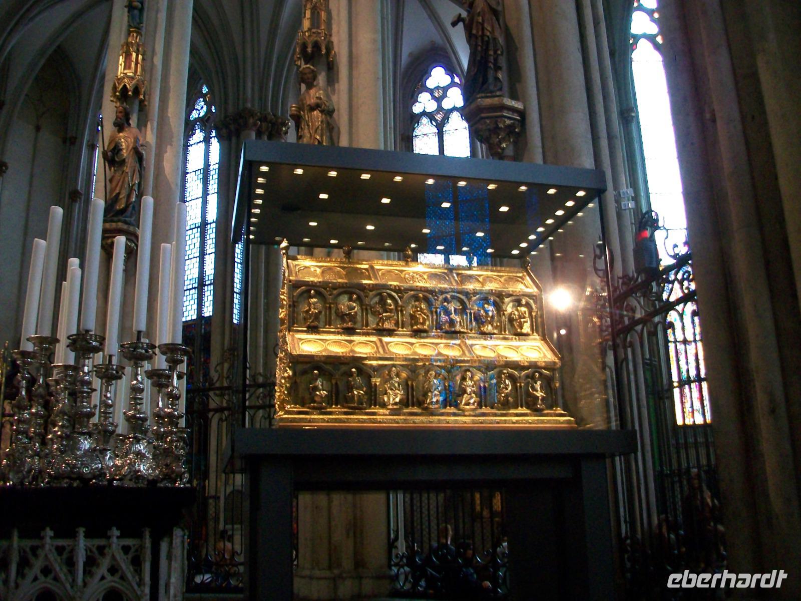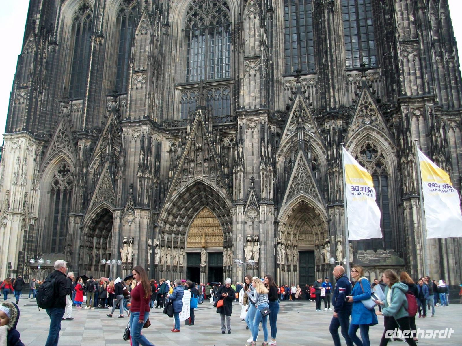 Der Morgen beginnt trüb, trotzdem genießen wir eine schöne Fahrt. Frühstück und Mittagessen liegen hinter uns als wir in Düsseldorf festmachen. Hier erwarten uns schon die Busse, es geht nach Köln. Während die „Rigoletto" Rheinaufwärts schippert, gelangen wir auf dem Landweg in die Domstadt. Mächtig streben die zwei Türme der Kathedrale gen Himmel; geniale Baumeister einer längst vergangenen Zeit erschufen dieses Wunder welches wir nun besuchen werden. Mit sehr kompetenten Domführern erschließen wir uns dieses Hauptwerk der Gotik, staunen über die schönen Glasfenster, das riesige Hauptschiff und am goldenen Reliquiar der Heiligen Drei Könige halten wir den Atem an. Leider ist das Wetter doch recht kühl, dennoch gönnen wir uns noch etwas Freizeit um einen Blick in die Fußgängerzone zu werfen.