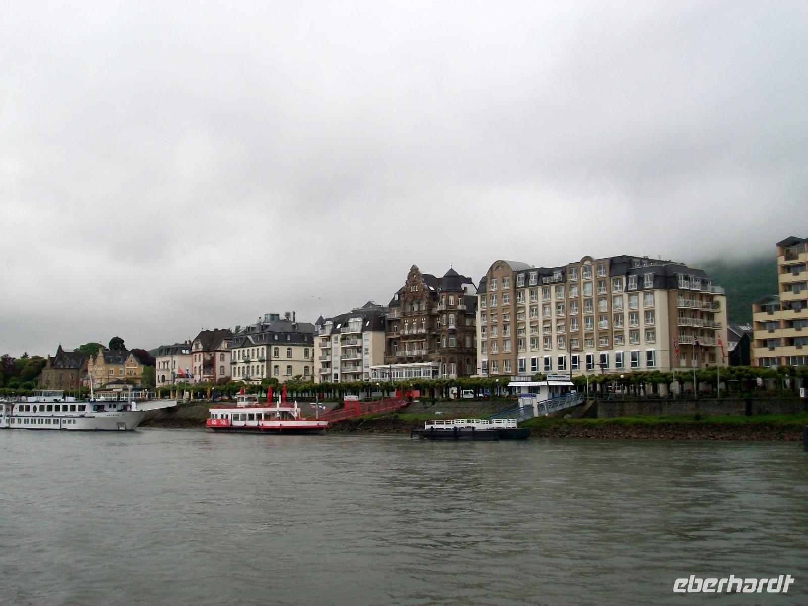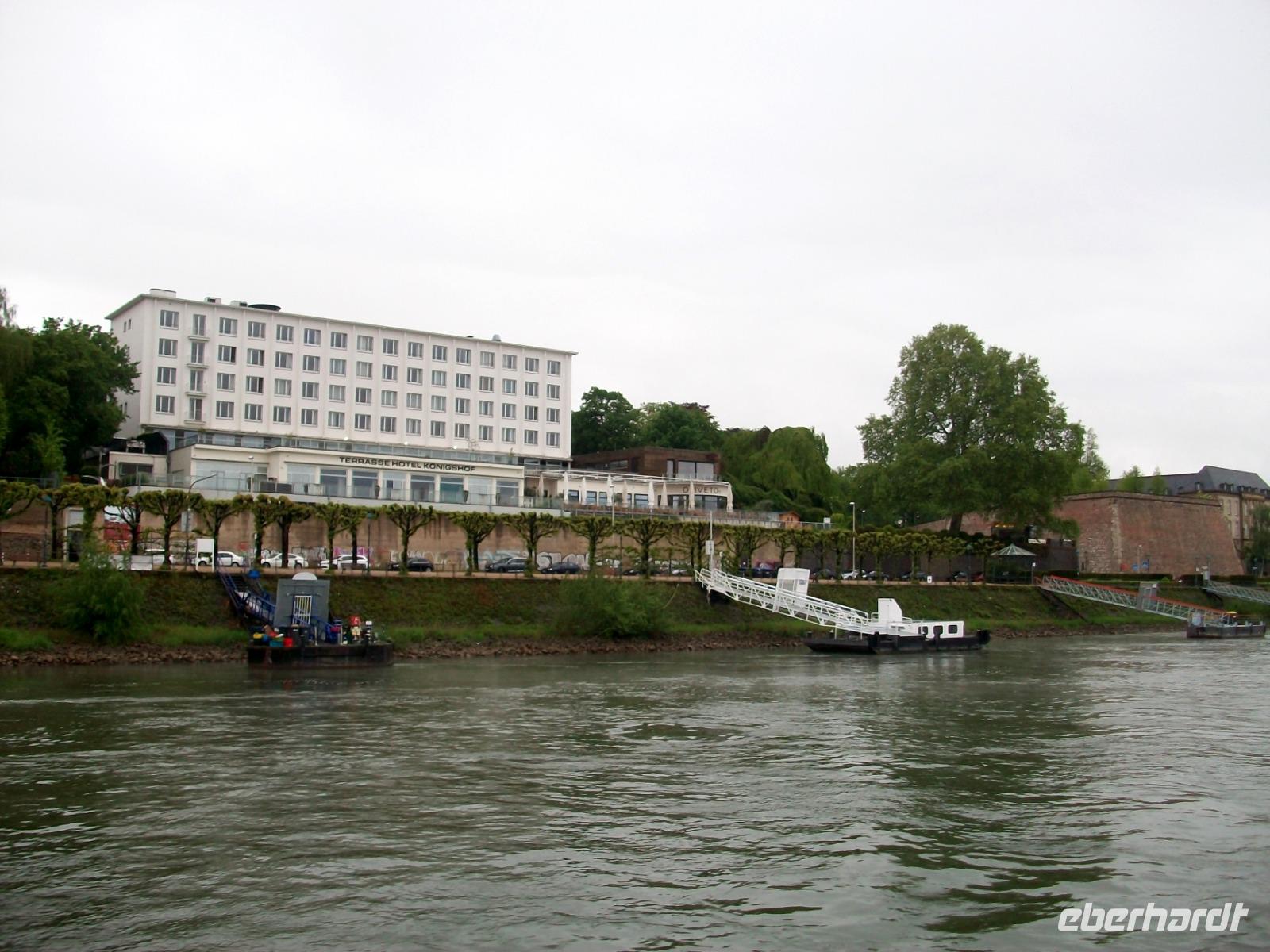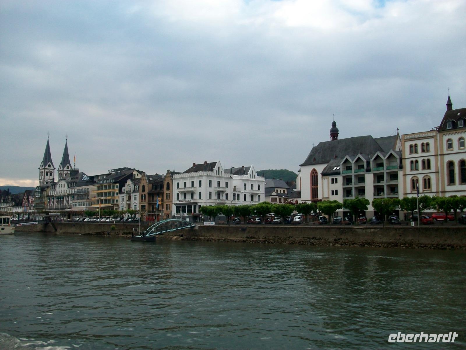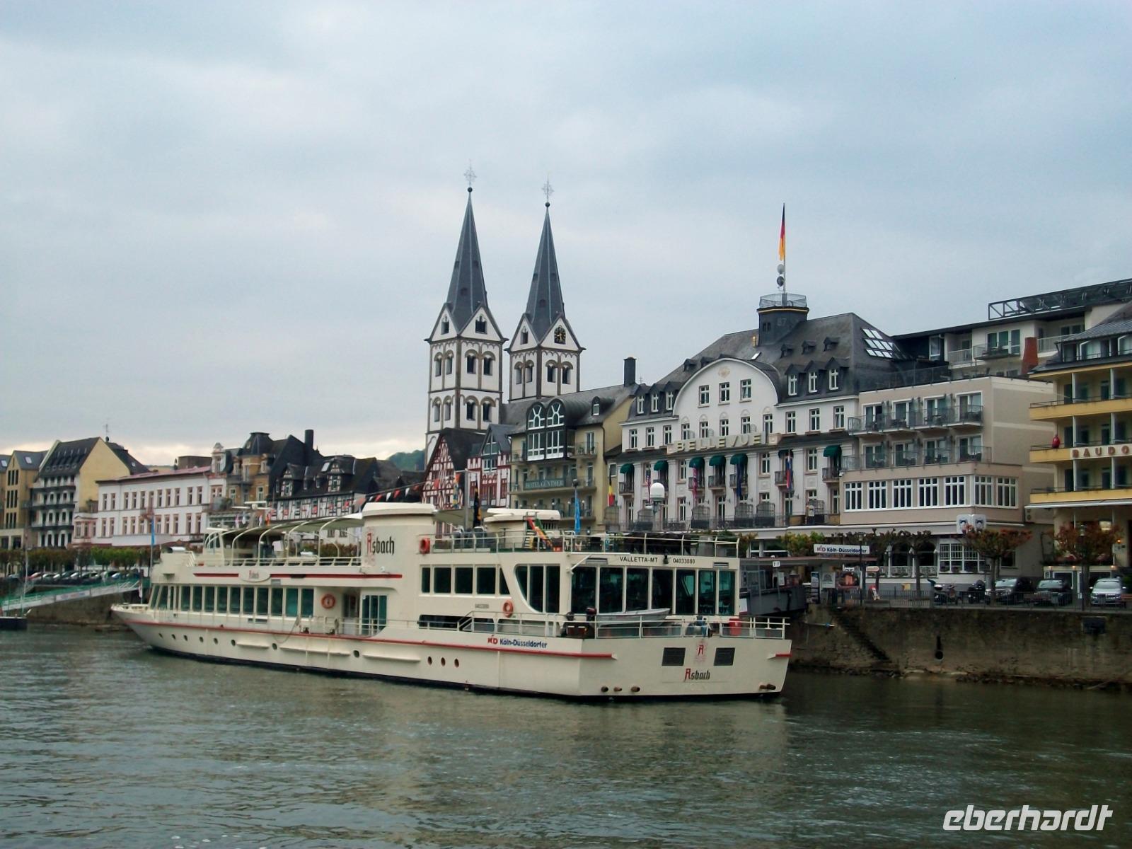 Nachdem wir Bonn passiert haben, wird es wieder grün, wir sehen kleine Kirchen, pittoreske Häuser und lassen uns die gute Laune von Petrus gar nicht verderben. Doch bald kommt unser heutiges Ziel in Sicht. Wir sehen links oben die mächtige Festung Ehrenbreitstein, von rechts mündet die Mosel ein: Wir haben Koblenz erreicht. Die „Rigoletto" macht fest und am Ufer warten schon die Stadtführer die uns nun auf eine Entdeckungsreise in eine wunderschöne Stadt mitnehmen die schon zur Römerzeit große Bedeutung hatte. Als wir durch Gassen und über Plätze schlendern, zeigen sich uns Historie und Moderne gleichermaßen; von den alten Römern ist heute allerdings nichts mehr zu sehen. Dabei erfreut so manch bunte Fassade unser Auge und unsere Stadtführerin weiß so manches zu erzählen von einer Stadt die auch immer mit Wein in Verbindung steht. Dabei vergeht die Zeit wie im Flug; die Führung endet und von Norden naht eine dunkle Wolke. Auf dem Weg zum Rheinufer entlädt sie ihre nasse Last, das aber hindert diejenigen die mit der Seilbahn zur Festung Ehrenbreitstein auffahren wollen nicht, dieses Highlight in Angriff zu nehmen und dabei einen grandiosen Blick vom Aussichtspunkt zu genießen. Am Abend trifft sich unsere Gruppe wieder; nach dem Essen besteht dann noch aufgrund der günstigen Anlegestelle die Möglichkeit dem abendlichen Koblenz einen Besuch abzustatten.