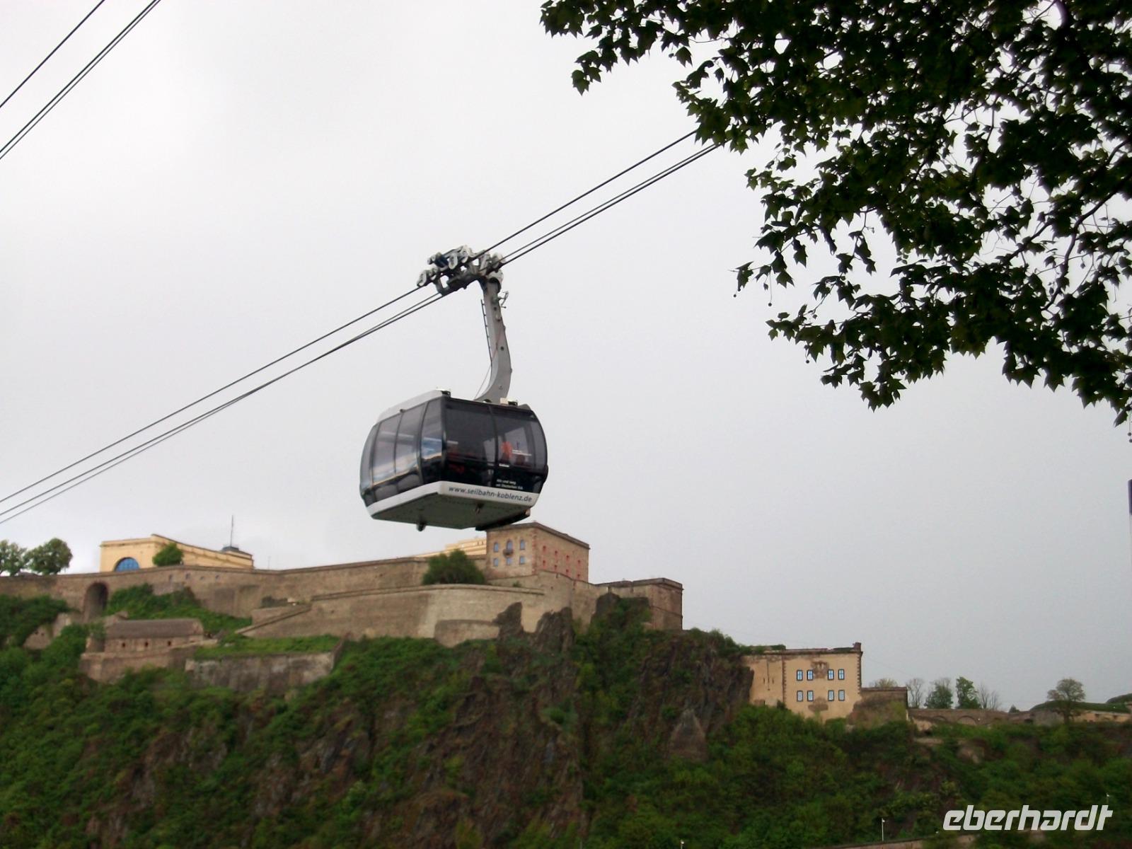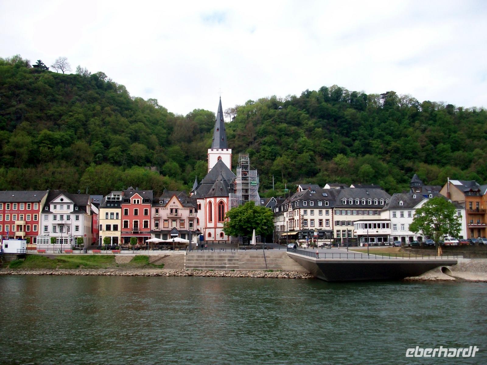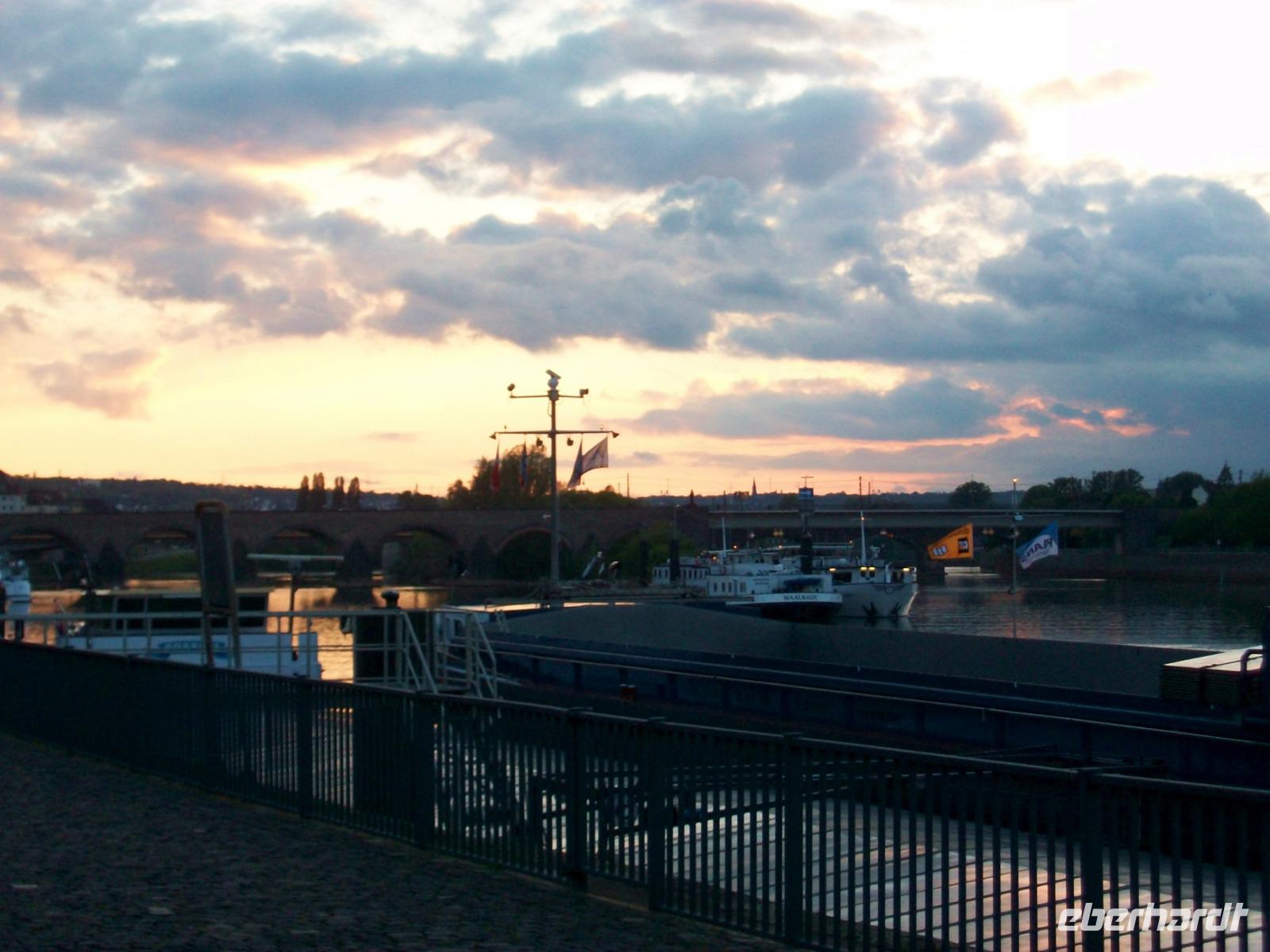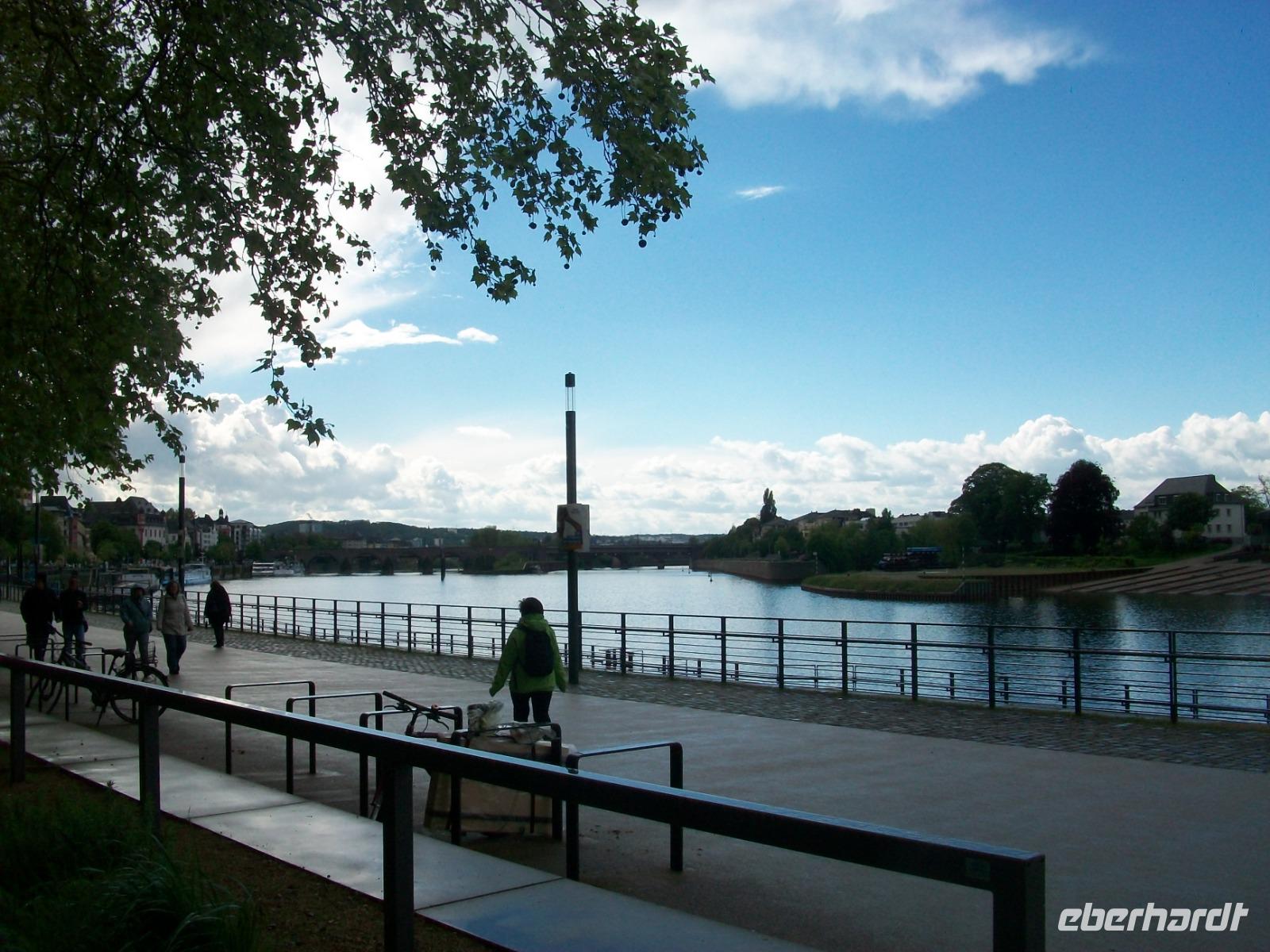 Nachdem wir Bonn passiert haben, wird es wieder grün, wir sehen kleine Kirchen, pittoreske Häuser und lassen uns die gute Laune von Petrus gar nicht verderben. Doch bald kommt unser heutiges Ziel in Sicht. Wir sehen links oben die mächtige Festung Ehrenbreitstein, von rechts mündet die Mosel ein: Wir haben Koblenz erreicht. Die „Rigoletto" macht fest und am Ufer warten schon die Stadtführer die uns nun auf eine Entdeckungsreise in eine wunderschöne Stadt mitnehmen die schon zur Römerzeit große Bedeutung hatte. Als wir durch Gassen und über Plätze schlendern, zeigen sich uns Historie und Moderne gleichermaßen; von den alten Römern ist heute allerdings nichts mehr zu sehen. Dabei erfreut so manch bunte Fassade unser Auge und unsere Stadtführerin weiß so manches zu erzählen von einer Stadt die auch immer mit Wein in Verbindung steht. Dabei vergeht die Zeit wie im Flug; die Führung endet und von Norden naht eine dunkle Wolke. Auf dem Weg zum Rheinufer entlädt sie ihre nasse Last, das aber hindert diejenigen die mit der Seilbahn zur Festung Ehrenbreitstein auffahren wollen nicht, dieses Highlight in Angriff zu nehmen und dabei einen grandiosen Blick vom Aussichtspunkt zu genießen. Am Abend trifft sich unsere Gruppe wieder; nach dem Essen besteht dann noch aufgrund der günstigen Anlegestelle die Möglichkeit dem abendlichen Koblenz einen Besuch abzustatten.