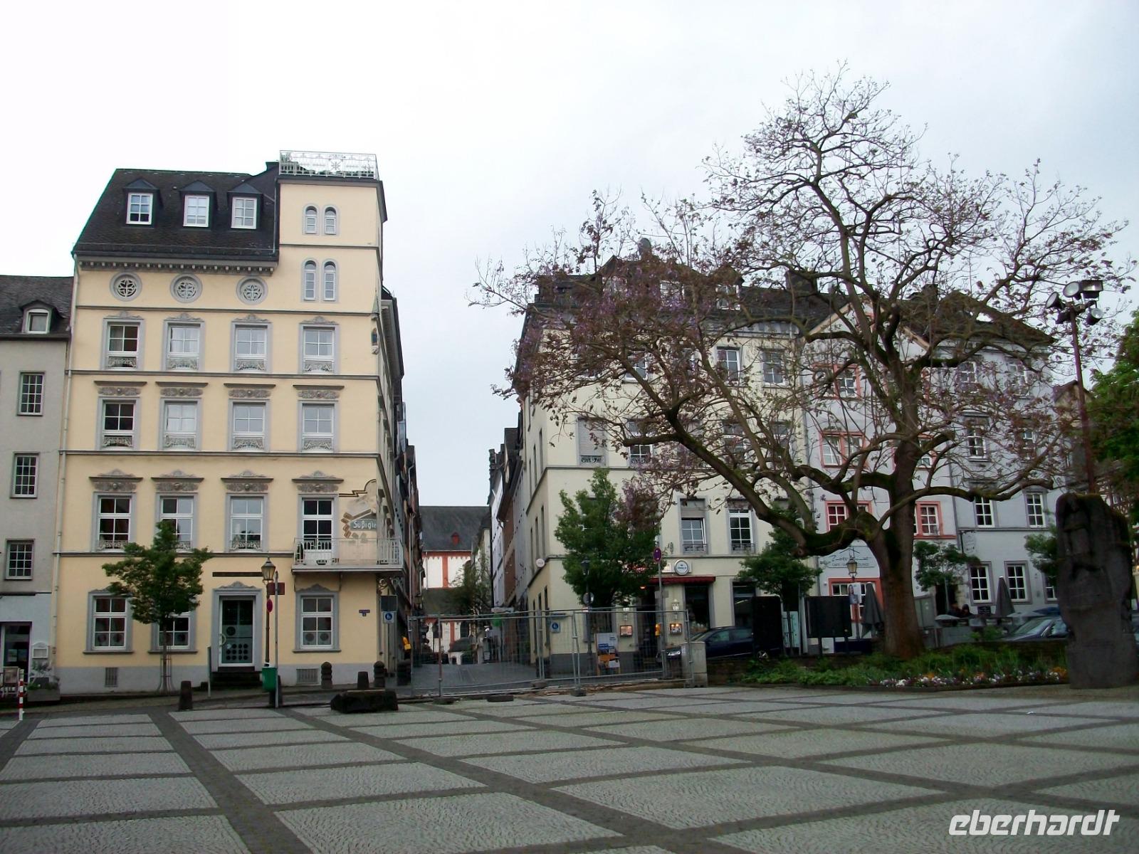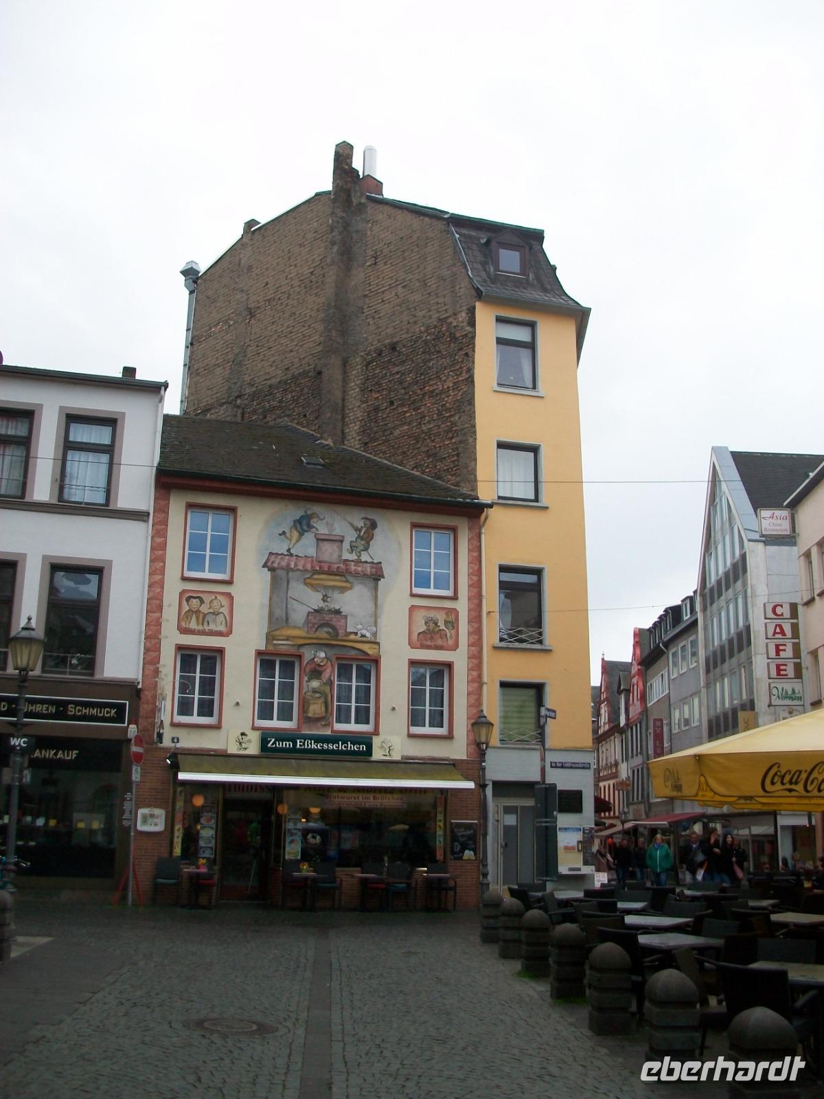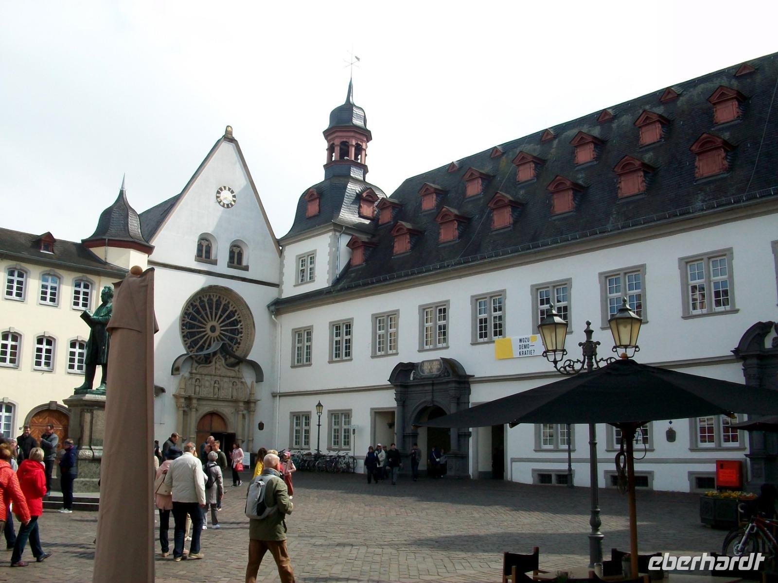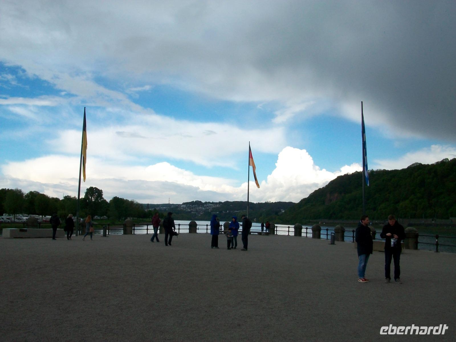 Nachdem wir Bonn passiert haben, wird es wieder grün, wir sehen kleine Kirchen, pittoreske Häuser und lassen uns die gute Laune von Petrus gar nicht verderben. Doch bald kommt unser heutiges Ziel in Sicht. Wir sehen links oben die mächtige Festung Ehrenbreitstein, von rechts mündet die Mosel ein: Wir haben Koblenz erreicht. Die „Rigoletto" macht fest und am Ufer warten schon die Stadtführer die uns nun auf eine Entdeckungsreise in eine wunderschöne Stadt mitnehmen die schon zur Römerzeit große Bedeutung hatte. Als wir durch Gassen und über Plätze schlendern, zeigen sich uns Historie und Moderne gleichermaßen; von den alten Römern ist heute allerdings nichts mehr zu sehen. Dabei erfreut so manch bunte Fassade unser Auge und unsere Stadtführerin weiß so manches zu erzählen von einer Stadt die auch immer mit Wein in Verbindung steht. Dabei vergeht die Zeit wie im Flug; die Führung endet und von Norden naht eine dunkle Wolke. Auf dem Weg zum Rheinufer entlädt sie ihre nasse Last, das aber hindert diejenigen die mit der Seilbahn zur Festung Ehrenbreitstein auffahren wollen nicht, dieses Highlight in Angriff zu nehmen und dabei einen grandiosen Blick vom Aussichtspunkt zu genießen. Am Abend trifft sich unsere Gruppe wieder; nach dem Essen besteht dann noch aufgrund der günstigen Anlegestelle die Möglichkeit dem abendlichen Koblenz einen Besuch abzustatten.