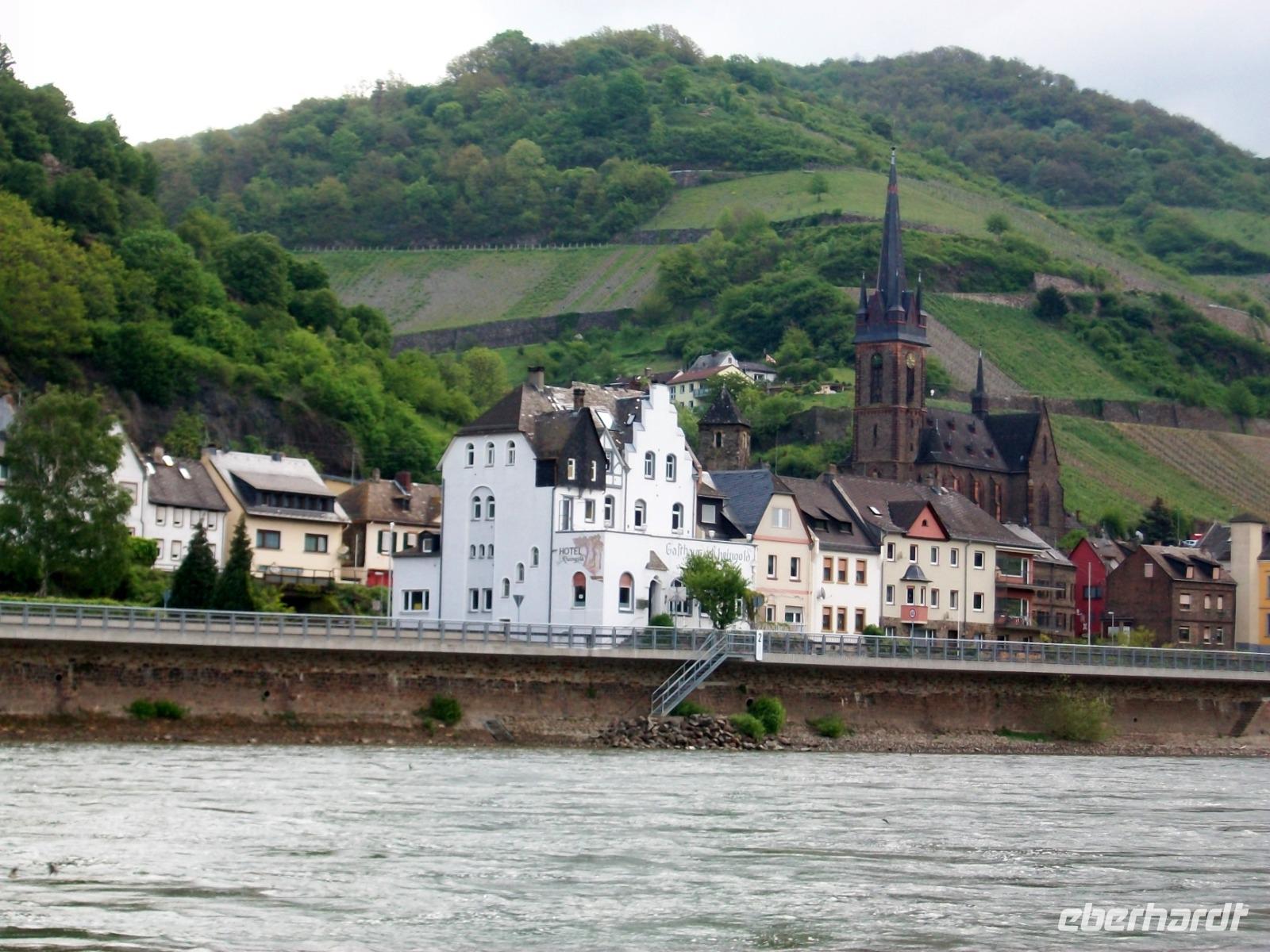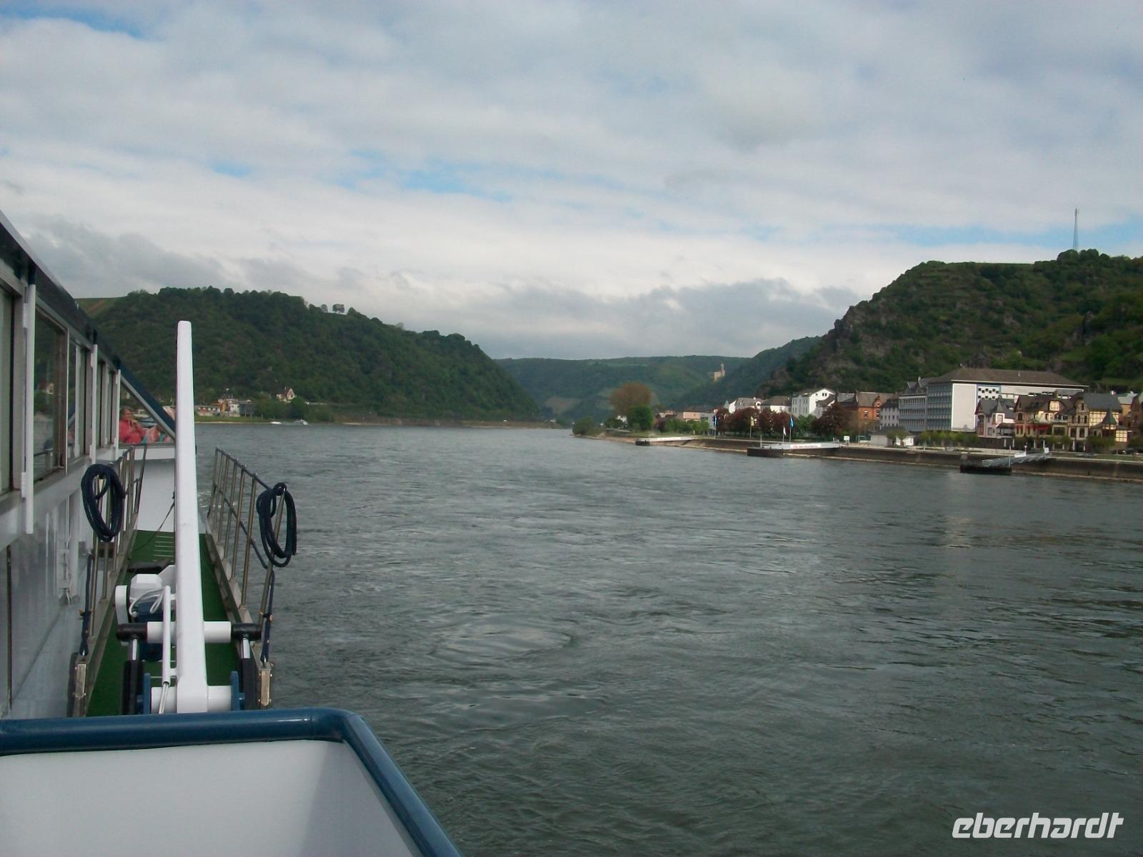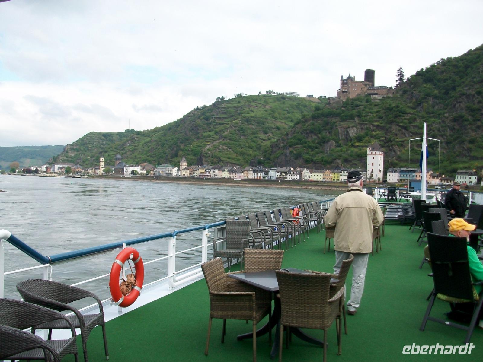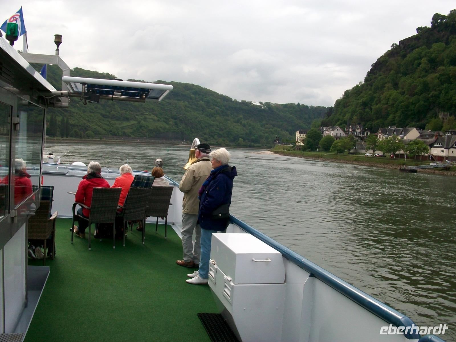 5.5.2019. Heute steht eine besonders schöne Fahrt auf dem Programm. Der Kapitän startet den Motor und bald schwenken wir von der Mosel wieder in den Rhein ein. Weiter flussaufwärts führt die Fahrt; bald kommt auf der rechten Seite die erste Burg in Sicht, das Schloss Stolzenfels. Auf der linken Seite sehen wir eine Flussmündung, es ist die Lahn die hier ihre Wasser in den Rhein bringt. Bald kommt links die Marksburg in Sicht, es ist die einzig unzerstörte Burg am Mittelrhein, denn die Franzosen zerstörten im 17. Jahrhundert hier doch so einiges. Gemütlich gleiten wir an den schönen Ortschaften vorbei, sehen die Weinberge und weitere Burgen in den Bergen. Dann kommen die Burgen Katz und Maus in Sicht, ein Schild zeigt wenig später den Kilometer 555 an, ein ganz großer Höhepunkt naht: die Lorelei. Sie sitzt doch tatsächlich am Flussufer und kämmt ihr „güldenes Haar". Der Blick geht hinauf zum berühmten Felsen während unser Kapitän an dieser gefährlichen Schmalstelle all sein Können zeigt. Zu den Klängen des Liedes passieren wir diesen Punkt; fast alle haben sich an Deck versammelt und lauschen den sentimentalen Klängen. Doch, weiter geht es, unser Ziel für heute heißt Rüdesheim und zuvor gibt es weitere Höhepunkte zu sehen. Als wir es uns beim Mittagessen so richtig schmecken lassen sehen wir oben auf dem Hang die Germania; das trutzige Niederwalddenkmal kündigt unser heutiges Ziel Rüdesheim an. Das Schiff wird festgemacht und die Vorfreude auf den nun vor uns liegenden Ausflug ist groß.