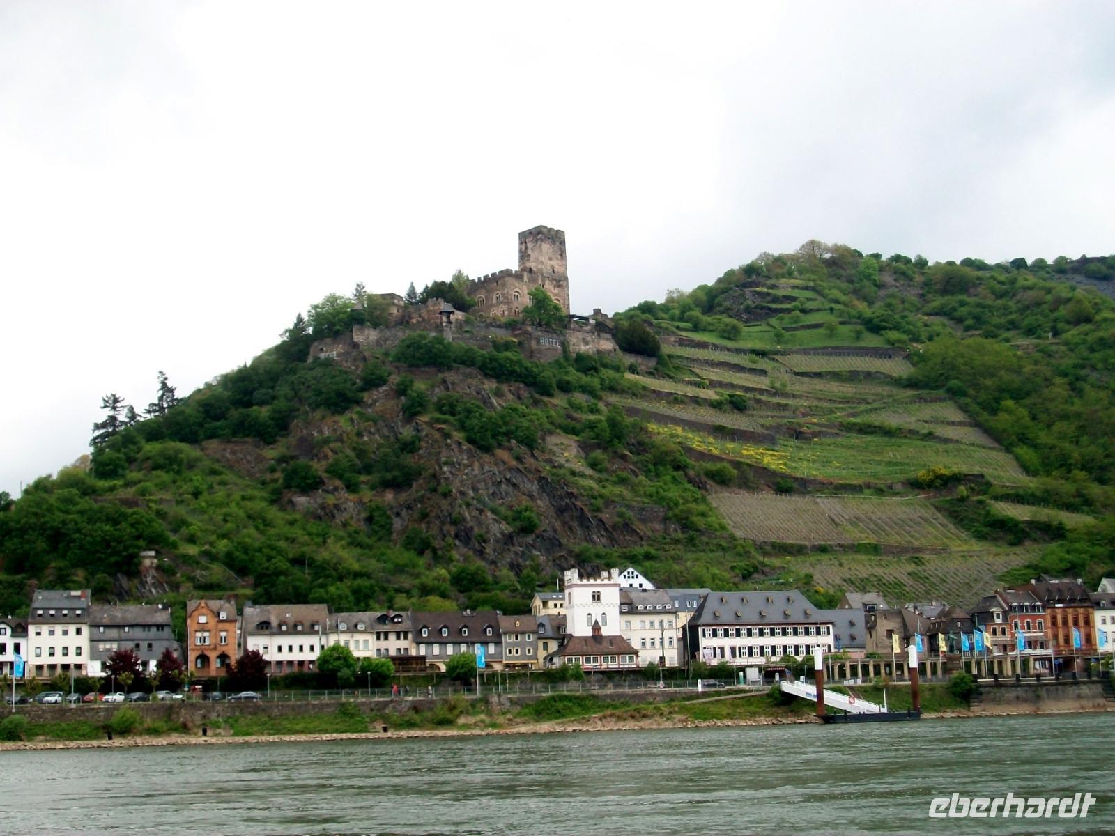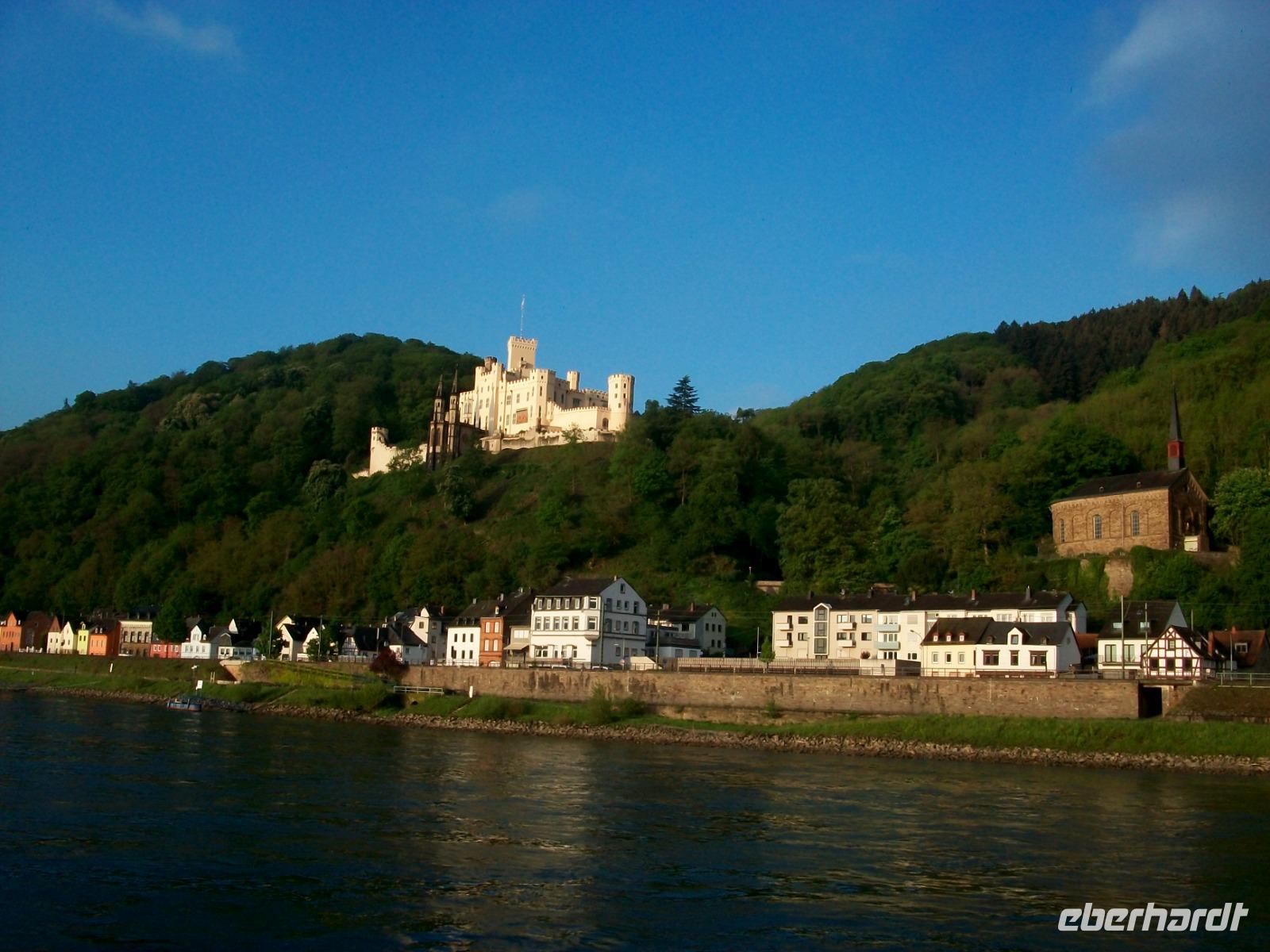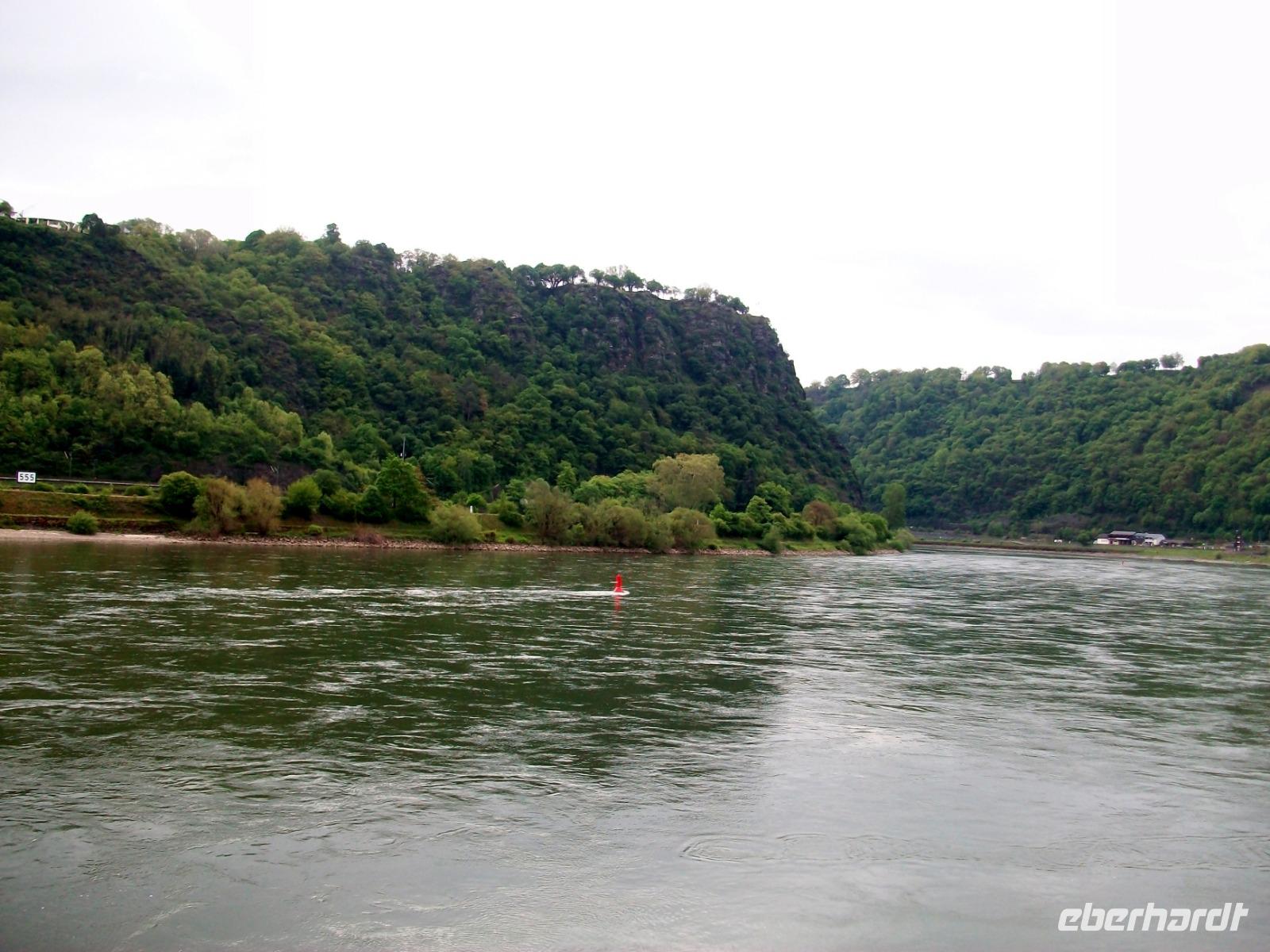 5.5.2019. Heute steht eine besonders schöne Fahrt auf dem Programm. Der Kapitän startet den Motor und bald schwenken wir von der Mosel wieder in den Rhein ein. Weiter flussaufwärts führt die Fahrt; bald kommt auf der rechten Seite die erste Burg in Sicht, das Schloss Stolzenfels. Auf der linken Seite sehen wir eine Flussmündung, es ist die Lahn die hier ihre Wasser in den Rhein bringt. Bald kommt links die Marksburg in Sicht, es ist die einzig unzerstörte Burg am Mittelrhein, denn die Franzosen zerstörten im 17. Jahrhundert hier doch so einiges. Gemütlich gleiten wir an den schönen Ortschaften vorbei, sehen die Weinberge und weitere Burgen in den Bergen. Dann kommen die Burgen Katz und Maus in Sicht, ein Schild zeigt wenig später den Kilometer 555 an, ein ganz großer Höhepunkt naht: die Lorelei. Sie sitzt doch tatsächlich am Flussufer und kämmt ihr „güldenes Haar". Der Blick geht hinauf zum berühmten Felsen während unser Kapitän an dieser gefährlichen Schmalstelle all sein Können zeigt. Zu den Klängen des Liedes passieren wir diesen Punkt; fast alle haben sich an Deck versammelt und lauschen den sentimentalen Klängen. Doch, weiter geht es, unser Ziel für heute heißt Rüdesheim und zuvor gibt es weitere Höhepunkte zu sehen. Als wir es uns beim Mittagessen so richtig schmecken lassen sehen wir oben auf dem Hang die Germania; das trutzige Niederwalddenkmal kündigt unser heutiges Ziel Rüdesheim an. Das Schiff wird festgemacht und die Vorfreude auf den nun vor uns liegenden Ausflug ist groß.