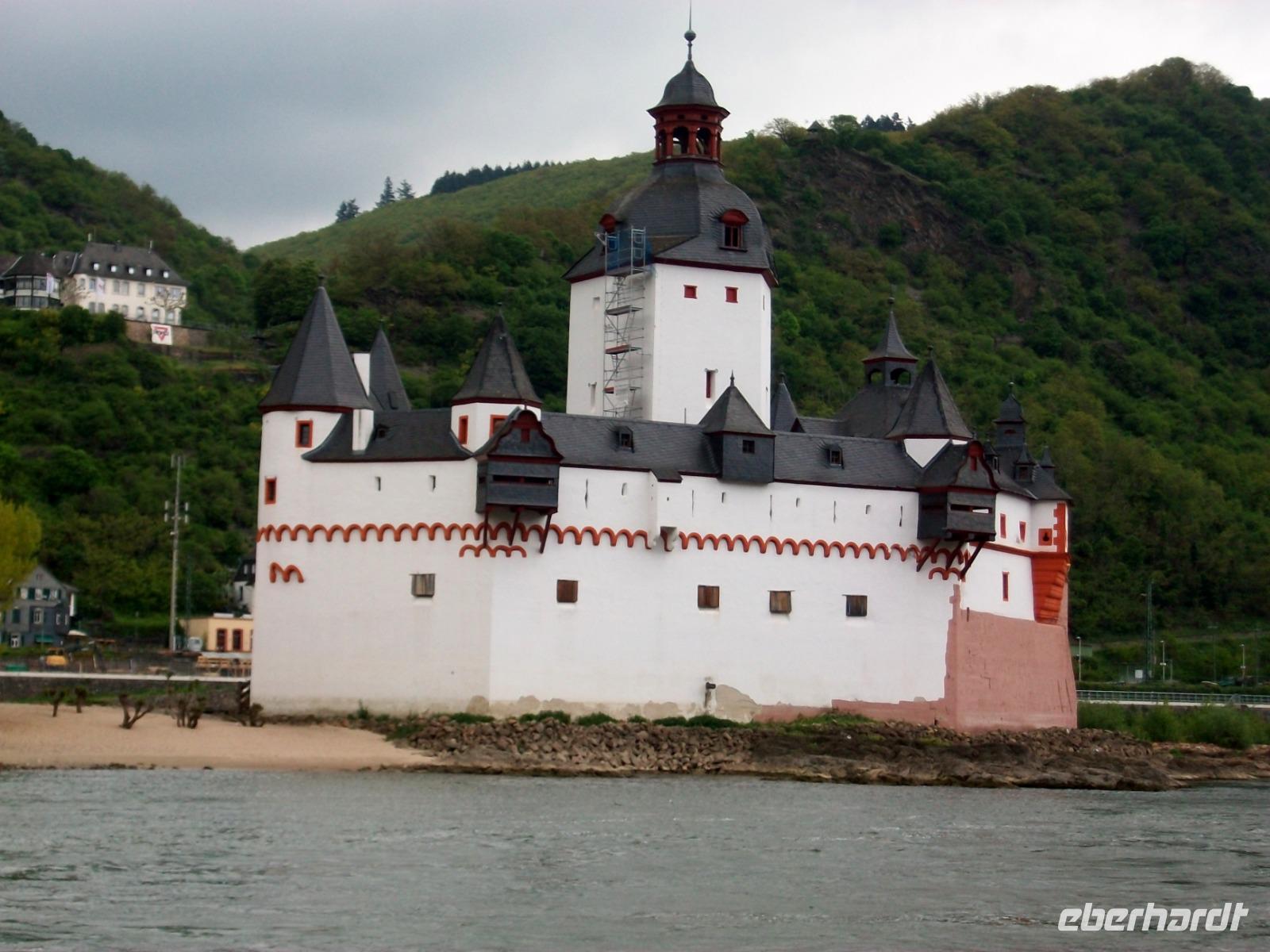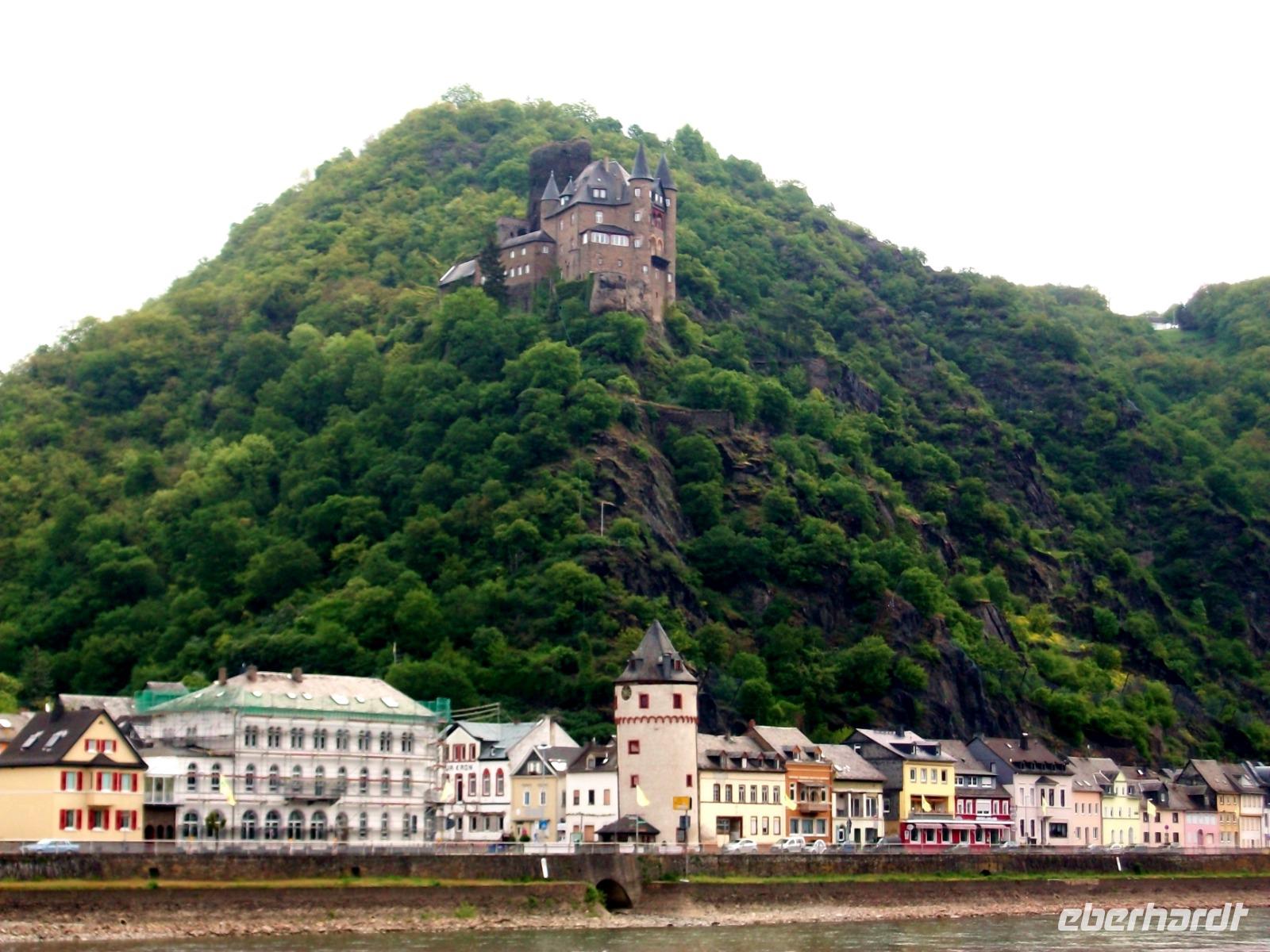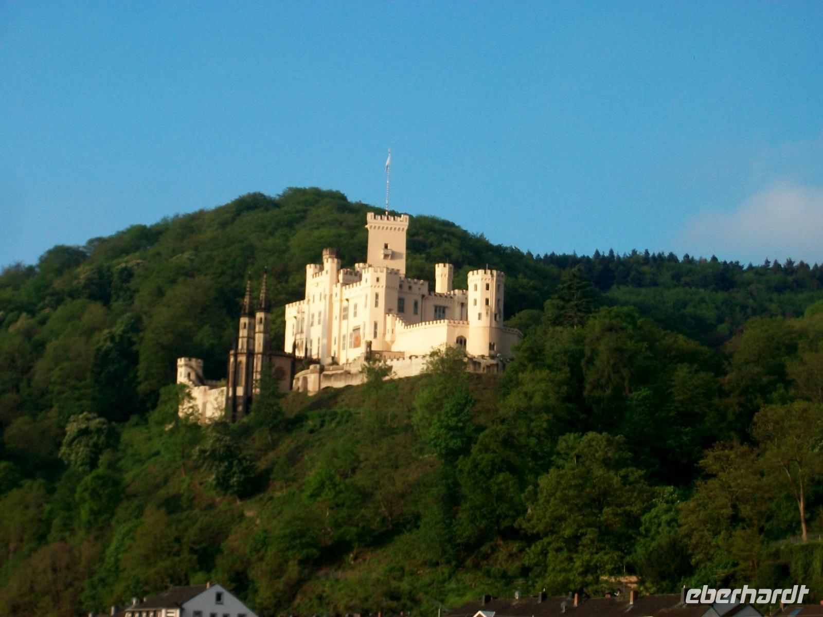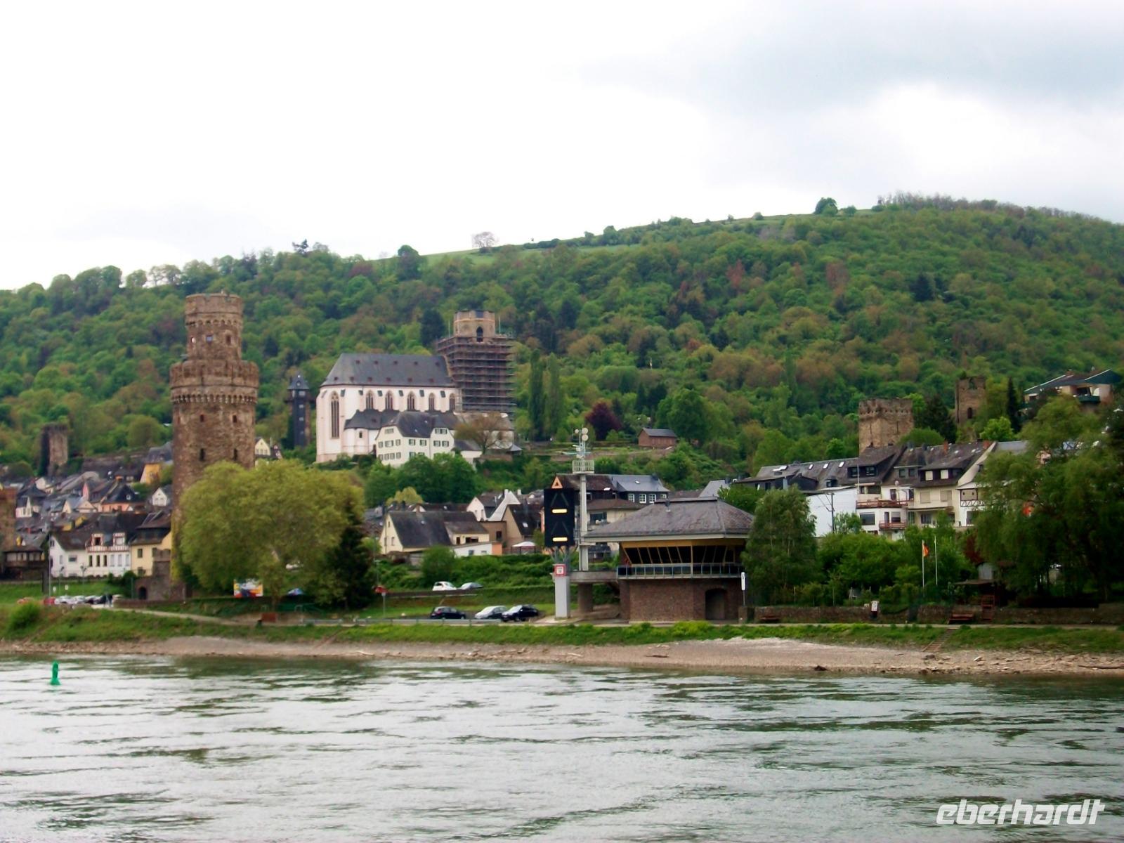5.5.2019. Heute steht eine besonders schöne Fahrt auf dem Programm. Der Kapitän startet den Motor und bald schwenken wir von der Mosel wieder in den Rhein ein. Weiter flussaufwärts führt die Fahrt; bald kommt auf der rechten Seite die erste Burg in Sicht, das Schloss Stolzenfels. Auf der linken Seite sehen wir eine Flussmündung, es ist die Lahn die hier ihre Wasser in den Rhein bringt. Bald kommt links die Marksburg in Sicht, es ist die einzig unzerstörte Burg am Mittelrhein, denn die Franzosen zerstörten im 17. Jahrhundert hier doch so einiges. Gemütlich gleiten wir an den schönen Ortschaften vorbei, sehen die Weinberge und weitere Burgen in den Bergen. Dann kommen die Burgen Katz und Maus in Sicht, ein Schild zeigt wenig später den Kilometer 555 an, ein ganz großer Höhepunkt naht: die Lorelei. Sie sitzt doch tatsächlich am Flussufer und kämmt ihr „güldenes Haar". Der Blick geht hinauf zum berühmten Felsen während unser Kapitän an dieser gefährlichen Schmalstelle all sein Können zeigt. Zu den Klängen des Liedes passieren wir diesen Punkt; fast alle haben sich an Deck versammelt und lauschen den sentimentalen Klängen. Doch, weiter geht es, unser Ziel für heute heißt Rüdesheim und zuvor gibt es weitere Höhepunkte zu sehen. Als wir es uns beim Mittagessen so richtig schmecken lassen sehen wir oben auf dem Hang die Germania; das trutzige Niederwalddenkmal kündigt unser heutiges Ziel Rüdesheim an. Das Schiff wird festgemacht und die Vorfreude auf den nun vor uns liegenden Ausflug ist groß.