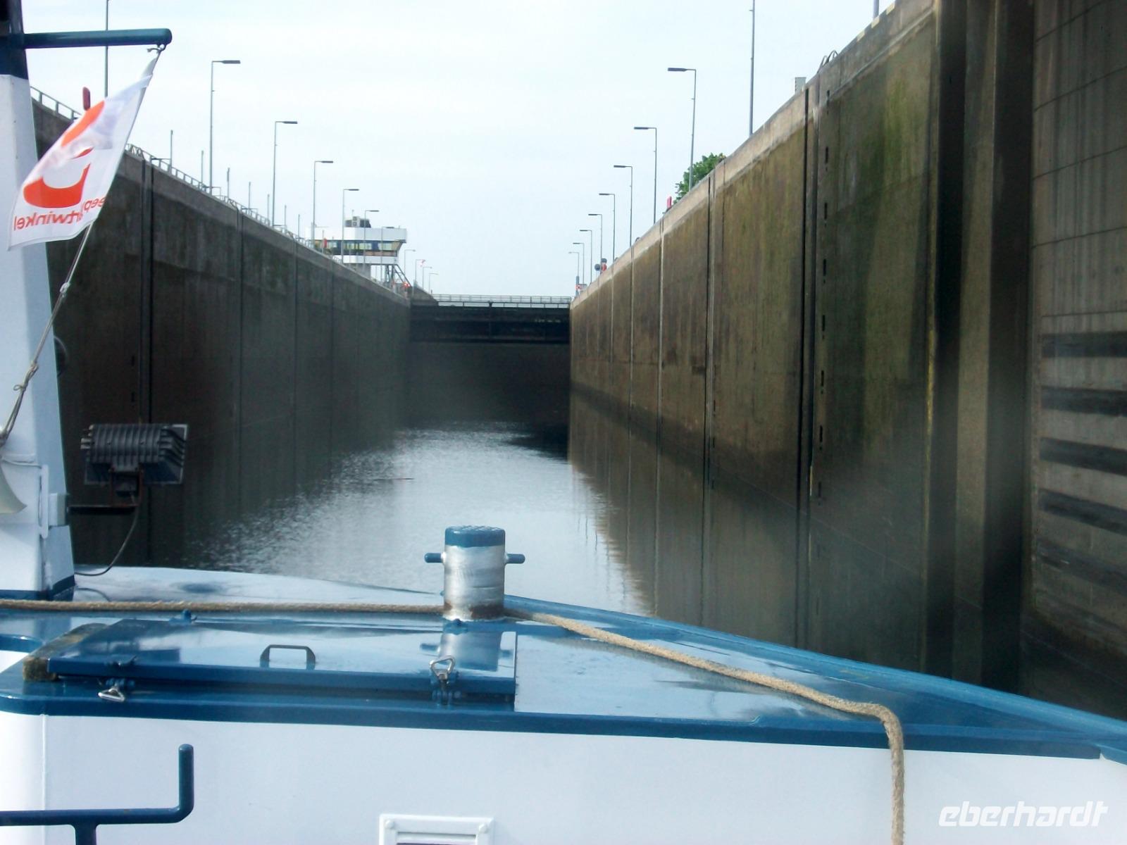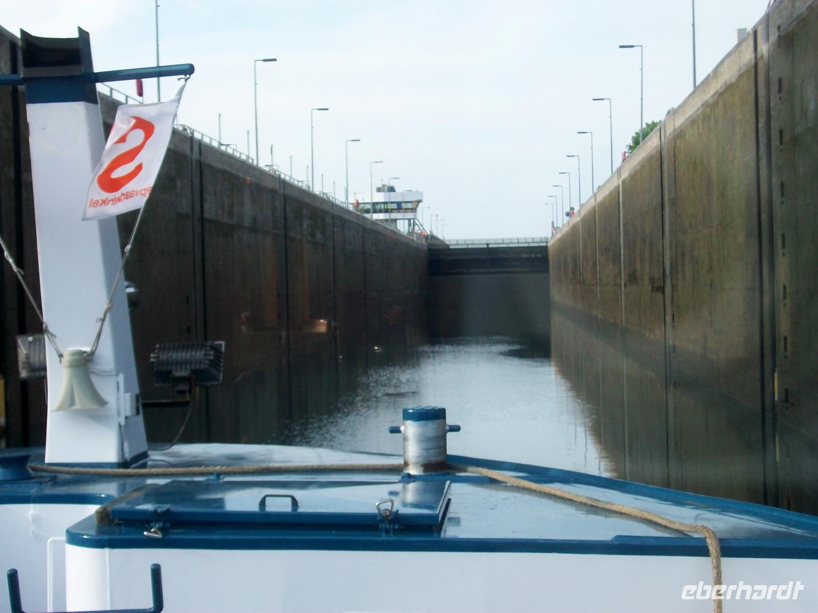 3.5.2019. Wir gelangen über Nacht vom Amsterdam - Rhein - Kanal in den Rhein selbst. Eine Schleuse hebt uns hinauf und weiter geht die Fahrt. Mit sicherer Hand steuert Kapitän Marco das Schiff durch die Nacht während wir in unseren Betten im Reich der Träume liegen.