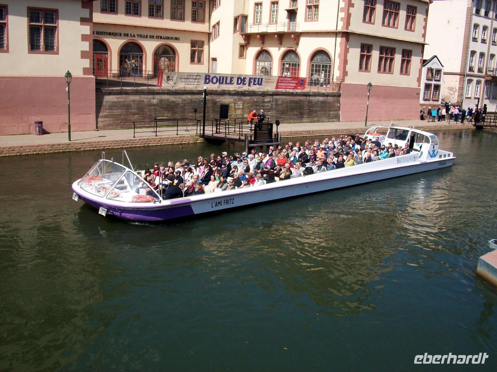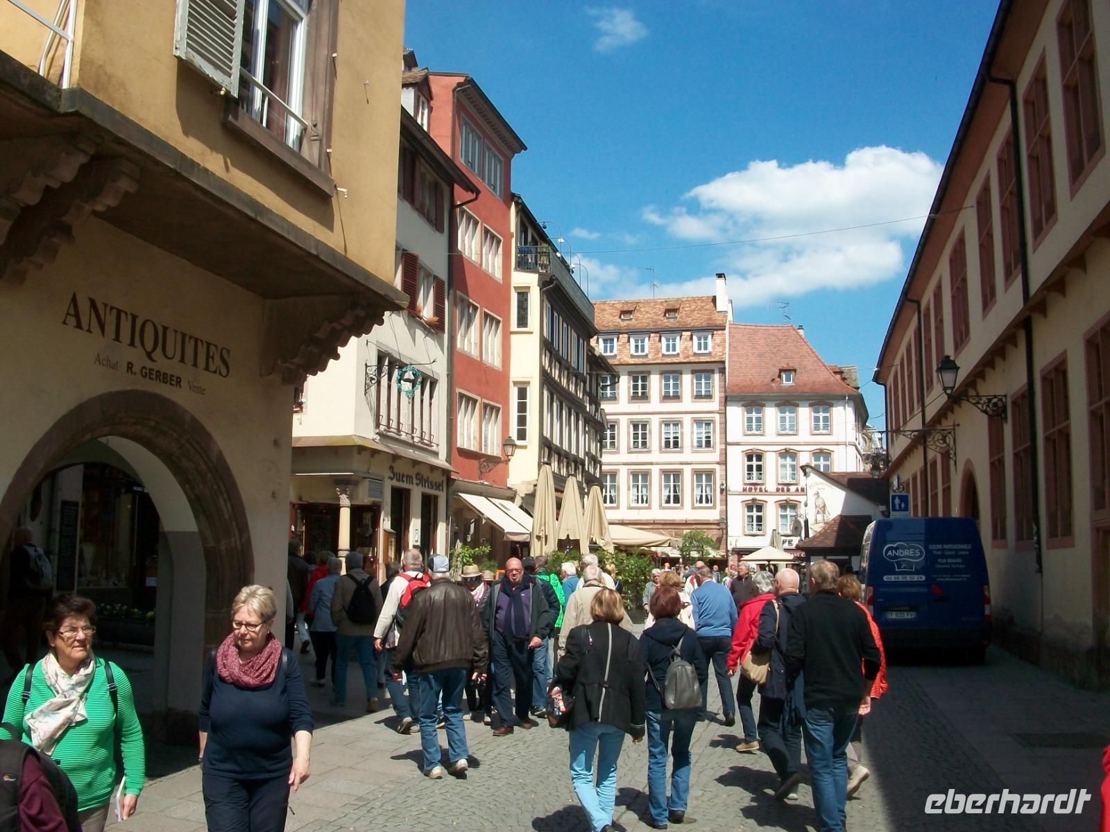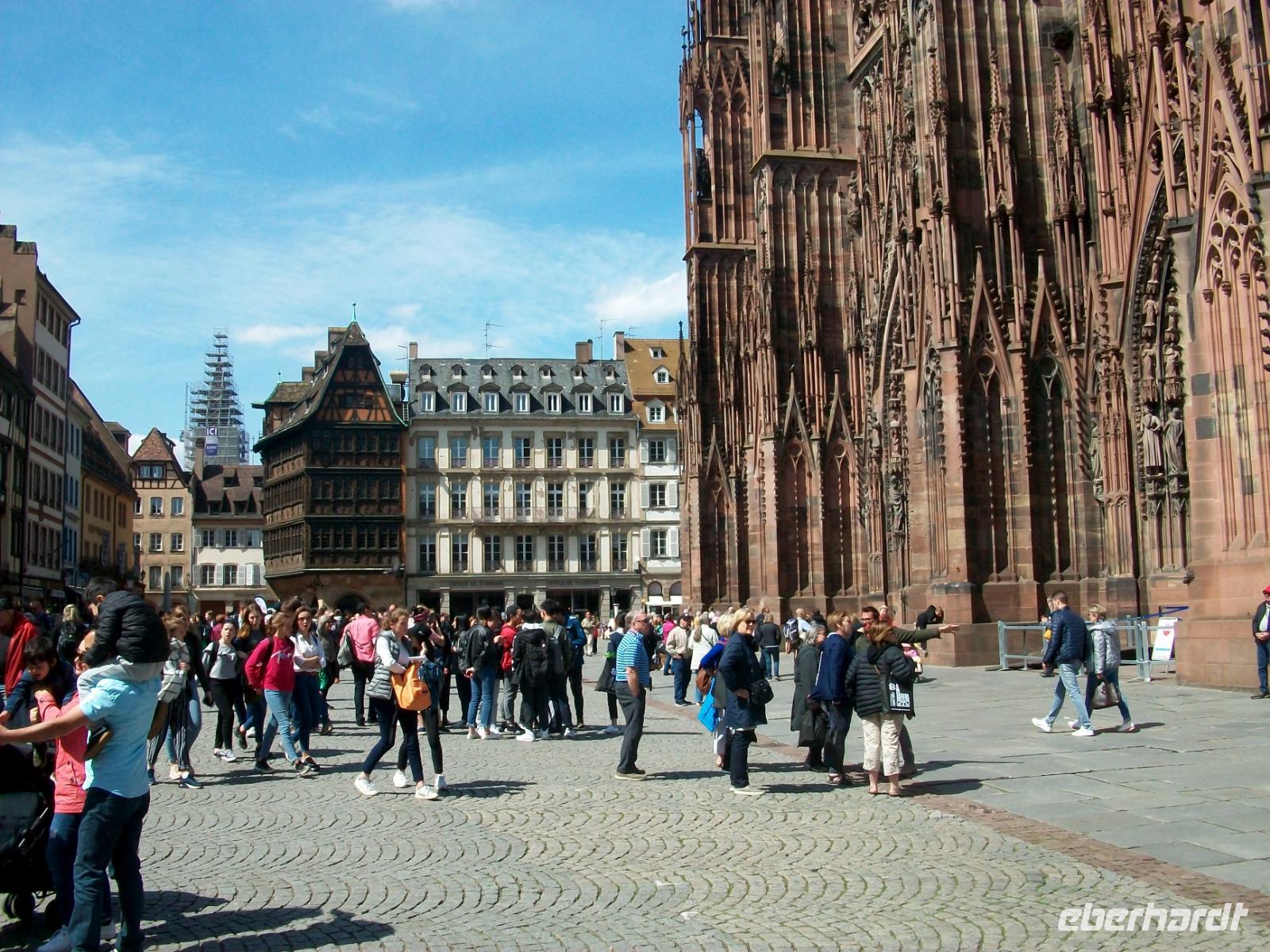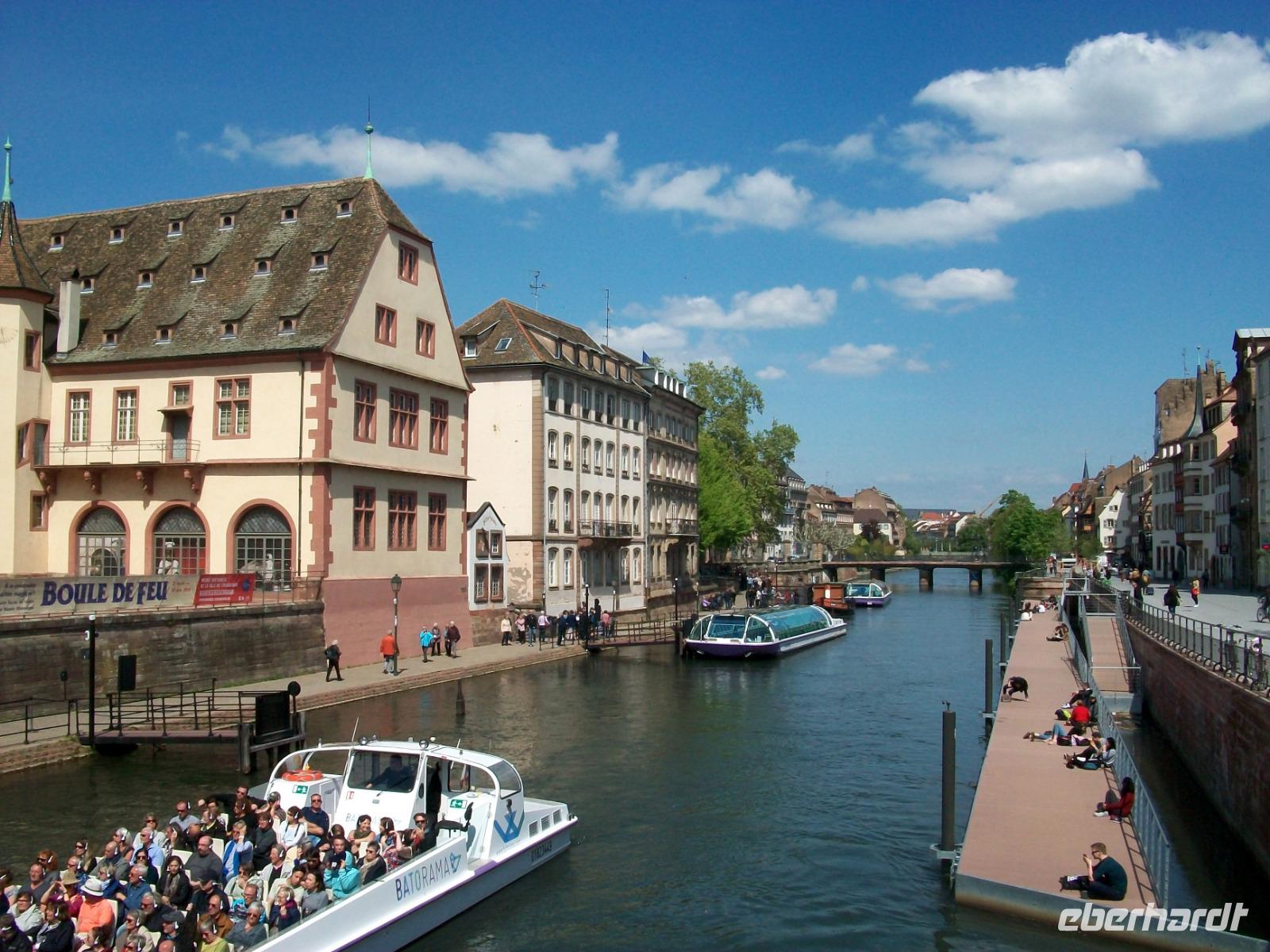 Wenig später sind wir zu Fuß unterwegs um die Historie von Strasbourg zu erkunden. Von überall ist der mächtige Turm des Münsters zu sehen; diesem schönen Gotteshaus gilt unser nächster Besuch. Entlang einer wunderschönen Fachwerkarchitektur gelangen wir dorthin, und ganz wichtig: Die Sonne strahlt was sie kann. Danach steht ein besonderes Erlebnis auf dem Programm, eine Schifffahrt auf der Ill; dieser Fluss durchzieht die Stadt die wir nun noch einmal aus völlig ungewohnter Perspektive betrachten können.
