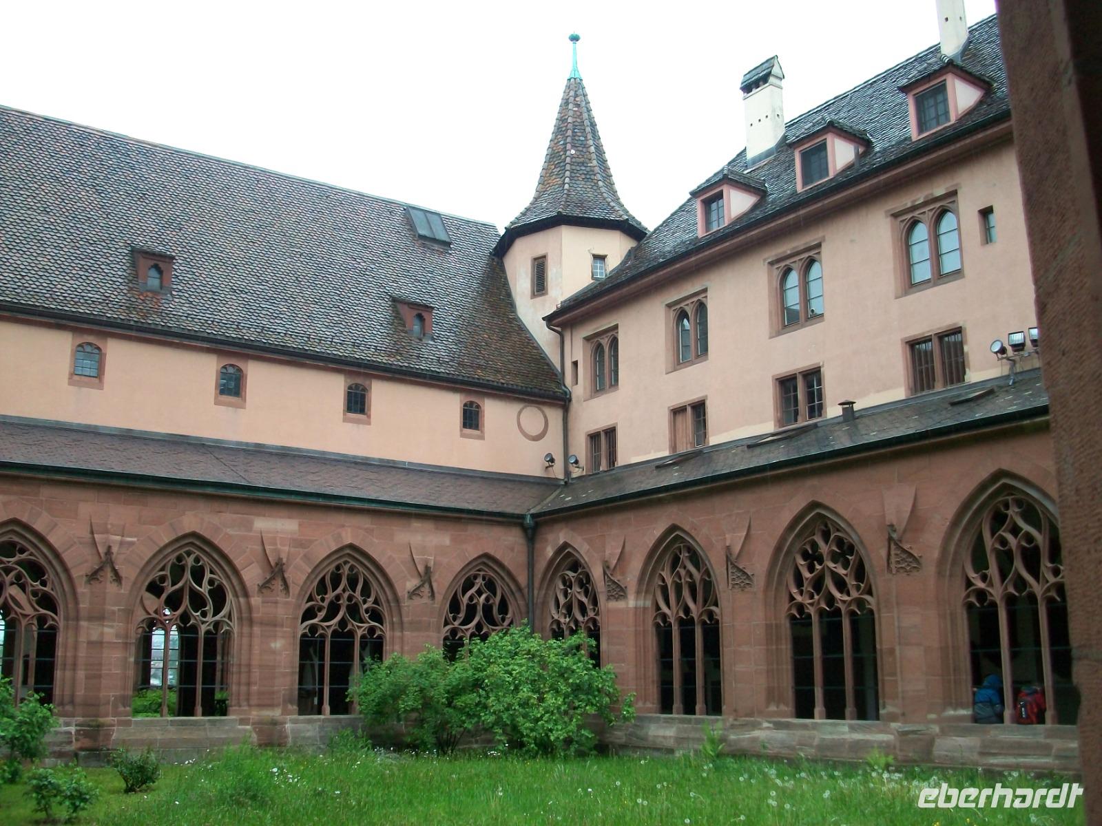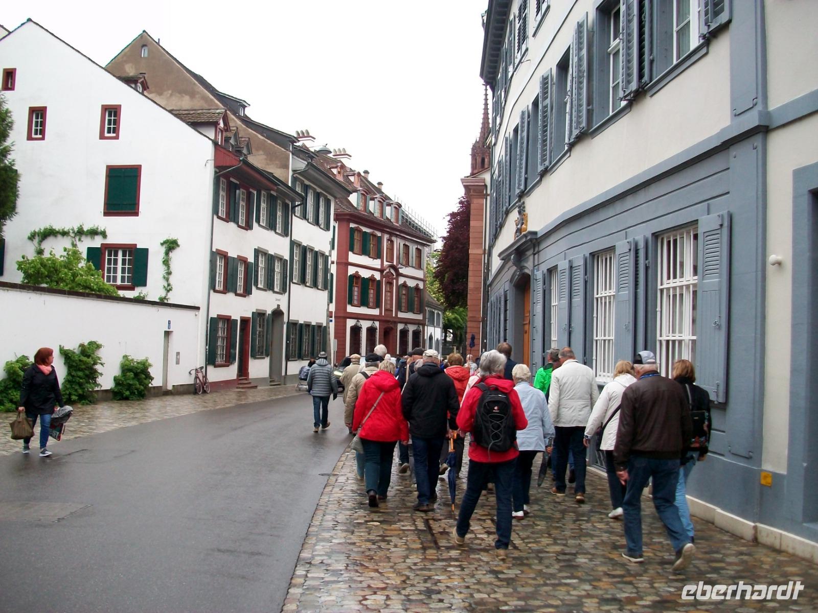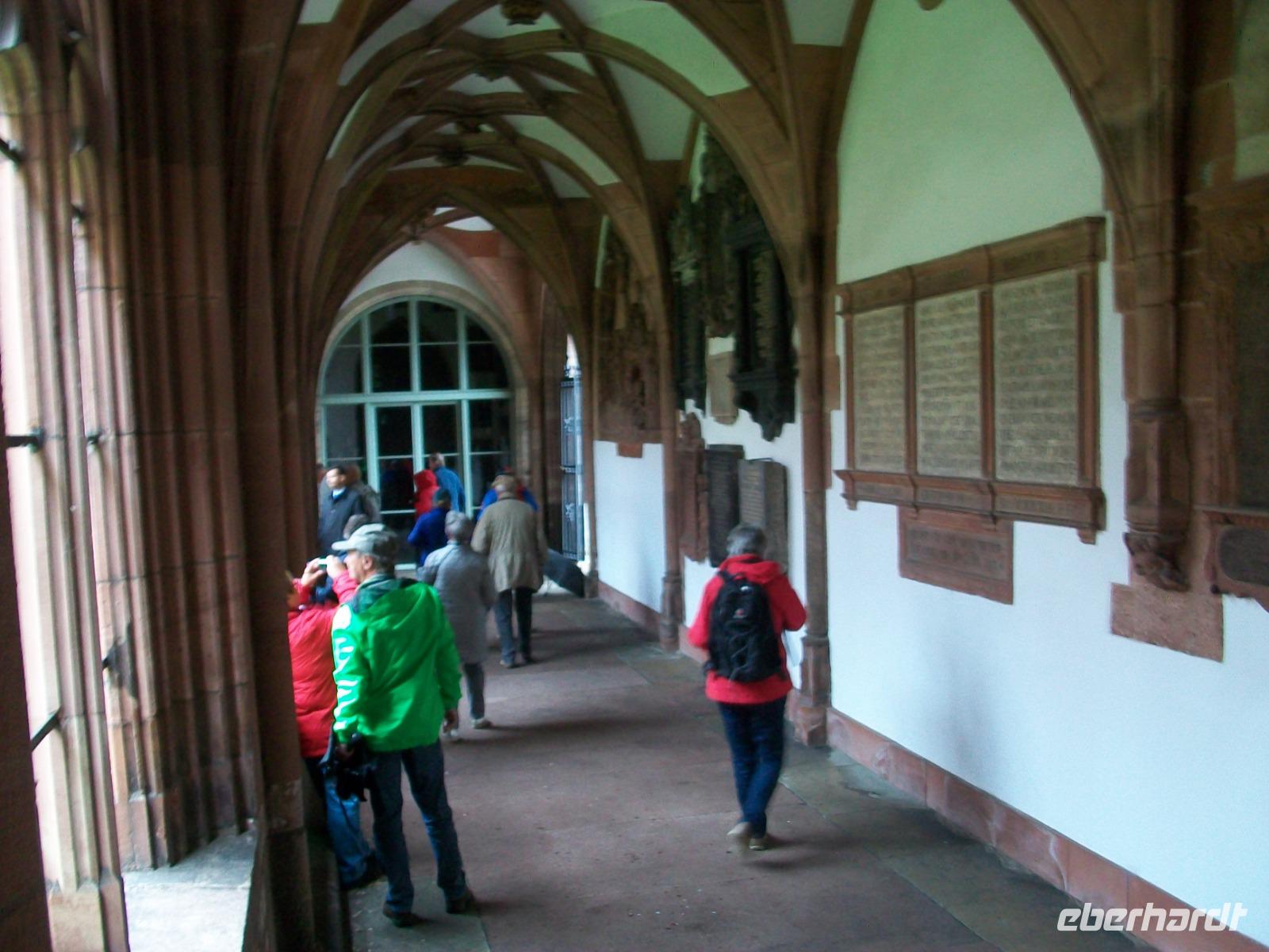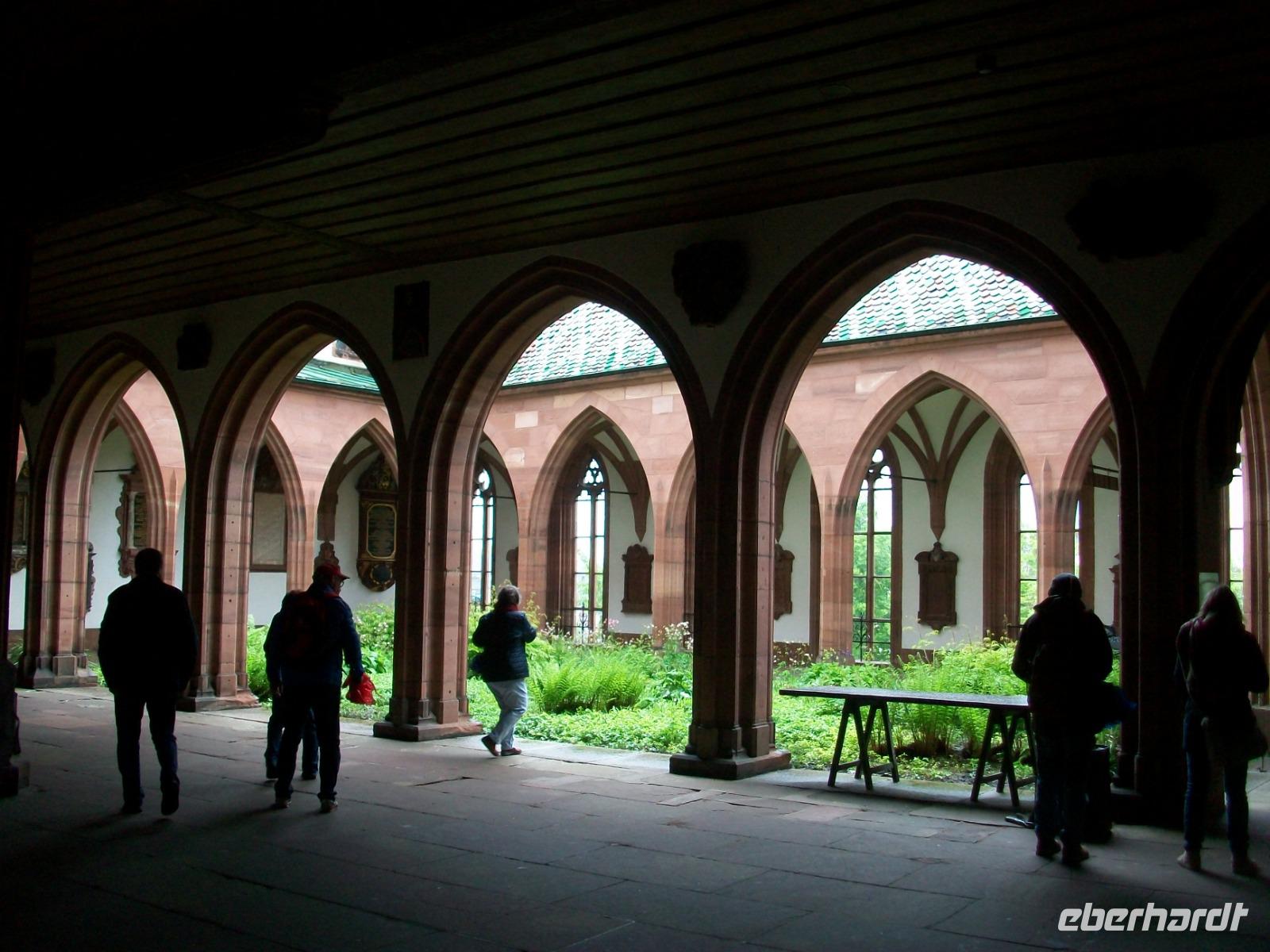 Heute hat Petrus den Himmel wieder mit Wolken überzogen, mal schauen wie das Wetter sich gestaltet. Unser Ziel ist Basel und somit werden wir heute auf Schweizer Boden gelangen. Auf französischer Seite sind einige Industrieanlagen zu sehen, bald jedoch langen wir am Anleger St. Johann an, wir haben unser Ziel erreicht. Hier endet nun schließlich unsere Schifffahrt auf dem Rhein, aber eine letzte schöne Stadt steht noch auf dem Programm. Nur Petrus spielt nicht mit; als wir mit den Bussen in Basel auf Rundfahrt sind regnet es leicht. Dennoch erfahren wir sehr viel über diese sehenswerte Stadt. Wir sehen von Basel auch die Moderne die geprägt ist von Handel und Industrie; als wir uns jedoch zu Fuß aufmachen, dringen wir in die Historie der Stadt ein. Bald kommt das mächtige Münster in unser Blickfeld; wir gelangen durch den schönen Kreuzgang in das Innere und unsere Führerin aus Basel hat einige interessante Fakten zu diesem beeindruckenden Gotteshaus zu bieten.