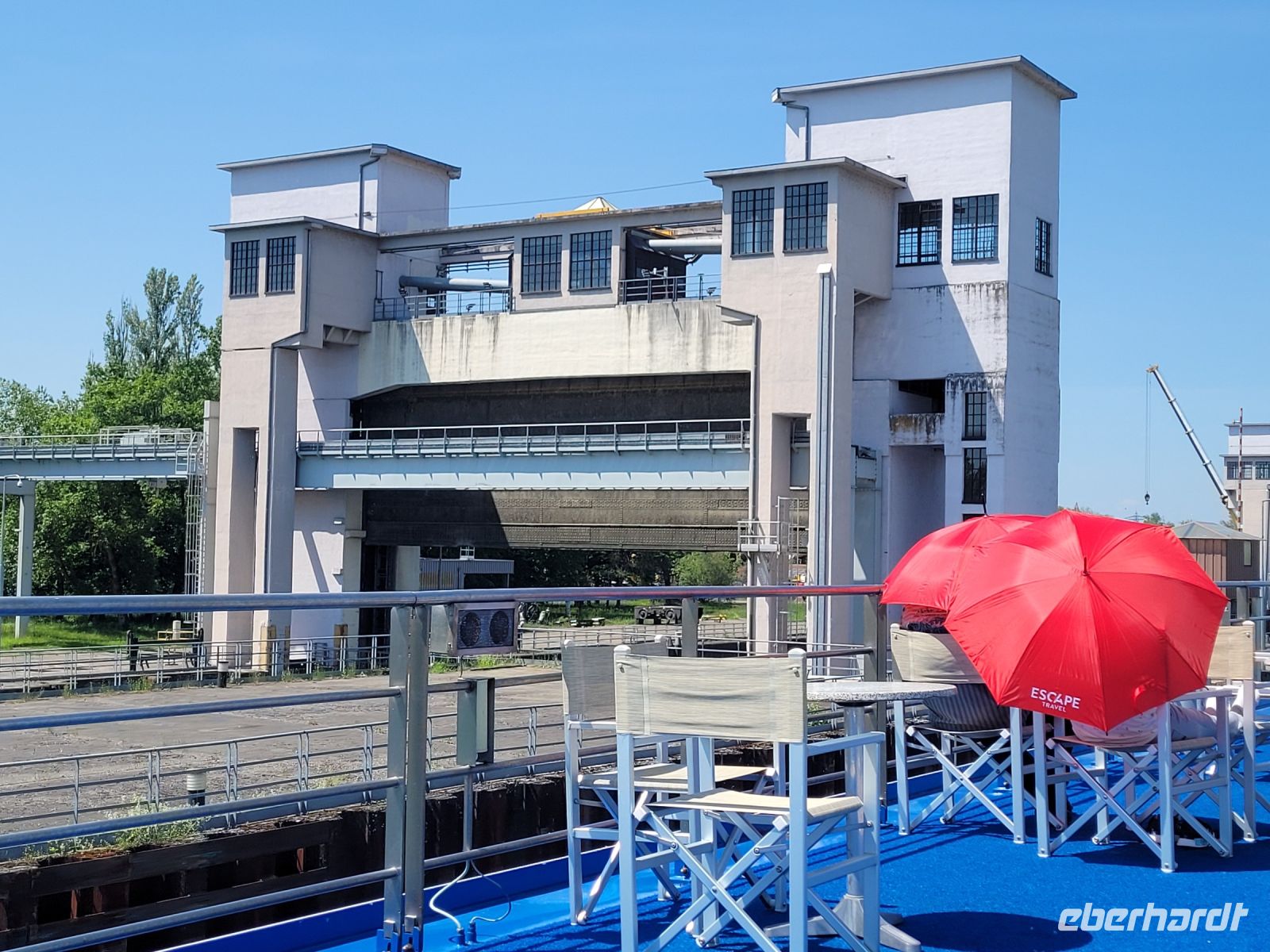 Unser Schiffhatte abgelegt und wir fuhren weiter in Richtung Speyer. Vor der Schleuse Iffzenheim gab es leichten Stau. Man wartete, bis sich insgesamt 4 Boote gesammelt hatten. Der Schleusenvorgang war faszinierend für uns Landratten!