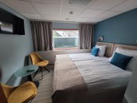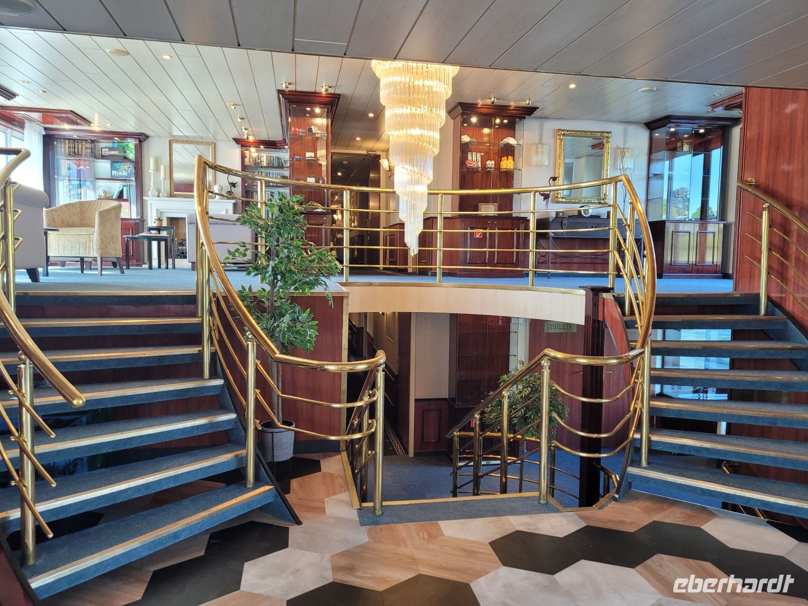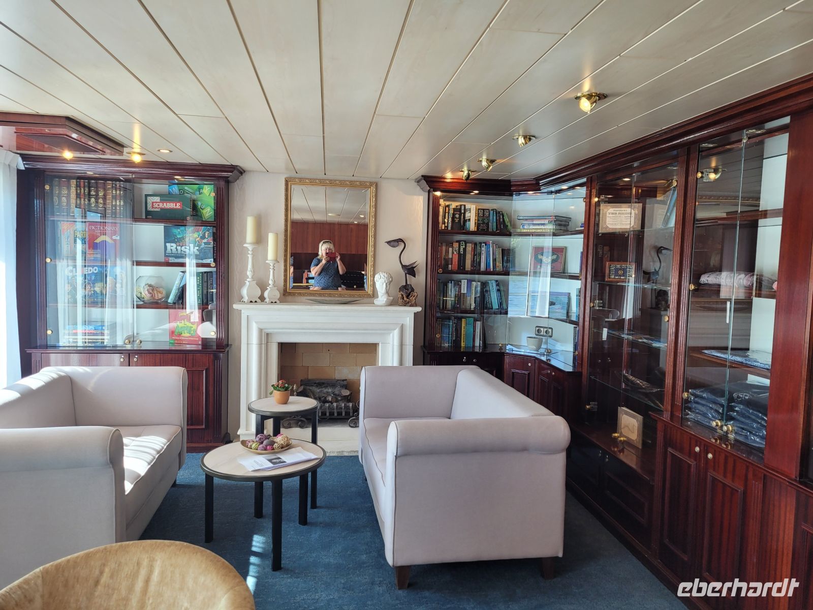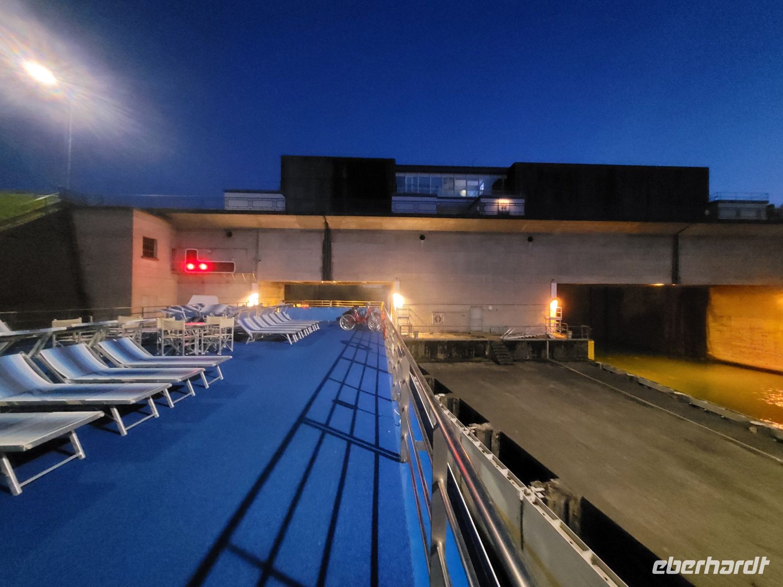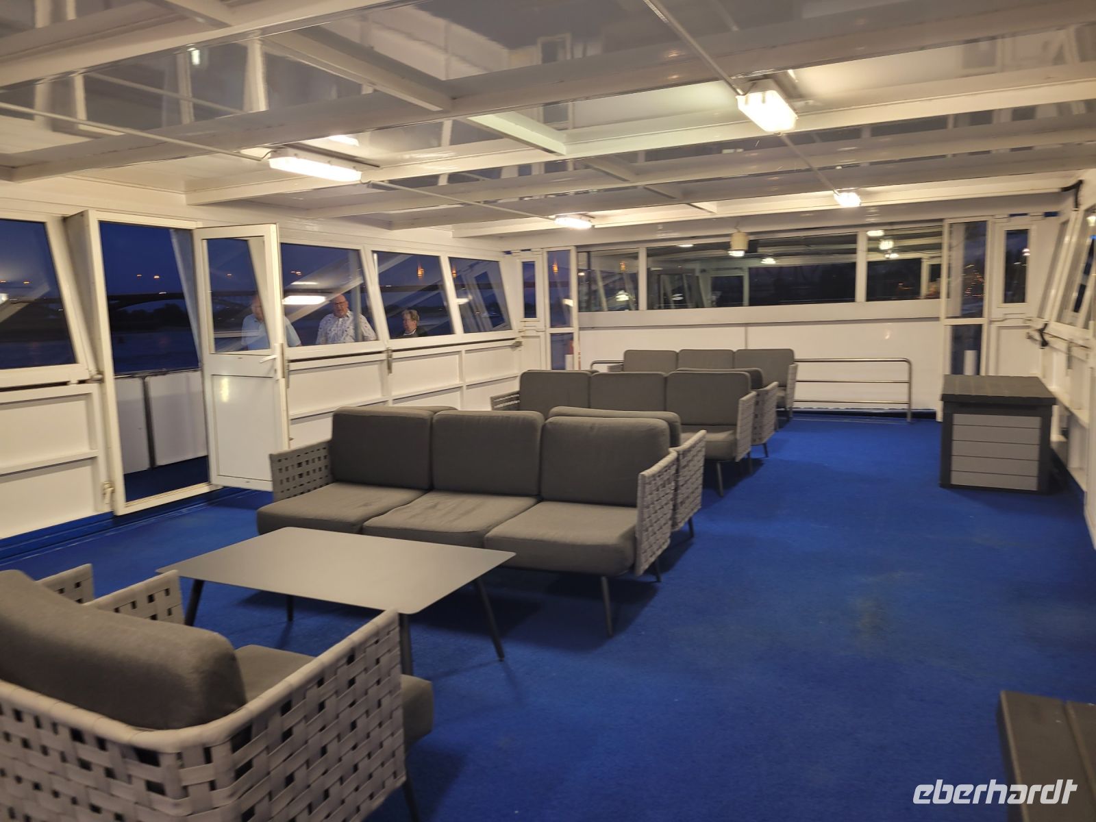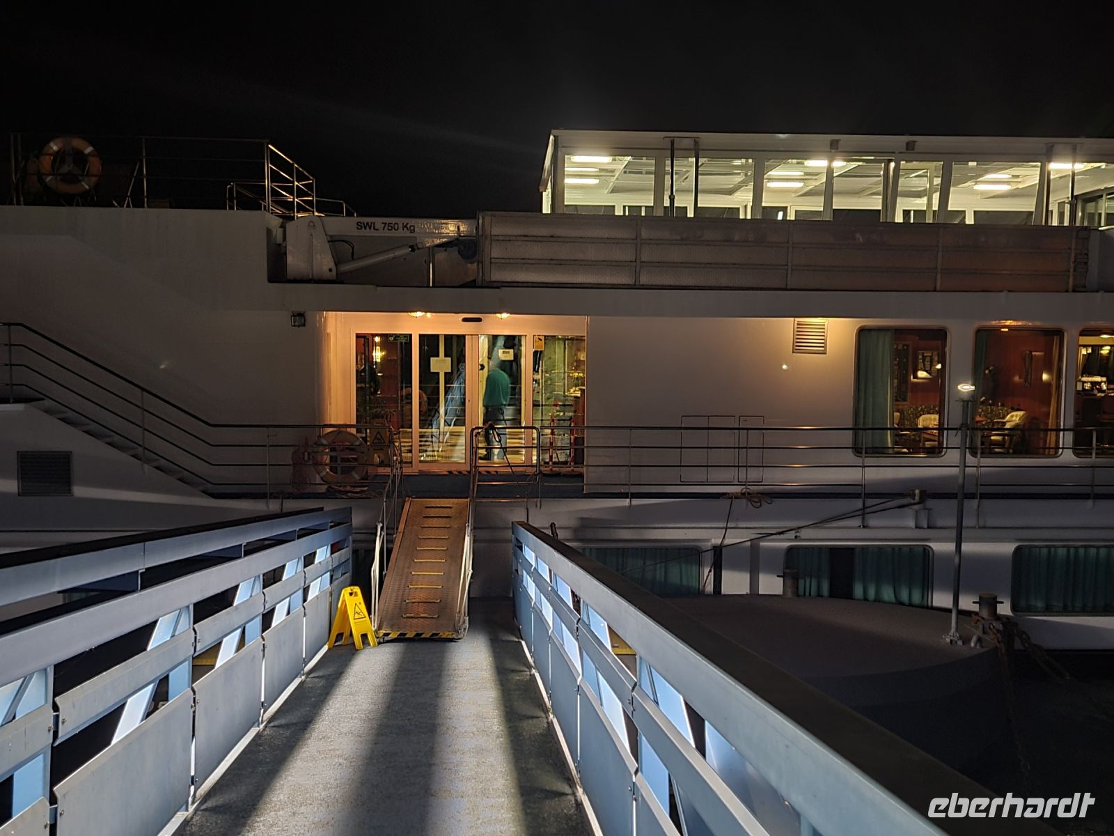 Gegen 17.30 endeten wir vorm Terminal in St. Johann am Steiger 2 und gingen an Bord der MS Aurora, wo uns Steffi (unsere Reisebegleiterin) schon angemeldet hatte. Die Crew brachte die Koffer auf die Kabinen. Im Salon stand eine kleine Stärkung bereit. Nachdem der Kapitän Marco uns mit seiner Crew und den Besonderheiten an Bord vertraut gemacht hatte, gab es für jeden ein Gläschen Sekt.